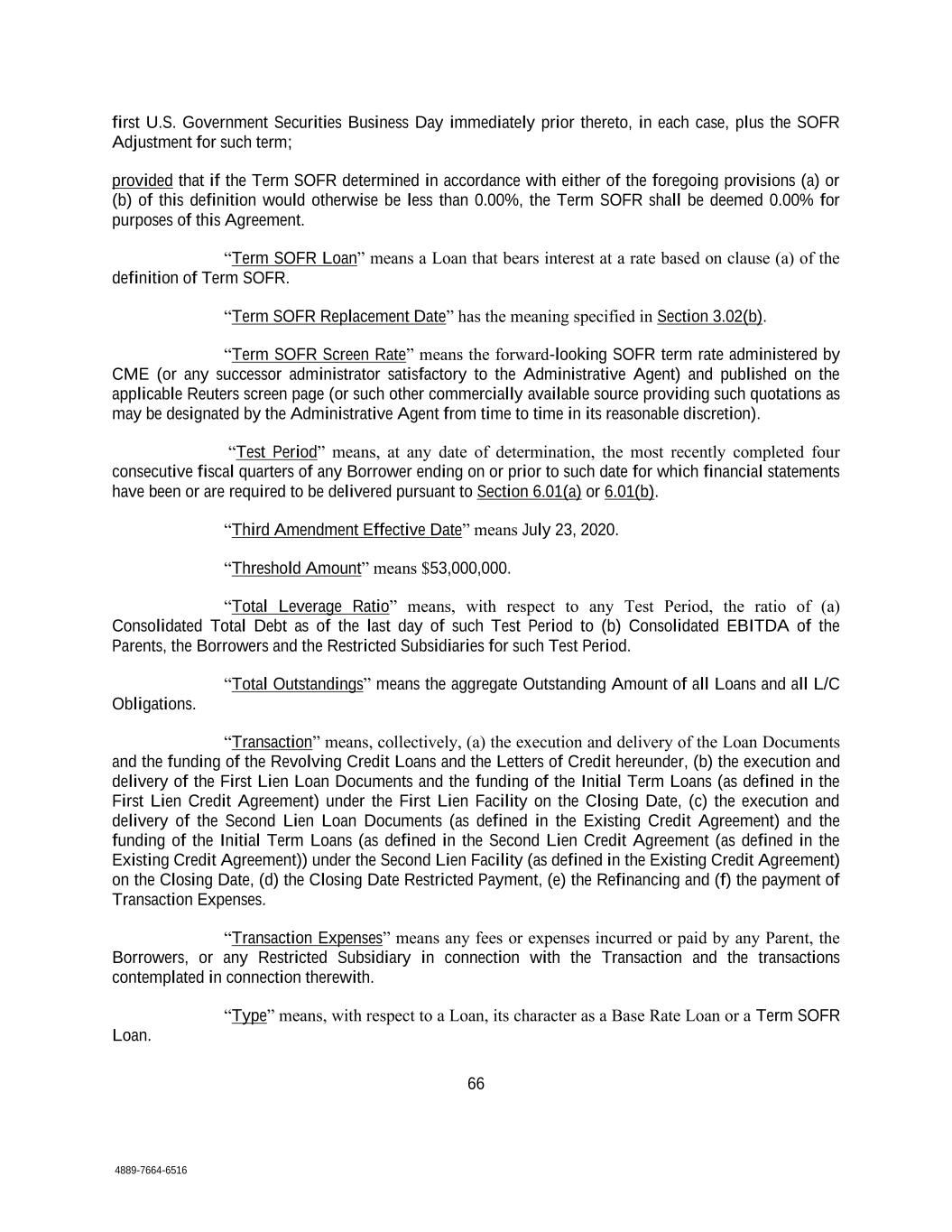 66 4889-7664-6516 first U.S. Government Securities Business Day immediately prior thereto, in each case, plus the SOFR Adjustment for such term; provided that if the Term SOFR determined in accordance with either of the foregoing provisions (a) or (b) of this definition would otherwise be less than 0.00%, the Term SOFR shall be deemed 0.00% for purposes of this Agreement. “Term SOFR Loan” means a Loan that bears interest at a rate based on clause (a) of the definition of Term SOFR. “Term SOFR Replacement Date” has the meaning specified in Section 3.02(b). “Term SOFR Screen Rate” means the forward-looking SOFR term rate administered by CME (or any successor administrator satisfactory to the Administrative Agent) and published on the applicable Reuters screen page (or such other commercially available source providing such quotations as may be designated by the Administrative Agent from time to time in its reasonable discretion). “Test Period” means, at any date of determination, the most recently completed four consecutive fiscal quarters of any Borrower ending on or prior to such date for which financial statements have been or are required to be delivered pursuant to Section 6.01(a) or 6.01(b). “Third Amendment Effective Date” means July 23, 2020. “Threshold Amount” means $53,000,000. “Total Leverage Ratio” means, with respect to any Test Period, the ratio of (a) Consolidated Total Debt as of the last day of such Test Period to (b) Consolidated EBITDA of the Parents, the Borrowers and the Restricted Subsidiaries for such Test Period. “Total Outstandings” means the aggregate Outstanding Amount of all Loans and all L/C Obligations. “Transaction” means, collectively, (a) the execution and delivery of the Loan Documents and the funding of the Revolving Credit Loans and the Letters of Credit hereunder, (b) the execution and delivery of the First Lien Loan Documents and the funding of the Initial Term Loans (as defined in the First Lien Credit Agreement) under the First Lien Facility on the Closing Date, (c) the execution and delivery of the Second Lien Loan Documents (as defined in the Existing Credit Agreement) and the funding of the Initial Term Loans (as defined in the Second Lien Credit Agreement (as defined in the Existing Credit Agreement)) under the Second Lien Facility (as defined in the Existing Credit Agreement) on the Closing Date, (d) the Closing Date Restricted Payment, (e) the Refinancing and (f) the payment of Transaction Expenses. “Transaction Expenses” means any fees or expenses incurred or paid by any Parent, the Borrowers, or any Restricted Subsidiary in connection with the Transaction and the transactions contemplated in connection therewith. “Type” means, with respect to a Loan, its character as a Base Rate Loan or a Term SOFR Loan.