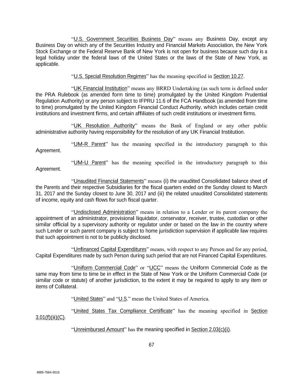 67 4889-7664-6516 “U.S. Government Securities Business Day” means any Business Day, except any Business Day on which any of the Securities Industry and Financial Markets Association, the New York Stock Exchange or the Federal Reserve Bank of New York is not open for business because such day is a legal holiday under the federal laws of the United States or the laws of the State of New York, as applicable. “U.S. Special Resolution Regimes” has the meaning specified in Section 10.27. “UK Financial Institution” means any BRRD Undertaking (as such term is defined under the PRA Rulebook (as amended form time to time) promulgated by the United Kingdom Prudential Regulation Authority) or any person subject to IFPRU 11.6 of the FCA Handbook (as amended from time to time) promulgated by the United Kingdom Financial Conduct Authority, which includes certain credit institutions and investment firms, and certain affiliates of such credit institutions or investment firms. “UK Resolution Authority” means the Bank of England or any other public administrative authority having responsibility for the resolution of any UK Financial Institution. “UM-R Parent” has the meaning specified in the introductory paragraph to this Agreement. “UM-U Parent” has the meaning specified in the introductory paragraph to this Agreement. “Unaudited Financial Statements” means (i) the unaudited Consolidated balance sheet of the Parents and their respective Subsidiaries for the fiscal quarters ended on the Sunday closest to March 31, 2017 and the Sunday closest to June 30, 2017 and (ii) the related unaudited Consolidated statements of income, equity and cash flows for such fiscal quarter. “Undisclosed Administration” means in relation to a Lender or its parent company the appointment of an administrator, provisional liquidator, conservator, receiver, trustee, custodian or other similar official by a supervisory authority or regulator under or based on the law in the country where such Lender or such parent company is subject to home jurisdiction supervision if applicable law requires that such appointment is not to be publicly disclosed. “Unfinanced Capital Expenditures” means, with respect to any Person and for any period, Capital Expenditures made by such Person during such period that are not Financed Capital Expenditures. “Uniform Commercial Code” or “UCC” means the Uniform Commercial Code as the same may from time to time be in effect in the State of New York or the Uniform Commercial Code (or similar code or statute) of another jurisdiction, to the extent it may be required to apply to any item or items of Collateral. “United States” and “U.S.” mean the United States of America. “United States Tax Compliance Certificate” has the meaning specified in Section 3.01(f)(ii)(C). “Unreimbursed Amount” has the meaning specified in Section 2.03(c)(i).