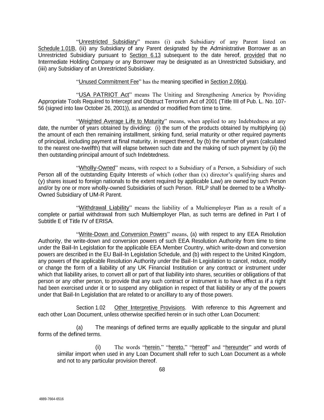 68 4889-7664-6516 “Unrestricted Subsidiary” means (i) each Subsidiary of any Parent listed on Schedule 1.01B, (ii) any Subsidiary of any Parent designated by the Administrative Borrower as an Unrestricted Subsidiary pursuant to Section 6.13 subsequent to the date hereof, provided that no Intermediate Holding Company or any Borrower may be designated as an Unrestricted Subsidiary, and (iii) any Subsidiary of an Unrestricted Subsidiary. “Unused Commitment Fee” has the meaning specified in Section 2.09(a). “USA PATRIOT Act” means The Uniting and Strengthening America by Providing Appropriate Tools Required to Intercept and Obstruct Terrorism Act of 2001 (Title III of Pub. L. No. 107- 56 (signed into law October 26, 2001)), as amended or modified from time to time. “Weighted Average Life to Maturity” means, when applied to any Indebtedness at any date, the number of years obtained by dividing: (i) the sum of the products obtained by multiplying (a) the amount of each then remaining installment, sinking fund, serial maturity or other required payments of principal, including payment at final maturity, in respect thereof, by (b) the number of years (calculated to the nearest one-twelfth) that will elapse between such date and the making of such payment by (ii) the then outstanding principal amount of such Indebtedness. “Wholly-Owned” means, with respect to a Subsidiary of a Person, a Subsidiary of such Person all of the outstanding Equity Interests of which (other than (x) director’s qualifying shares and (y) shares issued to foreign nationals to the extent required by applicable Law) are owned by such Person and/or by one or more wholly-owned Subsidiaries of such Person. RILP shall be deemed to be a Wholly- Owned Subsidiary of UM-R Parent. “Withdrawal Liability” means the liability of a Multiemployer Plan as a result of a complete or partial withdrawal from such Multiemployer Plan, as such terms are defined in Part I of Subtitle E of Title IV of ERISA. “Write-Down and Conversion Powers” means, (a) with respect to any EEA Resolution Authority, the write-down and conversion powers of such EEA Resolution Authority from time to time under the Bail-In Legislation for the applicable EEA Member Country, which write-down and conversion powers are described in the EU Bail-In Legislation Schedule, and (b) with respect to the United Kingdom, any powers of the applicable Resolution Authority under the Bail-In Legislation to cancel, reduce, modify or change the form of a liability of any UK Financial Institution or any contract or instrument under which that liability arises, to convert all or part of that liability into shares, securities or obligations of that person or any other person, to provide that any such contract or instrument is to have effect as if a right had been exercised under it or to suspend any obligation in respect of that liability or any of the powers under that Bail-In Legislation that are related to or ancillary to any of those powers. Section 1.02 Other Interpretive Provisions. With reference to this Agreement and each other Loan Document, unless otherwise specified herein or in such other Loan Document: (a) The meanings of defined terms are equally applicable to the singular and plural forms of the defined terms. (i) The words “herein,” “hereto,” “hereof” and “hereunder” and words of similar import when used in any Loan Document shall refer to such Loan Document as a whole and not to any particular provision thereof.