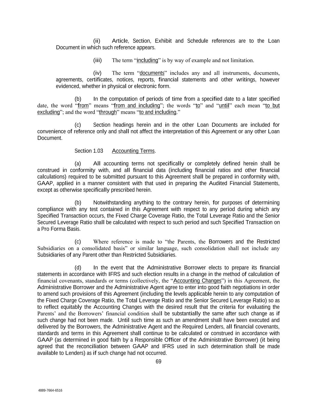 69 4889-7664-6516 (ii) Article, Section, Exhibit and Schedule references are to the Loan Document in which such reference appears. (iii) The term “including” is by way of example and not limitation. (iv) The term “documents” includes any and all instruments, documents, agreements, certificates, notices, reports, financial statements and other writings, however evidenced, whether in physical or electronic form. (b) In the computation of periods of time from a specified date to a later specified date, the word “from” means “from and including”; the words “to” and “until” each mean “to but excluding”; and the word “through” means “to and including.” (c) Section headings herein and in the other Loan Documents are included for convenience of reference only and shall not affect the interpretation of this Agreement or any other Loan Document. Section 1.03 Accounting Terms. (a) All accounting terms not specifically or completely defined herein shall be construed in conformity with, and all financial data (including financial ratios and other financial calculations) required to be submitted pursuant to this Agreement shall be prepared in conformity with, GAAP, applied in a manner consistent with that used in preparing the Audited Financial Statements, except as otherwise specifically prescribed herein. (b) Notwithstanding anything to the contrary herein, for purposes of determining compliance with any test contained in this Agreement with respect to any period during which any Specified Transaction occurs, the Fixed Charge Coverage Ratio, the Total Leverage Ratio and the Senior Secured Leverage Ratio shall be calculated with respect to such period and such Specified Transaction on a Pro Forma Basis. (c) Where reference is made to “the Parents, the Borrowers and the Restricted Subsidiaries on a consolidated basis” or similar language, such consolidation shall not include any Subsidiaries of any Parent other than Restricted Subsidiaries. (d) In the event that the Administrative Borrower elects to prepare its financial statements in accordance with IFRS and such election results in a change in the method of calculation of financial covenants, standards or terms (collectively, the “Accounting Changes”) in this Agreement, the Administrative Borrower and the Administrative Agent agree to enter into good faith negotiations in order to amend such provisions of this Agreement (including the levels applicable herein to any computation of the Fixed Charge Coverage Ratio, the Total Leverage Ratio and the Senior Secured Leverage Ratio) so as to reflect equitably the Accounting Changes with the desired result that the criteria for evaluating the Parents’ and the Borrowers’ financial condition shall be substantially the same after such change as if such change had not been made. Until such time as such an amendment shall have been executed and delivered by the Borrowers, the Administrative Agent and the Required Lenders, all financial covenants, standards and terms in this Agreement shall continue to be calculated or construed in accordance with GAAP (as determined in good faith by a Responsible Officer of the Administrative Borrower) (it being agreed that the reconciliation between GAAP and IFRS used in such determination shall be made available to Lenders) as if such change had not occurred.