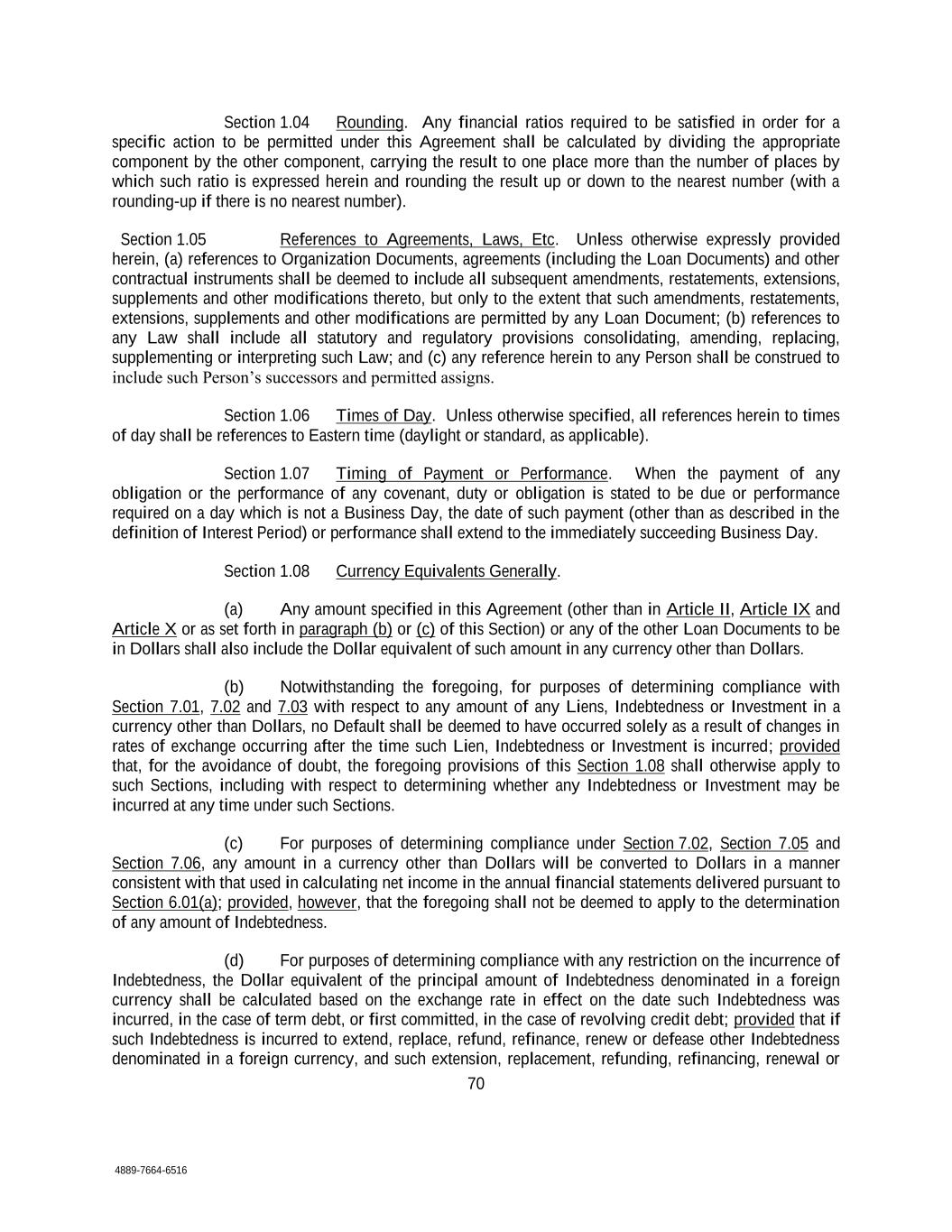 70 4889-7664-6516 Section 1.04 Rounding. Any financial ratios required to be satisfied in order for a specific action to be permitted under this Agreement shall be calculated by dividing the appropriate component by the other component, carrying the result to one place more than the number of places by which such ratio is expressed herein and rounding the result up or down to the nearest number (with a rounding-up if there is no nearest number). Section 1.05 References to Agreements, Laws, Etc. Unless otherwise expressly provided herein, (a) references to Organization Documents, agreements (including the Loan Documents) and other contractual instruments shall be deemed to include all subsequent amendments, restatements, extensions, supplements and other modifications thereto, but only to the extent that such amendments, restatements, extensions, supplements and other modifications are permitted by any Loan Document; (b) references to any Law shall include all statutory and regulatory provisions consolidating, amending, replacing, supplementing or interpreting such Law; and (c) any reference herein to any Person shall be construed to include such Person’s successors and permitted assigns. Section 1.06 Times of Day. Unless otherwise specified, all references herein to times of day shall be references to Eastern time (daylight or standard, as applicable). Section 1.07 Timing of Payment or Performance. When the payment of any obligation or the performance of any covenant, duty or obligation is stated to be due or performance required on a day which is not a Business Day, the date of such payment (other than as described in the definition of Interest Period) or performance shall extend to the immediately succeeding Business Day. Section 1.08 Currency Equivalents Generally. (a) Any amount specified in this Agreement (other than in Article II, Article IX and Article X or as set forth in paragraph (b) or (c) of this Section) or any of the other Loan Documents to be in Dollars shall also include the Dollar equivalent of such amount in any currency other than Dollars. (b) Notwithstanding the foregoing, for purposes of determining compliance with Section 7.01, 7.02 and 7.03 with respect to any amount of any Liens, Indebtedness or Investment in a currency other than Dollars, no Default shall be deemed to have occurred solely as a result of changes in rates of exchange occurring after the time such Lien, Indebtedness or Investment is incurred; provided that, for the avoidance of doubt, the foregoing provisions of this Section 1.08 shall otherwise apply to such Sections, including with respect to determining whether any Indebtedness or Investment may be incurred at any time under such Sections. (c) For purposes of determining compliance under Section 7.02, Section 7.05 and Section 7.06, any amount in a currency other than Dollars will be converted to Dollars in a manner consistent with that used in calculating net income in the annual financial statements delivered pursuant to Section 6.01(a); provided, however, that the foregoing shall not be deemed to apply to the determination of any amount of Indebtedness. (d) For purposes of determining compliance with any restriction on the incurrence of Indebtedness, the Dollar equivalent of the principal amount of Indebtedness denominated in a foreign currency shall be calculated based on the exchange rate in effect on the date such Indebtedness was incurred, in the case of term debt, or first committed, in the case of revolving credit debt; provided that if such Indebtedness is incurred to extend, replace, refund, refinance, renew or defease other Indebtedness denominated in a foreign currency, and such extension, replacement, refunding, refinancing, renewal or