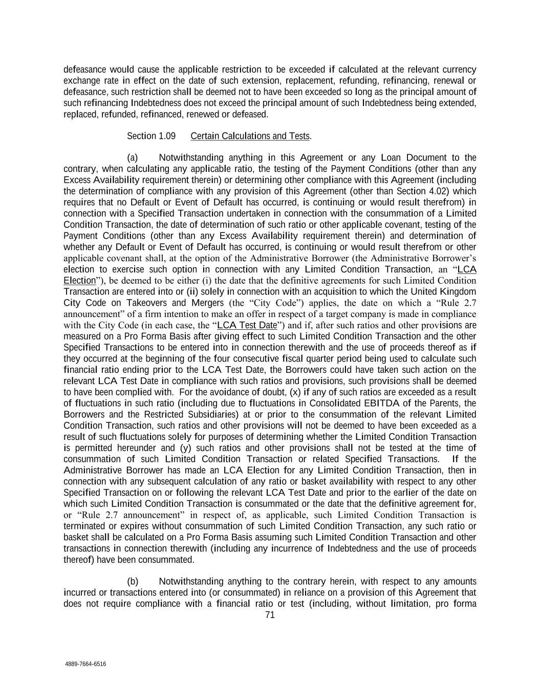 71 4889-7664-6516 defeasance would cause the applicable restriction to be exceeded if calculated at the relevant currency exchange rate in effect on the date of such extension, replacement, refunding, refinancing, renewal or defeasance, such restriction shall be deemed not to have been exceeded so long as the principal amount of such refinancing Indebtedness does not exceed the principal amount of such Indebtedness being extended, replaced, refunded, refinanced, renewed or defeased. Section 1.09 Certain Calculations and Tests. (a) Notwithstanding anything in this Agreement or any Loan Document to the contrary, when calculating any applicable ratio, the testing of the Payment Conditions (other than any Excess Availability requirement therein) or determining other compliance with this Agreement (including the determination of compliance with any provision of this Agreement (other than Section 4.02) which requires that no Default or Event of Default has occurred, is continuing or would result therefrom) in connection with a Specified Transaction undertaken in connection with the consummation of a Limited Condition Transaction, the date of determination of such ratio or other applicable covenant, testing of the Payment Conditions (other than any Excess Availability requirement therein) and determination of whether any Default or Event of Default has occurred, is continuing or would result therefrom or other applicable covenant shall, at the option of the Administrative Borrower (the Administrative Borrower’s election to exercise such option in connection with any Limited Condition Transaction, an “LCA Election”), be deemed to be either (i) the date that the definitive agreements for such Limited Condition Transaction are entered into or (ii) solely in connection with an acquisition to which the United Kingdom City Code on Takeovers and Mergers (the “City Code”) applies, the date on which a “Rule 2.7 announcement” of a firm intention to make an offer in respect of a target company is made in compliance with the City Code (in each case, the “LCA Test Date”) and if, after such ratios and other provisions are measured on a Pro Forma Basis after giving effect to such Limited Condition Transaction and the other Specified Transactions to be entered into in connection therewith and the use of proceeds thereof as if they occurred at the beginning of the four consecutive fiscal quarter period being used to calculate such financial ratio ending prior to the LCA Test Date, the Borrowers could have taken such action on the relevant LCA Test Date in compliance with such ratios and provisions, such provisions shall be deemed to have been complied with. For the avoidance of doubt, (x) if any of such ratios are exceeded as a result of fluctuations in such ratio (including due to fluctuations in Consolidated EBITDA of the Parents, the Borrowers and the Restricted Subsidiaries) at or prior to the consummation of the relevant Limited Condition Transaction, such ratios and other provisions will not be deemed to have been exceeded as a result of such fluctuations solely for purposes of determining whether the Limited Condition Transaction is permitted hereunder and (y) such ratios and other provisions shall not be tested at the time of consummation of such Limited Condition Transaction or related Specified Transactions. If the Administrative Borrower has made an LCA Election for any Limited Condition Transaction, then in connection with any subsequent calculation of any ratio or basket availability with respect to any other Specified Transaction on or following the relevant LCA Test Date and prior to the earlier of the date on which such Limited Condition Transaction is consummated or the date that the definitive agreement for, or “Rule 2.7 announcement” in respect of, as applicable, such Limited Condition Transaction is terminated or expires without consummation of such Limited Condition Transaction, any such ratio or basket shall be calculated on a Pro Forma Basis assuming such Limited Condition Transaction and other transactions in connection therewith (including any incurrence of Indebtedness and the use of proceeds thereof) have been consummated. (b) Notwithstanding anything to the contrary herein, with respect to any amounts incurred or transactions entered into (or consummated) in reliance on a provision of this Agreement that does not require compliance with a financial ratio or test (including, without limitation, pro forma
