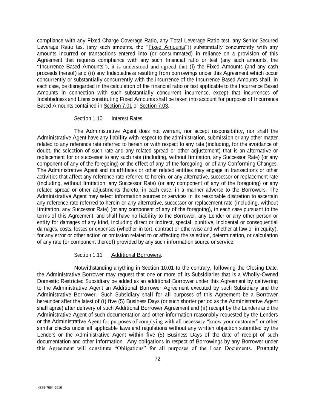72 4889-7664-6516 compliance with any Fixed Charge Coverage Ratio, any Total Leverage Ratio test, any Senior Secured Leverage Ratio test (any such amounts, the “Fixed Amounts”)) substantially concurrently with any amounts incurred or transactions entered into (or consummated) in reliance on a provision of this Agreement that requires compliance with any such financial ratio or test (any such amounts, the “Incurrence Based Amounts”), it is understood and agreed that (i) the Fixed Amounts (and any cash proceeds thereof) and (ii) any Indebtedness resulting from borrowings under this Agreement which occur concurrently or substantially concurrently with the incurrence of the Incurrence Based Amounts shall, in each case, be disregarded in the calculation of the financial ratio or test applicable to the Incurrence Based Amounts in connection with such substantially concurrent incurrence, except that incurrences of Indebtedness and Liens constituting Fixed Amounts shall be taken into account for purposes of Incurrence Based Amounts contained in Section 7.01 or Section 7.03. Section 1.10 Interest Rates. The Administrative Agent does not warrant, nor accept responsibility, nor shall the Administrative Agent have any liability with respect to the administration, submission or any other matter related to any reference rate referred to herein or with respect to any rate (including, for the avoidance of doubt, the selection of such rate and any related spread or other adjustement) that is an alternative or replacement for or successor to any such rate (including, without limitation, any Successor Rate) (or any component of any of the foregoing) or the effect of any of the foregoing, or of any Conforming Changes. The Administrative Agent and its affiliates or other related entities may engage in transactions or other activities that affect any reference rate referred to herein, or any alternative, successor or replacement rate (including, without limitation, any Successor Rate) (or any component of any of the foregoing) or any related spread or other adjustments thereto, in each case, in a manner adverse to the Borrowers. The Administrative Agent may select information sources or services in its reasonable discretion to ascertain any reference rate referred to herein or any alternative, successor or replacement rate (including, without limitation, any Successor Rate) (or any component of any of the foregoing), in each case pursuant to the terms of this Agreement, and shall have no liability to the Borrower, any Lender or any other person or entity for damages of any kind, including direct or indirect, special, punitive, incidental or consequential damages, costs, losses or expenses (whether in tort, contract or otherwise and whether at law or in equity), for any error or other action or omission related to or affecting the selection, determination, or calculation of any rate (or component thereof) provided by any such information source or service. Section 1.11 Additional Borrowers. Notwithstanding anything in Section 10.01 to the contrary, following the Closing Date, the Administrative Borrower may request that one or more of its Subsidiaries that is a Wholly-Owned Domestic Restricted Subsidiary be added as an additional Borrower under this Agreement by delivering to the Administrative Agent an Additional Borrower Agreement executed by such Subsidiary and the Administrative Borrower. Such Subsidiary shall for all purposes of this Agreement be a Borrower hereunder after the latest of (i) five (5) Business Days (or such shorter period as the Administrative Agent shall agree) after delivery of such Additional Borrower Agreement and (ii) receipt by the Lenders and the Administrative Agent of such documentation and other information reasonably requested by the Lenders or the Administrative Agent for purposes of complying with all necessary “know your customer” or other similar checks under all applicable laws and regulations without any written objection submitted by the Lenders or the Administrative Agent within five (5) Business Days of the date of receipt of such documentation and other information. Any obligations in respect of Borrowings by any Borrower under this Agreement will constitute “Obligations” for all purposes of the Loan Documents. Promptly