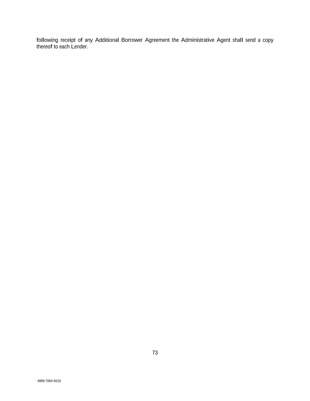 73 4889-7664-6516 following receipt of any Additional Borrower Agreement the Administrative Agent shall send a copy thereof to each Lender.