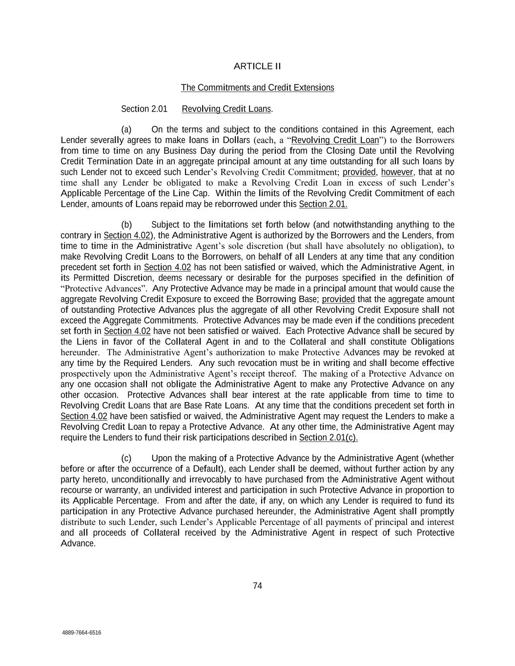 74 4889-7664-6516 ARTICLE II The Commitments and Credit Extensions Section 2.01 Revolving Credit Loans. (a) On the terms and subject to the conditions contained in this Agreement, each Lender severally agrees to make loans in Dollars (each, a “Revolving Credit Loan”) to the Borrowers from time to time on any Business Day during the period from the Closing Date until the Revolving Credit Termination Date in an aggregate principal amount at any time outstanding for all such loans by such Lender not to exceed such Lender’s Revolving Credit Commitment; provided, however, that at no time shall any Lender be obligated to make a Revolving Credit Loan in excess of such Lender’s Applicable Percentage of the Line Cap. Within the limits of the Revolving Credit Commitment of each Lender, amounts of Loans repaid may be reborrowed under this Section 2.01. (b) Subject to the limitations set forth below (and notwithstanding anything to the contrary in Section 4.02), the Administrative Agent is authorized by the Borrowers and the Lenders, from time to time in the Administrative Agent’s sole discretion (but shall have absolutely no obligation), to make Revolving Credit Loans to the Borrowers, on behalf of all Lenders at any time that any condition precedent set forth in Section 4.02 has not been satisfied or waived, which the Administrative Agent, in its Permitted Discretion, deems necessary or desirable for the purposes specified in the definition of “Protective Advances”. Any Protective Advance may be made in a principal amount that would cause the aggregate Revolving Credit Exposure to exceed the Borrowing Base; provided that the aggregate amount of outstanding Protective Advances plus the aggregate of all other Revolving Credit Exposure shall not exceed the Aggregate Commitments. Protective Advances may be made even if the conditions precedent set forth in Section 4.02 have not been satisfied or waived. Each Protective Advance shall be secured by the Liens in favor of the Collateral Agent in and to the Collateral and shall constitute Obligations hereunder. The Administrative Agent’s authorization to make Protective Advances may be revoked at any time by the Required Lenders. Any such revocation must be in writing and shall become effective prospectively upon the Administrative Agent’s receipt thereof. The making of a Protective Advance on any one occasion shall not obligate the Administrative Agent to make any Protective Advance on any other occasion. Protective Advances shall bear interest at the rate applicable from time to time to Revolving Credit Loans that are Base Rate Loans. At any time that the conditions precedent set forth in Section 4.02 have been satisfied or waived, the Administrative Agent may request the Lenders to make a Revolving Credit Loan to repay a Protective Advance. At any other time, the Administrative Agent may require the Lenders to fund their risk participations described in Section 2.01(c). (c) Upon the making of a Protective Advance by the Administrative Agent (whether before or after the occurrence of a Default), each Lender shall be deemed, without further action by any party hereto, unconditionally and irrevocably to have purchased from the Administrative Agent without recourse or warranty, an undivided interest and participation in such Protective Advance in proportion to its Applicable Percentage. From and after the date, if any, on which any Lender is required to fund its participation in any Protective Advance purchased hereunder, the Administrative Agent shall promptly distribute to such Lender, such Lender’s Applicable Percentage of all payments of principal and interest and all proceeds of Collateral received by the Administrative Agent in respect of such Protective Advance.