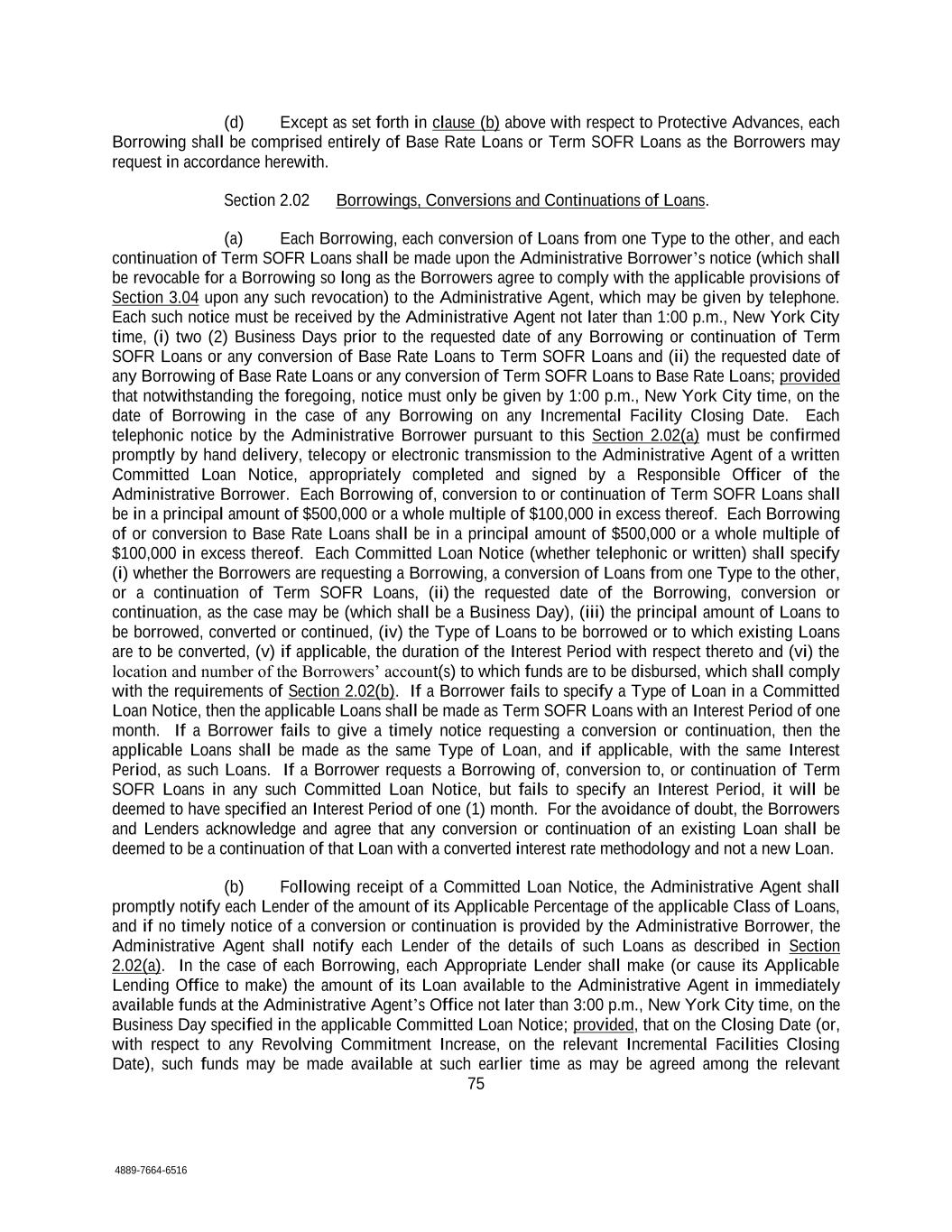 75 4889-7664-6516 (d) Except as set forth in clause (b) above with respect to Protective Advances, each Borrowing shall be comprised entirely of Base Rate Loans or Term SOFR Loans as the Borrowers may request in accordance herewith. Section 2.02 Borrowings, Conversions and Continuations of Loans. (a) Each Borrowing, each conversion of Loans from one Type to the other, and each continuation of Term SOFR Loans shall be made upon the Administrative Borrower’s notice (which shall be revocable for a Borrowing so long as the Borrowers agree to comply with the applicable provisions of Section 3.04 upon any such revocation) to the Administrative Agent, which may be given by telephone. Each such notice must be received by the Administrative Agent not later than 1:00 p.m., New York City time, (i) two (2) Business Days prior to the requested date of any Borrowing or continuation of Term SOFR Loans or any conversion of Base Rate Loans to Term SOFR Loans and (ii) the requested date of any Borrowing of Base Rate Loans or any conversion of Term SOFR Loans to Base Rate Loans; provided that notwithstanding the foregoing, notice must only be given by 1:00 p.m., New York City time, on the date of Borrowing in the case of any Borrowing on any Incremental Facility Closing Date. Each telephonic notice by the Administrative Borrower pursuant to this Section 2.02(a) must be confirmed promptly by hand delivery, telecopy or electronic transmission to the Administrative Agent of a written Committed Loan Notice, appropriately completed and signed by a Responsible Officer of the Administrative Borrower. Each Borrowing of, conversion to or continuation of Term SOFR Loans shall be in a principal amount of $500,000 or a whole multiple of $100,000 in excess thereof. Each Borrowing of or conversion to Base Rate Loans shall be in a principal amount of $500,000 or a whole multiple of $100,000 in excess thereof. Each Committed Loan Notice (whether telephonic or written) shall specify (i) whether the Borrowers are requesting a Borrowing, a conversion of Loans from one Type to the other, or a continuation of Term SOFR Loans, (ii) the requested date of the Borrowing, conversion or continuation, as the case may be (which shall be a Business Day), (iii) the principal amount of Loans to be borrowed, converted or continued, (iv) the Type of Loans to be borrowed or to which existing Loans are to be converted, (v) if applicable, the duration of the Interest Period with respect thereto and (vi) the location and number of the Borrowers’ account(s) to which funds are to be disbursed, which shall comply with the requirements of Section 2.02(b). If a Borrower fails to specify a Type of Loan in a Committed Loan Notice, then the applicable Loans shall be made as Term SOFR Loans with an Interest Period of one month. If a Borrower fails to give a timely notice requesting a conversion or continuation, then the applicable Loans shall be made as the same Type of Loan, and if applicable, with the same Interest Period, as such Loans. If a Borrower requests a Borrowing of, conversion to, or continuation of Term SOFR Loans in any such Committed Loan Notice, but fails to specify an Interest Period, it will be deemed to have specified an Interest Period of one (1) month. For the avoidance of doubt, the Borrowers and Lenders acknowledge and agree that any conversion or continuation of an existing Loan shall be deemed to be a continuation of that Loan with a converted interest rate methodology and not a new Loan. (b) Following receipt of a Committed Loan Notice, the Administrative Agent shall promptly notify each Lender of the amount of its Applicable Percentage of the applicable Class of Loans, and if no timely notice of a conversion or continuation is provided by the Administrative Borrower, the Administrative Agent shall notify each Lender of the details of such Loans as described in Section 2.02(a). In the case of each Borrowing, each Appropriate Lender shall make (or cause its Applicable Lending Office to make) the amount of its Loan available to the Administrative Agent in immediately available funds at the Administrative Agent’s Office not later than 3:00 p.m., New York City time, on the Business Day specified in the applicable Committed Loan Notice; provided, that on the Closing Date (or, with respect to any Revolving Commitment Increase, on the relevant Incremental Facilities Closing Date), such funds may be made available at such earlier time as may be agreed among the relevant
