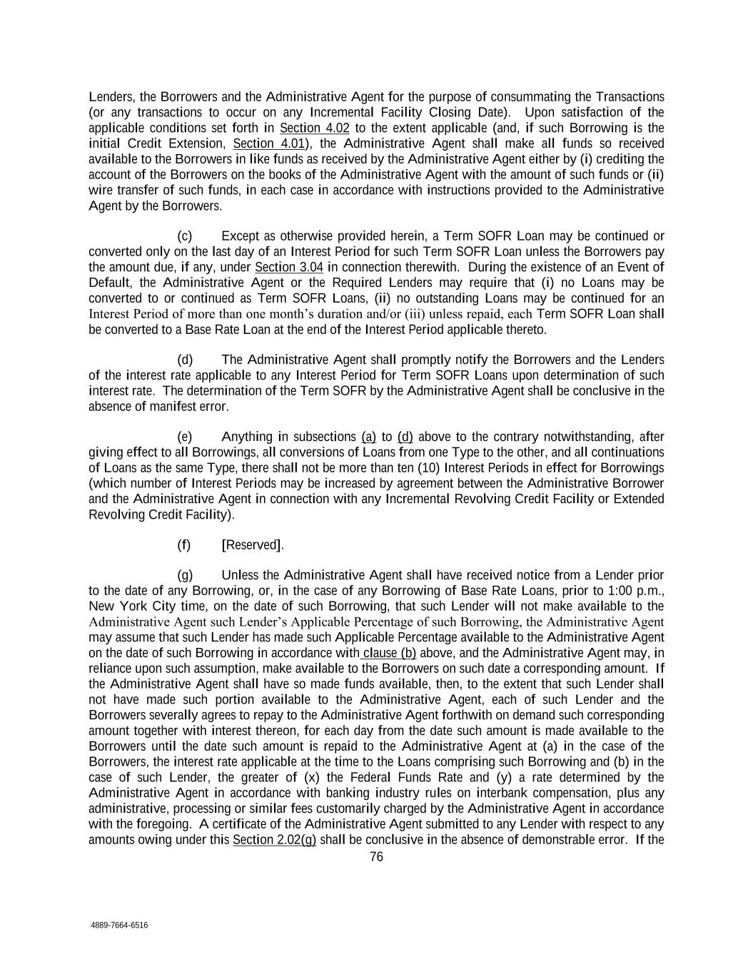 76 4889-7664-6516 Lenders, the Borrowers and the Administrative Agent for the purpose of consummating the Transactions (or any transactions to occur on any Incremental Facility Closing Date). Upon satisfaction of the applicable conditions set forth in Section 4.02 to the extent applicable (and, if such Borrowing is the initial Credit Extension, Section 4.01), the Administrative Agent shall make all funds so received available to the Borrowers in like funds as received by the Administrative Agent either by (i) crediting the account of the Borrowers on the books of the Administrative Agent with the amount of such funds or (ii) wire transfer of such funds, in each case in accordance with instructions provided to the Administrative Agent by the Borrowers. (c) Except as otherwise provided herein, a Term SOFR Loan may be continued or converted only on the last day of an Interest Period for such Term SOFR Loan unless the Borrowers pay the amount due, if any, under Section 3.04 in connection therewith. During the existence of an Event of Default, the Administrative Agent or the Required Lenders may require that (i) no Loans may be converted to or continued as Term SOFR Loans, (ii) no outstanding Loans may be continued for an Interest Period of more than one month’s duration and/or (iii) unless repaid, each Term SOFR Loan shall be converted to a Base Rate Loan at the end of the Interest Period applicable thereto. (d) The Administrative Agent shall promptly notify the Borrowers and the Lenders of the interest rate applicable to any Interest Period for Term SOFR Loans upon determination of such interest rate. The determination of the Term SOFR by the Administrative Agent shall be conclusive in the absence of manifest error. (e) Anything in subsections (a) to (d) above to the contrary notwithstanding, after giving effect to all Borrowings, all conversions of Loans from one Type to the other, and all continuations of Loans as the same Type, there shall not be more than ten (10) Interest Periods in effect for Borrowings (which number of Interest Periods may be increased by agreement between the Administrative Borrower and the Administrative Agent in connection with any Incremental Revolving Credit Facility or Extended Revolving Credit Facility). (f) [Reserved]. (g) Unless the Administrative Agent shall have received notice from a Lender prior to the date of any Borrowing, or, in the case of any Borrowing of Base Rate Loans, prior to 1:00 p.m., New York City time, on the date of such Borrowing, that such Lender will not make available to the Administrative Agent such Lender’s Applicable Percentage of such Borrowing, the Administrative Agent may assume that such Lender has made such Applicable Percentage available to the Administrative Agent on the date of such Borrowing in accordance with clause (b) above, and the Administrative Agent may, in reliance upon such assumption, make available to the Borrowers on such date a corresponding amount. If the Administrative Agent shall have so made funds available, then, to the extent that such Lender shall not have made such portion available to the Administrative Agent, each of such Lender and the Borrowers severally agrees to repay to the Administrative Agent forthwith on demand such corresponding amount together with interest thereon, for each day from the date such amount is made available to the Borrowers until the date such amount is repaid to the Administrative Agent at (a) in the case of the Borrowers, the interest rate applicable at the time to the Loans comprising such Borrowing and (b) in the case of such Lender, the greater of (x) the Federal Funds Rate and (y) a rate determined by the Administrative Agent in accordance with banking industry rules on interbank compensation, plus any administrative, processing or similar fees customarily charged by the Administrative Agent in accordance with the foregoing. A certificate of the Administrative Agent submitted to any Lender with respect to any amounts owing under this Section 2.02(g) shall be conclusive in the absence of demonstrable error. If the