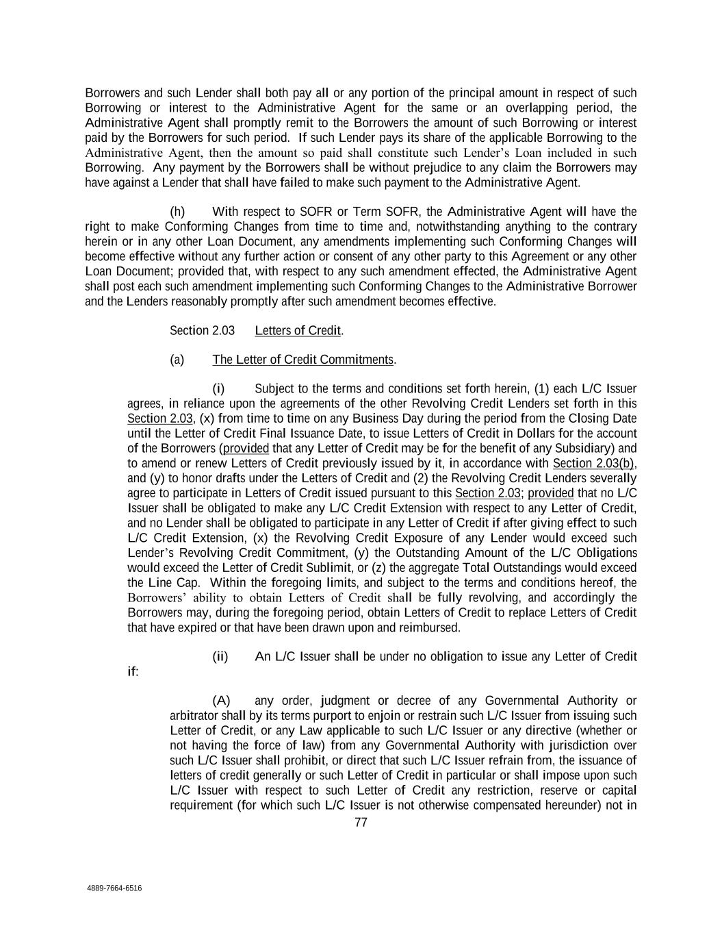 77 4889-7664-6516 Borrowers and such Lender shall both pay all or any portion of the principal amount in respect of such Borrowing or interest to the Administrative Agent for the same or an overlapping period, the Administrative Agent shall promptly remit to the Borrowers the amount of such Borrowing or interest paid by the Borrowers for such period. If such Lender pays its share of the applicable Borrowing to the Administrative Agent, then the amount so paid shall constitute such Lender’s Loan included in such Borrowing. Any payment by the Borrowers shall be without prejudice to any claim the Borrowers may have against a Lender that shall have failed to make such payment to the Administrative Agent. (h) With respect to SOFR or Term SOFR, the Administrative Agent will have the right to make Conforming Changes from time to time and, notwithstanding anything to the contrary herein or in any other Loan Document, any amendments implementing such Conforming Changes will become effective without any further action or consent of any other party to this Agreement or any other Loan Document; provided that, with respect to any such amendment effected, the Administrative Agent shall post each such amendment implementing such Conforming Changes to the Administrative Borrower and the Lenders reasonably promptly after such amendment becomes effective. Section 2.03 Letters of Credit. (a) The Letter of Credit Commitments. (i) Subject to the terms and conditions set forth herein, (1) each L/C Issuer agrees, in reliance upon the agreements of the other Revolving Credit Lenders set forth in this Section 2.03, (x) from time to time on any Business Day during the period from the Closing Date until the Letter of Credit Final Issuance Date, to issue Letters of Credit in Dollars for the account of the Borrowers (provided that any Letter of Credit may be for the benefit of any Subsidiary) and to amend or renew Letters of Credit previously issued by it, in accordance with Section 2.03(b), and (y) to honor drafts under the Letters of Credit and (2) the Revolving Credit Lenders severally agree to participate in Letters of Credit issued pursuant to this Section 2.03; provided that no L/C Issuer shall be obligated to make any L/C Credit Extension with respect to any Letter of Credit, and no Lender shall be obligated to participate in any Letter of Credit if after giving effect to such L/C Credit Extension, (x) the Revolving Credit Exposure of any Lender would exceed such Lender’s Revolving Credit Commitment, (y) the Outstanding Amount of the L/C Obligations would exceed the Letter of Credit Sublimit, or (z) the aggregate Total Outstandings would exceed the Line Cap. Within the foregoing limits, and subject to the terms and conditions hereof, the Borrowers’ ability to obtain Letters of Credit shall be fully revolving, and accordingly the Borrowers may, during the foregoing period, obtain Letters of Credit to replace Letters of Credit that have expired or that have been drawn upon and reimbursed. (ii) An L/C Issuer shall be under no obligation to issue any Letter of Credit if: (A) any order, judgment or decree of any Governmental Authority or arbitrator shall by its terms purport to enjoin or restrain such L/C Issuer from issuing such Letter of Credit, or any Law applicable to such L/C Issuer or any directive (whether or not having the force of law) from any Governmental Authority with jurisdiction over such L/C Issuer shall prohibit, or direct that such L/C Issuer refrain from, the issuance of letters of credit generally or such Letter of Credit in particular or shall impose upon such L/C Issuer with respect to such Letter of Credit any restriction, reserve or capital requirement (for which such L/C Issuer is not otherwise compensated hereunder) not in