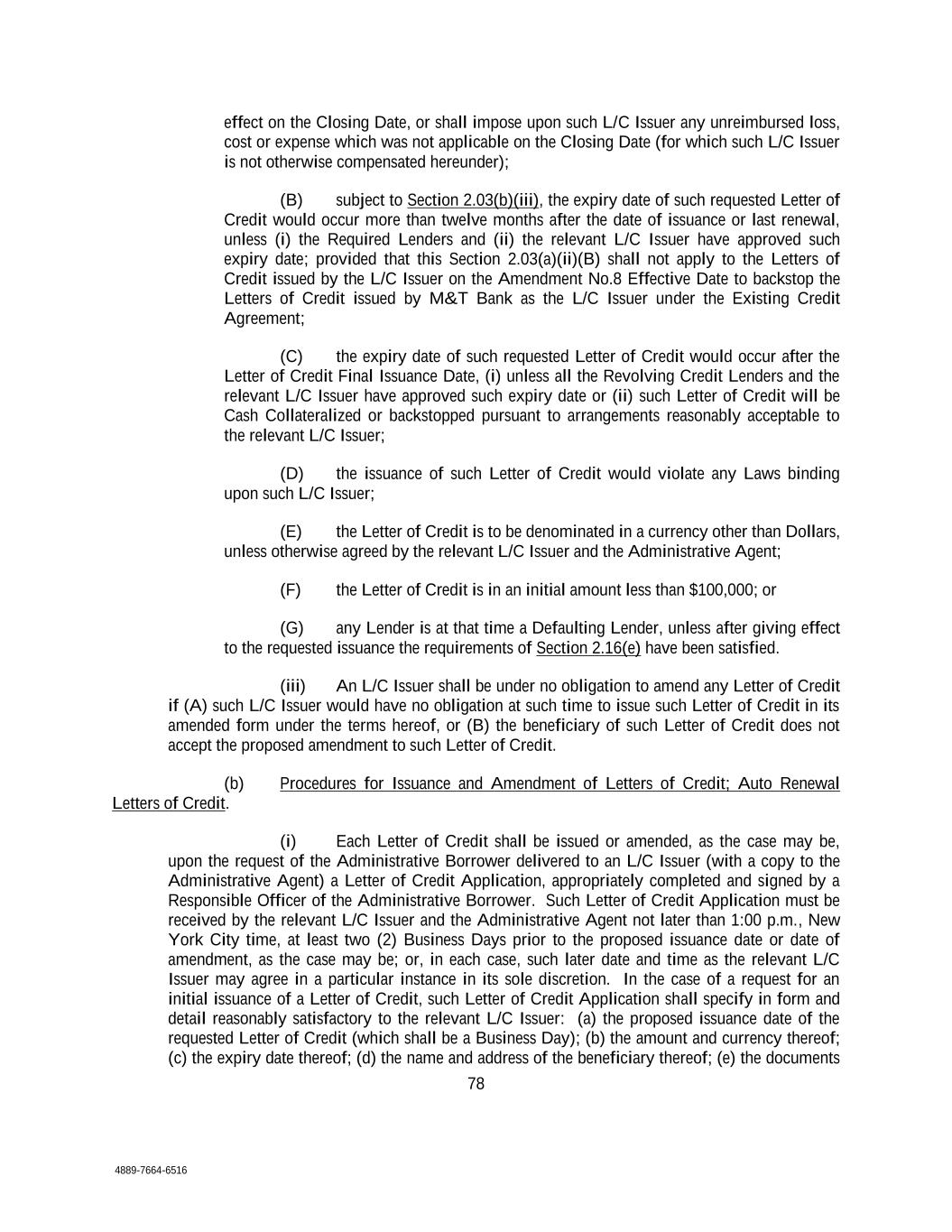 78 4889-7664-6516 effect on the Closing Date, or shall impose upon such L/C Issuer any unreimbursed loss, cost or expense which was not applicable on the Closing Date (for which such L/C Issuer is not otherwise compensated hereunder); (B) subject to Section 2.03(b)(iii), the expiry date of such requested Letter of Credit would occur more than twelve months after the date of issuance or last renewal, unless (i) the Required Lenders and (ii) the relevant L/C Issuer have approved such expiry date; provided that this Section 2.03(a)(ii)(B) shall not apply to the Letters of Credit issued by the L/C Issuer on the Amendment No.8 Effective Date to backstop the Letters of Credit issued by M&T Bank as the L/C Issuer under the Existing Credit Agreement; (C) the expiry date of such requested Letter of Credit would occur after the Letter of Credit Final Issuance Date, (i) unless all the Revolving Credit Lenders and the relevant L/C Issuer have approved such expiry date or (ii) such Letter of Credit will be Cash Collateralized or backstopped pursuant to arrangements reasonably acceptable to the relevant L/C Issuer; (D) the issuance of such Letter of Credit would violate any Laws binding upon such L/C Issuer; (E) the Letter of Credit is to be denominated in a currency other than Dollars, unless otherwise agreed by the relevant L/C Issuer and the Administrative Agent; (F) the Letter of Credit is in an initial amount less than $100,000; or (G) any Lender is at that time a Defaulting Lender, unless after giving effect to the requested issuance the requirements of Section 2.16(e) have been satisfied. (iii) An L/C Issuer shall be under no obligation to amend any Letter of Credit if (A) such L/C Issuer would have no obligation at such time to issue such Letter of Credit in its amended form under the terms hereof, or (B) the beneficiary of such Letter of Credit does not accept the proposed amendment to such Letter of Credit. (b) Procedures for Issuance and Amendment of Letters of Credit; Auto Renewal Letters of Credit. (i) Each Letter of Credit shall be issued or amended, as the case may be, upon the request of the Administrative Borrower delivered to an L/C Issuer (with a copy to the Administrative Agent) a Letter of Credit Application, appropriately completed and signed by a Responsible Officer of the Administrative Borrower. Such Letter of Credit Application must be received by the relevant L/C Issuer and the Administrative Agent not later than 1:00 p.m., New York City time, at least two (2) Business Days prior to the proposed issuance date or date of amendment, as the case may be; or, in each case, such later date and time as the relevant L/C Issuer may agree in a particular instance in its sole discretion. In the case of a request for an initial issuance of a Letter of Credit, such Letter of Credit Application shall specify in form and detail reasonably satisfactory to the relevant L/C Issuer: (a) the proposed issuance date of the requested Letter of Credit (which shall be a Business Day); (b) the amount and currency thereof; (c) the expiry date thereof; (d) the name and address of the beneficiary thereof; (e) the documents