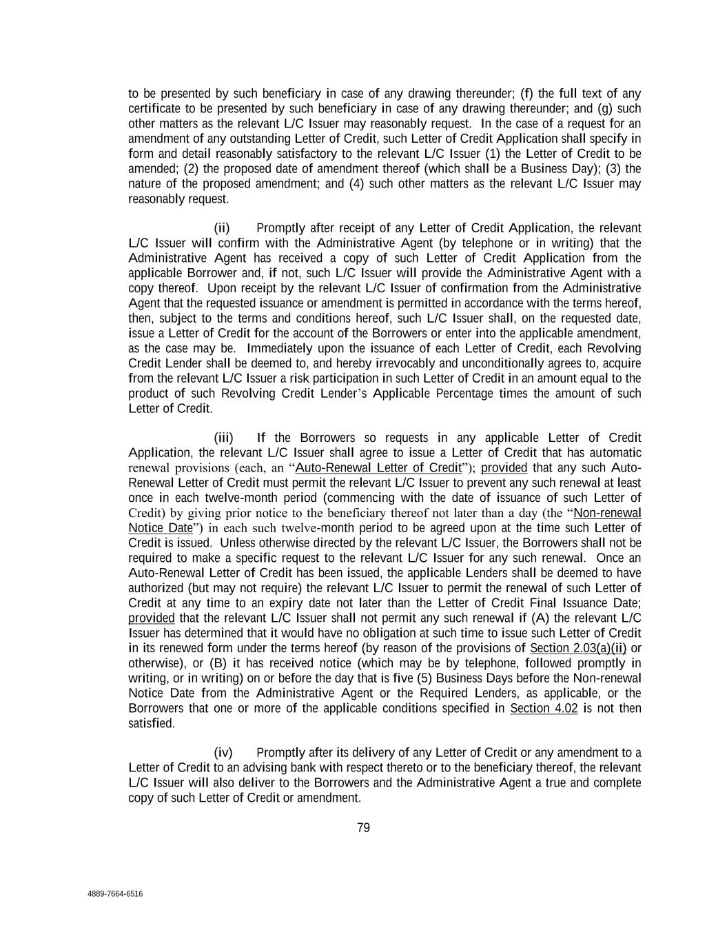 79 4889-7664-6516 to be presented by such beneficiary in case of any drawing thereunder; (f) the full text of any certificate to be presented by such beneficiary in case of any drawing thereunder; and (g) such other matters as the relevant L/C Issuer may reasonably request. In the case of a request for an amendment of any outstanding Letter of Credit, such Letter of Credit Application shall specify in form and detail reasonably satisfactory to the relevant L/C Issuer (1) the Letter of Credit to be amended; (2) the proposed date of amendment thereof (which shall be a Business Day); (3) the nature of the proposed amendment; and (4) such other matters as the relevant L/C Issuer may reasonably request. (ii) Promptly after receipt of any Letter of Credit Application, the relevant L/C Issuer will confirm with the Administrative Agent (by telephone or in writing) that the Administrative Agent has received a copy of such Letter of Credit Application from the applicable Borrower and, if not, such L/C Issuer will provide the Administrative Agent with a copy thereof. Upon receipt by the relevant L/C Issuer of confirmation from the Administrative Agent that the requested issuance or amendment is permitted in accordance with the terms hereof, then, subject to the terms and conditions hereof, such L/C Issuer shall, on the requested date, issue a Letter of Credit for the account of the Borrowers or enter into the applicable amendment, as the case may be. Immediately upon the issuance of each Letter of Credit, each Revolving Credit Lender shall be deemed to, and hereby irrevocably and unconditionally agrees to, acquire from the relevant L/C Issuer a risk participation in such Letter of Credit in an amount equal to the product of such Revolving Credit Lender’s Applicable Percentage times the amount of such Letter of Credit. (iii) If the Borrowers so requests in any applicable Letter of Credit Application, the relevant L/C Issuer shall agree to issue a Letter of Credit that has automatic renewal provisions (each, an “Auto-Renewal Letter of Credit”); provided that any such Auto- Renewal Letter of Credit must permit the relevant L/C Issuer to prevent any such renewal at least once in each twelve-month period (commencing with the date of issuance of such Letter of Credit) by giving prior notice to the beneficiary thereof not later than a day (the “Non-renewal Notice Date”) in each such twelve-month period to be agreed upon at the time such Letter of Credit is issued. Unless otherwise directed by the relevant L/C Issuer, the Borrowers shall not be required to make a specific request to the relevant L/C Issuer for any such renewal. Once an Auto-Renewal Letter of Credit has been issued, the applicable Lenders shall be deemed to have authorized (but may not require) the relevant L/C Issuer to permit the renewal of such Letter of Credit at any time to an expiry date not later than the Letter of Credit Final Issuance Date; provided that the relevant L/C Issuer shall not permit any such renewal if (A) the relevant L/C Issuer has determined that it would have no obligation at such time to issue such Letter of Credit in its renewed form under the terms hereof (by reason of the provisions of Section 2.03(a)(ii) or otherwise), or (B) it has received notice (which may be by telephone, followed promptly in writing, or in writing) on or before the day that is five (5) Business Days before the Non-renewal Notice Date from the Administrative Agent or the Required Lenders, as applicable, or the Borrowers that one or more of the applicable conditions specified in Section 4.02 is not then satisfied. (iv) Promptly after its delivery of any Letter of Credit or any amendment to a Letter of Credit to an advising bank with respect thereto or to the beneficiary thereof, the relevant L/C Issuer will also deliver to the Borrowers and the Administrative Agent a true and complete copy of such Letter of Credit or amendment.