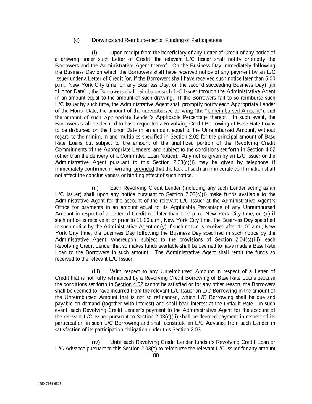 80 4889-7664-6516 (c) Drawings and Reimbursements; Funding of Participations. (i) Upon receipt from the beneficiary of any Letter of Credit of any notice of a drawing under such Letter of Credit, the relevant L/C Issuer shall notify promptly the Borrowers and the Administrative Agent thereof. On the Business Day immediately following the Business Day on which the Borrowers shall have received notice of any payment by an L/C Issuer under a Letter of Credit (or, if the Borrowers shall have received such notice later than 5:00 p.m., New York City time, on any Business Day, on the second succeeding Business Day) (an “Honor Date”), the Borrowers shall reimburse such L/C Issuer through the Administrative Agent in an amount equal to the amount of such drawing. If the Borrowers fail to so reimburse such L/C Issuer by such time, the Administrative Agent shall promptly notify each Appropriate Lender of the Honor Date, the amount of the unreimbursed drawing (the “Unreimbursed Amount”), and the amount of such Appropriate Lender’s Applicable Percentage thereof. In such event, the Borrowers shall be deemed to have requested a Revolving Credit Borrowing of Base Rate Loans to be disbursed on the Honor Date in an amount equal to the Unreimbursed Amount, without regard to the minimum and multiples specified in Section 2.02 for the principal amount of Base Rate Loans but subject to the amount of the unutilized portion of the Revolving Credit Commitments of the Appropriate Lenders, and subject to the conditions set forth in Section 4.02 (other than the delivery of a Committed Loan Notice). Any notice given by an L/C Issuer or the Administrative Agent pursuant to this Section 2.03(c)(i) may be given by telephone if immediately confirmed in writing; provided that the lack of such an immediate confirmation shall not affect the conclusiveness or binding effect of such notice. (ii) Each Revolving Credit Lender (including any such Lender acting as an L/C Issuer) shall upon any notice pursuant to Section 2.03(c)(i) make funds available to the Administrative Agent for the account of the relevant L/C Issuer at the Administrative Agent’s Office for payments in an amount equal to its Applicable Percentage of any Unreimbursed Amount in respect of a Letter of Credit not later than 1:00 p.m., New York City time, on (x) if such notice is receive at or prior to 11:00 a.m., New York City time, the Business Day specified in such notice by the Administrative Agent or (y) if such notice is received after 11:00 a.m., New York City time, the Business Day following the Business Day specified in such notice by the Administrative Agent, whereupon, subject to the provisions of Section 2.04(c)(iii), each Revolving Credit Lender that so makes funds available shall be deemed to have made a Base Rate Loan to the Borrowers in such amount. The Administrative Agent shall remit the funds so received to the relevant L/C Issuer. (iii) With respect to any Unreimbursed Amount in respect of a Letter of Credit that is not fully refinanced by a Revolving Credit Borrowing of Base Rate Loans because the conditions set forth in Section 4.02 cannot be satisfied or for any other reason, the Borrowers shall be deemed to have incurred from the relevant L/C Issuer an L/C Borrowing in the amount of the Unreimbursed Amount that is not so refinanced, which L/C Borrowing shall be due and payable on demand (together with interest) and shall bear interest at the Default Rate. In such event, each Revolving Credit Lender’s payment to the Administrative Agent for the account of the relevant L/C Issuer pursuant to Section 2.03(c)(ii) shall be deemed payment in respect of its participation in such L/C Borrowing and shall constitute an L/C Advance from such Lender in satisfaction of its participation obligation under this Section 2.03. (iv) Until each Revolving Credit Lender funds its Revolving Credit Loan or L/C Advance pursuant to this Section 2.03(c) to reimburse the relevant L/C Issuer for any amount