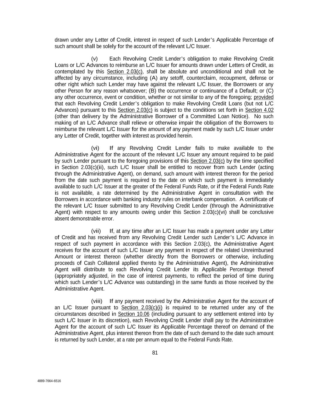 81 4889-7664-6516 drawn under any Letter of Credit, interest in respect of such Lender’s Applicable Percentage of such amount shall be solely for the account of the relevant L/C Issuer. (v) Each Revolving Credit Lender’s obligation to make Revolving Credit Loans or L/C Advances to reimburse an L/C Issuer for amounts drawn under Letters of Credit, as contemplated by this Section 2.03(c), shall be absolute and unconditional and shall not be affected by any circumstance, including (A) any setoff, counterclaim, recoupment, defense or other right which such Lender may have against the relevant L/C Issuer, the Borrowers or any other Person for any reason whatsoever; (B) the occurrence or continuance of a Default; or (C) any other occurrence, event or condition, whether or not similar to any of the foregoing; provided that each Revolving Credit Lender’s obligation to make Revolving Credit Loans (but not L/C Advances) pursuant to this Section 2.03(c) is subject to the conditions set forth in Section 4.02 (other than delivery by the Administrative Borrower of a Committed Loan Notice). No such making of an L/C Advance shall relieve or otherwise impair the obligation of the Borrowers to reimburse the relevant L/C Issuer for the amount of any payment made by such L/C Issuer under any Letter of Credit, together with interest as provided herein. (vi) If any Revolving Credit Lender fails to make available to the Administrative Agent for the account of the relevant L/C Issuer any amount required to be paid by such Lender pursuant to the foregoing provisions of this Section 2.03(c) by the time specified in Section 2.03(c)(ii), such L/C Issuer shall be entitled to recover from such Lender (acting through the Administrative Agent), on demand, such amount with interest thereon for the period from the date such payment is required to the date on which such payment is immediately available to such L/C Issuer at the greater of the Federal Funds Rate, or if the Federal Funds Rate is not available, a rate determined by the Administrative Agent in consultation with the Borrowers in accordance with banking industry rules on interbank compensation. A certificate of the relevant L/C Issuer submitted to any Revolving Credit Lender (through the Administrative Agent) with respect to any amounts owing under this Section 2.03(c)(vi) shall be conclusive absent demonstrable error. (vii) If, at any time after an L/C Issuer has made a payment under any Letter of Credit and has received from any Revolving Credit Lender such Lender’s L/C Advance in respect of such payment in accordance with this Section 2.03(c), the Administrative Agent receives for the account of such L/C Issuer any payment in respect of the related Unreimbursed Amount or interest thereon (whether directly from the Borrowers or otherwise, including proceeds of Cash Collateral applied thereto by the Administrative Agent), the Administrative Agent will distribute to each Revolving Credit Lender its Applicable Percentage thereof (appropriately adjusted, in the case of interest payments, to reflect the period of time during which such Lender’s L/C Advance was outstanding) in the same funds as those received by the Administrative Agent. (viii) If any payment received by the Administrative Agent for the account of an L/C Issuer pursuant to Section 2.03(c)(i) is required to be returned under any of the circumstances described in Section 10.06 (including pursuant to any settlement entered into by such L/C Issuer in its discretion), each Revolving Credit Lender shall pay to the Administrative Agent for the account of such L/C Issuer its Applicable Percentage thereof on demand of the Administrative Agent, plus interest thereon from the date of such demand to the date such amount is returned by such Lender, at a rate per annum equal to the Federal Funds Rate.