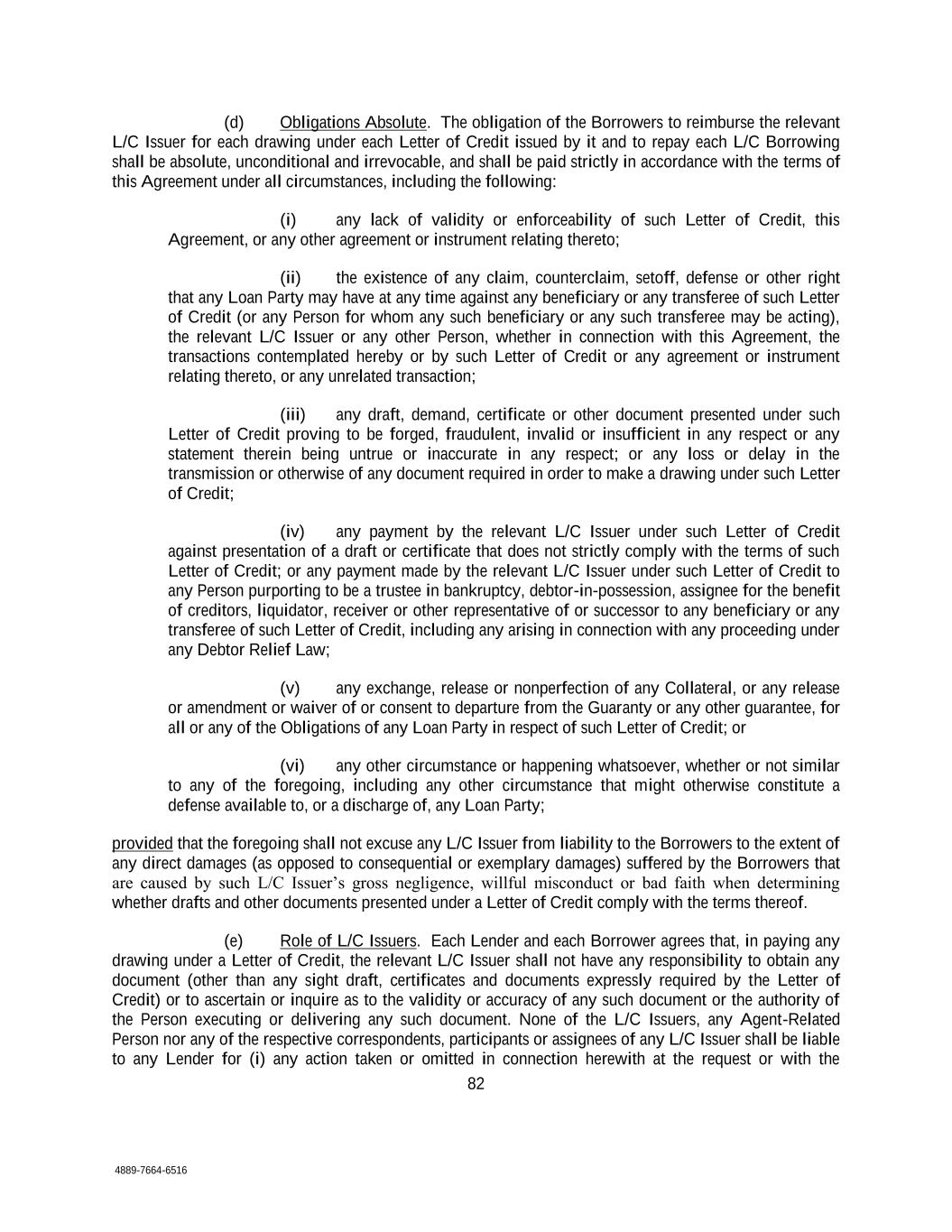 82 4889-7664-6516 (d) Obligations Absolute. The obligation of the Borrowers to reimburse the relevant L/C Issuer for each drawing under each Letter of Credit issued by it and to repay each L/C Borrowing shall be absolute, unconditional and irrevocable, and shall be paid strictly in accordance with the terms of this Agreement under all circumstances, including the following: (i) any lack of validity or enforceability of such Letter of Credit, this Agreement, or any other agreement or instrument relating thereto; (ii) the existence of any claim, counterclaim, setoff, defense or other right that any Loan Party may have at any time against any beneficiary or any transferee of such Letter of Credit (or any Person for whom any such beneficiary or any such transferee may be acting), the relevant L/C Issuer or any other Person, whether in connection with this Agreement, the transactions contemplated hereby or by such Letter of Credit or any agreement or instrument relating thereto, or any unrelated transaction; (iii) any draft, demand, certificate or other document presented under such Letter of Credit proving to be forged, fraudulent, invalid or insufficient in any respect or any statement therein being untrue or inaccurate in any respect; or any loss or delay in the transmission or otherwise of any document required in order to make a drawing under such Letter of Credit; (iv) any payment by the relevant L/C Issuer under such Letter of Credit against presentation of a draft or certificate that does not strictly comply with the terms of such Letter of Credit; or any payment made by the relevant L/C Issuer under such Letter of Credit to any Person purporting to be a trustee in bankruptcy, debtor-in-possession, assignee for the benefit of creditors, liquidator, receiver or other representative of or successor to any beneficiary or any transferee of such Letter of Credit, including any arising in connection with any proceeding under any Debtor Relief Law; (v) any exchange, release or nonperfection of any Collateral, or any release or amendment or waiver of or consent to departure from the Guaranty or any other guarantee, for all or any of the Obligations of any Loan Party in respect of such Letter of Credit; or (vi) any other circumstance or happening whatsoever, whether or not similar to any of the foregoing, including any other circumstance that might otherwise constitute a defense available to, or a discharge of, any Loan Party; provided that the foregoing shall not excuse any L/C Issuer from liability to the Borrowers to the extent of any direct damages (as opposed to consequential or exemplary damages) suffered by the Borrowers that are caused by such L/C Issuer’s gross negligence, willful misconduct or bad faith when determining whether drafts and other documents presented under a Letter of Credit comply with the terms thereof. (e) Role of L/C Issuers. Each Lender and each Borrower agrees that, in paying any drawing under a Letter of Credit, the relevant L/C Issuer shall not have any responsibility to obtain any document (other than any sight draft, certificates and documents expressly required by the Letter of Credit) or to ascertain or inquire as to the validity or accuracy of any such document or the authority of the Person executing or delivering any such document. None of the L/C Issuers, any Agent-Related Person nor any of the respective correspondents, participants or assignees of any L/C Issuer shall be liable to any Lender for (i) any action taken or omitted in connection herewith at the request or with the