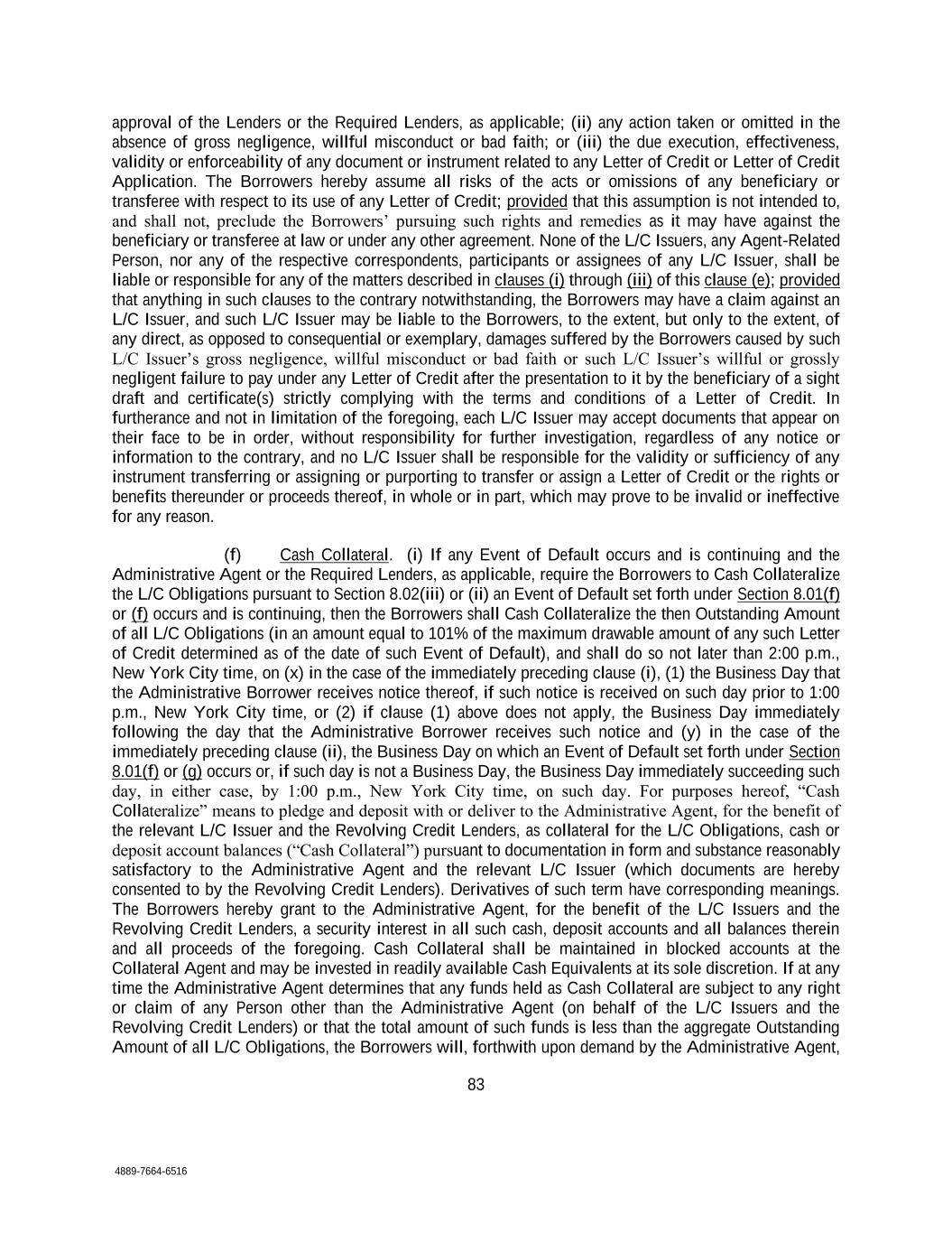 83 4889-7664-6516 approval of the Lenders or the Required Lenders, as applicable; (ii) any action taken or omitted in the absence of gross negligence, willful misconduct or bad faith; or (iii) the due execution, effectiveness, validity or enforceability of any document or instrument related to any Letter of Credit or Letter of Credit Application. The Borrowers hereby assume all risks of the acts or omissions of any beneficiary or transferee with respect to its use of any Letter of Credit; provided that this assumption is not intended to, and shall not, preclude the Borrowers’ pursuing such rights and remedies as it may have against the beneficiary or transferee at law or under any other agreement. None of the L/C Issuers, any Agent-Related Person, nor any of the respective correspondents, participants or assignees of any L/C Issuer, shall be liable or responsible for any of the matters described in clauses (i) through (iii) of this clause (e); provided that anything in such clauses to the contrary notwithstanding, the Borrowers may have a claim against an L/C Issuer, and such L/C Issuer may be liable to the Borrowers, to the extent, but only to the extent, of any direct, as opposed to consequential or exemplary, damages suffered by the Borrowers caused by such L/C Issuer’s gross negligence, willful misconduct or bad faith or such L/C Issuer’s willful or grossly negligent failure to pay under any Letter of Credit after the presentation to it by the beneficiary of a sight draft and certificate(s) strictly complying with the terms and conditions of a Letter of Credit. In furtherance and not in limitation of the foregoing, each L/C Issuer may accept documents that appear on their face to be in order, without responsibility for further investigation, regardless of any notice or information to the contrary, and no L/C Issuer shall be responsible for the validity or sufficiency of any instrument transferring or assigning or purporting to transfer or assign a Letter of Credit or the rights or benefits thereunder or proceeds thereof, in whole or in part, which may prove to be invalid or ineffective for any reason. (f) Cash Collateral. (i) If any Event of Default occurs and is continuing and the Administrative Agent or the Required Lenders, as applicable, require the Borrowers to Cash Collateralize the L/C Obligations pursuant to Section 8.02(iii) or (ii) an Event of Default set forth under Section 8.01(f) or (f) occurs and is continuing, then the Borrowers shall Cash Collateralize the then Outstanding Amount of all L/C Obligations (in an amount equal to 101% of the maximum drawable amount of any such Letter of Credit determined as of the date of such Event of Default), and shall do so not later than 2:00 p.m., New York City time, on (x) in the case of the immediately preceding clause (i), (1) the Business Day that the Administrative Borrower receives notice thereof, if such notice is received on such day prior to 1:00 p.m., New York City time, or (2) if clause (1) above does not apply, the Business Day immediately following the day that the Administrative Borrower receives such notice and (y) in the case of the immediately preceding clause (ii), the Business Day on which an Event of Default set forth under Section 8.01(f) or (g) occurs or, if such day is not a Business Day, the Business Day immediately succeeding such day, in either case, by 1:00 p.m., New York City time, on such day. For purposes hereof, “Cash Collateralize” means to pledge and deposit with or deliver to the Administrative Agent, for the benefit of the relevant L/C Issuer and the Revolving Credit Lenders, as collateral for the L/C Obligations, cash or deposit account balances (“Cash Collateral”) pursuant to documentation in form and substance reasonably satisfactory to the Administrative Agent and the relevant L/C Issuer (which documents are hereby consented to by the Revolving Credit Lenders). Derivatives of such term have corresponding meanings. The Borrowers hereby grant to the Administrative Agent, for the benefit of the L/C Issuers and the Revolving Credit Lenders, a security interest in all such cash, deposit accounts and all balances therein and all proceeds of the foregoing. Cash Collateral shall be maintained in blocked accounts at the Collateral Agent and may be invested in readily available Cash Equivalents at its sole discretion. If at any time the Administrative Agent determines that any funds held as Cash Collateral are subject to any right or claim of any Person other than the Administrative Agent (on behalf of the L/C Issuers and the Revolving Credit Lenders) or that the total amount of such funds is less than the aggregate Outstanding Amount of all L/C Obligations, the Borrowers will, forthwith upon demand by the Administrative Agent,