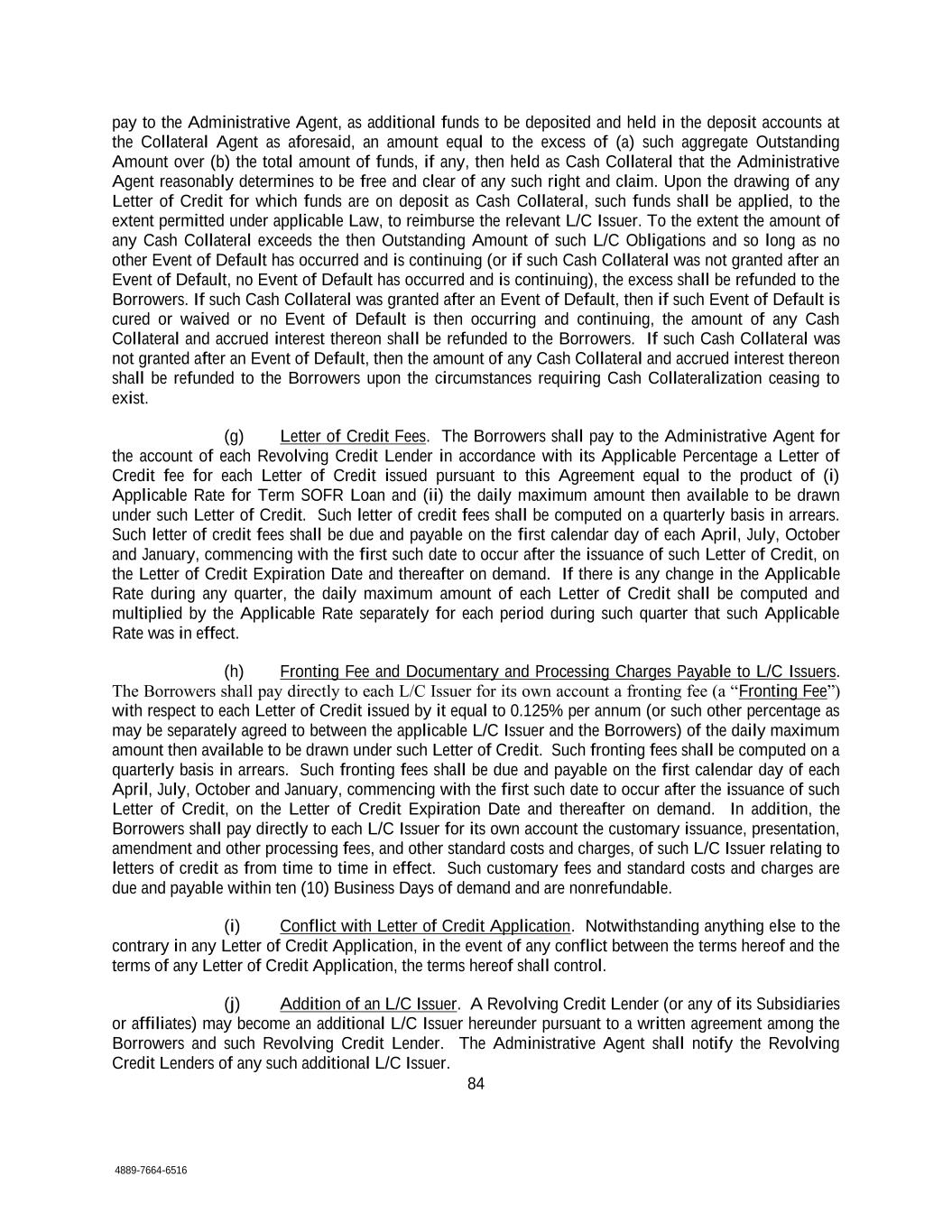 84 4889-7664-6516 pay to the Administrative Agent, as additional funds to be deposited and held in the deposit accounts at the Collateral Agent as aforesaid, an amount equal to the excess of (a) such aggregate Outstanding Amount over (b) the total amount of funds, if any, then held as Cash Collateral that the Administrative Agent reasonably determines to be free and clear of any such right and claim. Upon the drawing of any Letter of Credit for which funds are on deposit as Cash Collateral, such funds shall be applied, to the extent permitted under applicable Law, to reimburse the relevant L/C Issuer. To the extent the amount of any Cash Collateral exceeds the then Outstanding Amount of such L/C Obligations and so long as no other Event of Default has occurred and is continuing (or if such Cash Collateral was not granted after an Event of Default, no Event of Default has occurred and is continuing), the excess shall be refunded to the Borrowers. If such Cash Collateral was granted after an Event of Default, then if such Event of Default is cured or waived or no Event of Default is then occurring and continuing, the amount of any Cash Collateral and accrued interest thereon shall be refunded to the Borrowers. If such Cash Collateral was not granted after an Event of Default, then the amount of any Cash Collateral and accrued interest thereon shall be refunded to the Borrowers upon the circumstances requiring Cash Collateralization ceasing to exist. (g) Letter of Credit Fees. The Borrowers shall pay to the Administrative Agent for the account of each Revolving Credit Lender in accordance with its Applicable Percentage a Letter of Credit fee for each Letter of Credit issued pursuant to this Agreement equal to the product of (i) Applicable Rate for Term SOFR Loan and (ii) the daily maximum amount then available to be drawn under such Letter of Credit. Such letter of credit fees shall be computed on a quarterly basis in arrears. Such letter of credit fees shall be due and payable on the first calendar day of each April, July, October and January, commencing with the first such date to occur after the issuance of such Letter of Credit, on the Letter of Credit Expiration Date and thereafter on demand. If there is any change in the Applicable Rate during any quarter, the daily maximum amount of each Letter of Credit shall be computed and multiplied by the Applicable Rate separately for each period during such quarter that such Applicable Rate was in effect. (h) Fronting Fee and Documentary and Processing Charges Payable to L/C Issuers. The Borrowers shall pay directly to each L/C Issuer for its own account a fronting fee (a “Fronting Fee”) with respect to each Letter of Credit issued by it equal to 0.125% per annum (or such other percentage as may be separately agreed to between the applicable L/C Issuer and the Borrowers) of the daily maximum amount then available to be drawn under such Letter of Credit. Such fronting fees shall be computed on a quarterly basis in arrears. Such fronting fees shall be due and payable on the first calendar day of each April, July, October and January, commencing with the first such date to occur after the issuance of such Letter of Credit, on the Letter of Credit Expiration Date and thereafter on demand. In addition, the Borrowers shall pay directly to each L/C Issuer for its own account the customary issuance, presentation, amendment and other processing fees, and other standard costs and charges, of such L/C Issuer relating to letters of credit as from time to time in effect. Such customary fees and standard costs and charges are due and payable within ten (10) Business Days of demand and are nonrefundable. (i) Conflict with Letter of Credit Application. Notwithstanding anything else to the contrary in any Letter of Credit Application, in the event of any conflict between the terms hereof and the terms of any Letter of Credit Application, the terms hereof shall control. (j) Addition of an L/C Issuer. A Revolving Credit Lender (or any of its Subsidiaries or affiliates) may become an additional L/C Issuer hereunder pursuant to a written agreement among the Borrowers and such Revolving Credit Lender. The Administrative Agent shall notify the Revolving Credit Lenders of any such additional L/C Issuer.