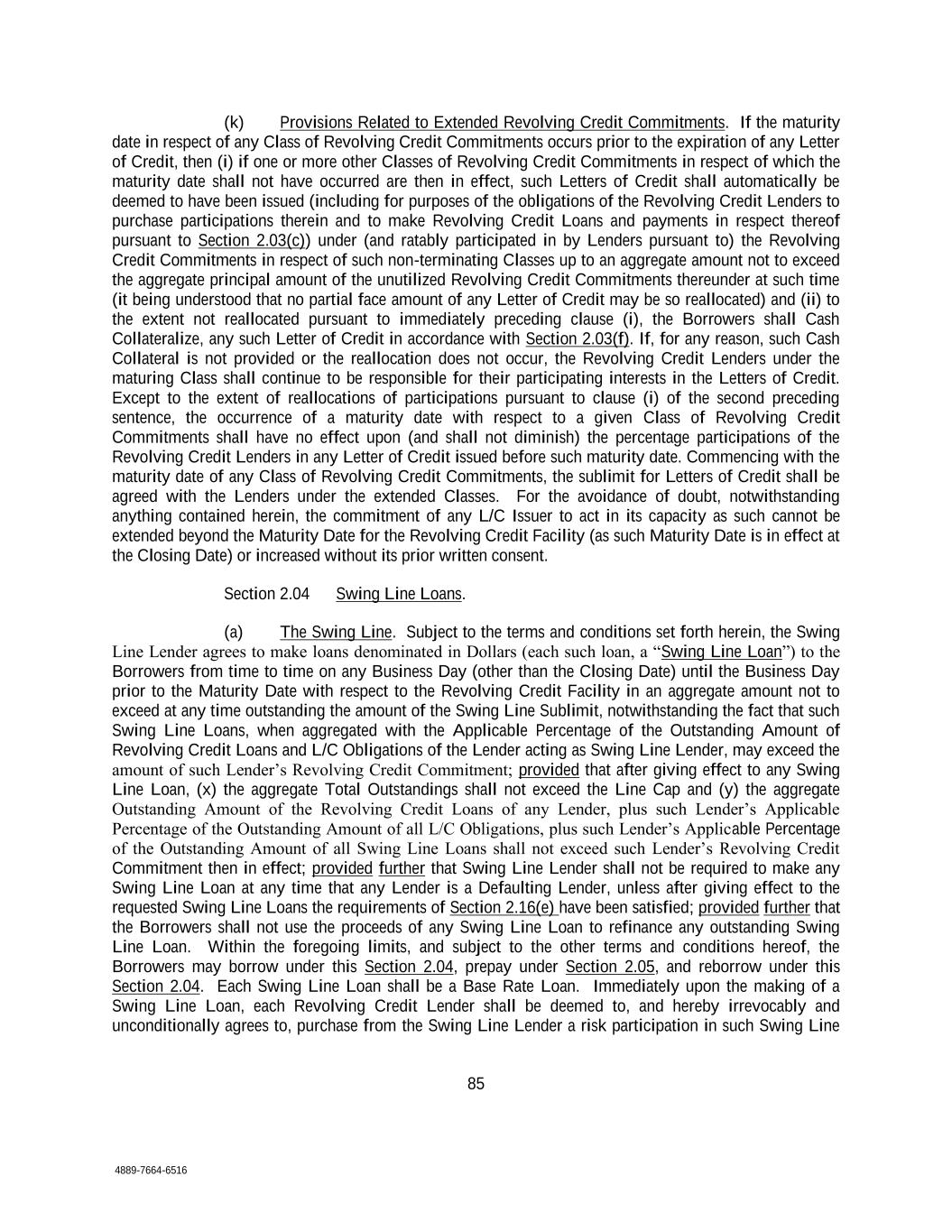 85 4889-7664-6516 (k) Provisions Related to Extended Revolving Credit Commitments. If the maturity date in respect of any Class of Revolving Credit Commitments occurs prior to the expiration of any Letter of Credit, then (i) if one or more other Classes of Revolving Credit Commitments in respect of which the maturity date shall not have occurred are then in effect, such Letters of Credit shall automatically be deemed to have been issued (including for purposes of the obligations of the Revolving Credit Lenders to purchase participations therein and to make Revolving Credit Loans and payments in respect thereof pursuant to Section 2.03(c)) under (and ratably participated in by Lenders pursuant to) the Revolving Credit Commitments in respect of such non-terminating Classes up to an aggregate amount not to exceed the aggregate principal amount of the unutilized Revolving Credit Commitments thereunder at such time (it being understood that no partial face amount of any Letter of Credit may be so reallocated) and (ii) to the extent not reallocated pursuant to immediately preceding clause (i), the Borrowers shall Cash Collateralize, any such Letter of Credit in accordance with Section 2.03(f). If, for any reason, such Cash Collateral is not provided or the reallocation does not occur, the Revolving Credit Lenders under the maturing Class shall continue to be responsible for their participating interests in the Letters of Credit. Except to the extent of reallocations of participations pursuant to clause (i) of the second preceding sentence, the occurrence of a maturity date with respect to a given Class of Revolving Credit Commitments shall have no effect upon (and shall not diminish) the percentage participations of the Revolving Credit Lenders in any Letter of Credit issued before such maturity date. Commencing with the maturity date of any Class of Revolving Credit Commitments, the sublimit for Letters of Credit shall be agreed with the Lenders under the extended Classes. For the avoidance of doubt, notwithstanding anything contained herein, the commitment of any L/C Issuer to act in its capacity as such cannot be extended beyond the Maturity Date for the Revolving Credit Facility (as such Maturity Date is in effect at the Closing Date) or increased without its prior written consent. Section 2.04 Swing Line Loans. (a) The Swing Line. Subject to the terms and conditions set forth herein, the Swing Line Lender agrees to make loans denominated in Dollars (each such loan, a “Swing Line Loan”) to the Borrowers from time to time on any Business Day (other than the Closing Date) until the Business Day prior to the Maturity Date with respect to the Revolving Credit Facility in an aggregate amount not to exceed at any time outstanding the amount of the Swing Line Sublimit, notwithstanding the fact that such Swing Line Loans, when aggregated with the Applicable Percentage of the Outstanding Amount of Revolving Credit Loans and L/C Obligations of the Lender acting as Swing Line Lender, may exceed the amount of such Lender’s Revolving Credit Commitment; provided that after giving effect to any Swing Line Loan, (x) the aggregate Total Outstandings shall not exceed the Line Cap and (y) the aggregate Outstanding Amount of the Revolving Credit Loans of any Lender, plus such Lender’s Applicable Percentage of the Outstanding Amount of all L/C Obligations, plus such Lender’s Applicable Percentage of the Outstanding Amount of all Swing Line Loans shall not exceed such Lender’s Revolving Credit Commitment then in effect; provided further that Swing Line Lender shall not be required to make any Swing Line Loan at any time that any Lender is a Defaulting Lender, unless after giving effect to the requested Swing Line Loans the requirements of Section 2.16(e) have been satisfied; provided further that the Borrowers shall not use the proceeds of any Swing Line Loan to refinance any outstanding Swing Line Loan. Within the foregoing limits, and subject to the other terms and conditions hereof, the Borrowers may borrow under this Section 2.04, prepay under Section 2.05, and reborrow under this Section 2.04. Each Swing Line Loan shall be a Base Rate Loan. Immediately upon the making of a Swing Line Loan, each Revolving Credit Lender shall be deemed to, and hereby irrevocably and unconditionally agrees to, purchase from the Swing Line Lender a risk participation in such Swing Line