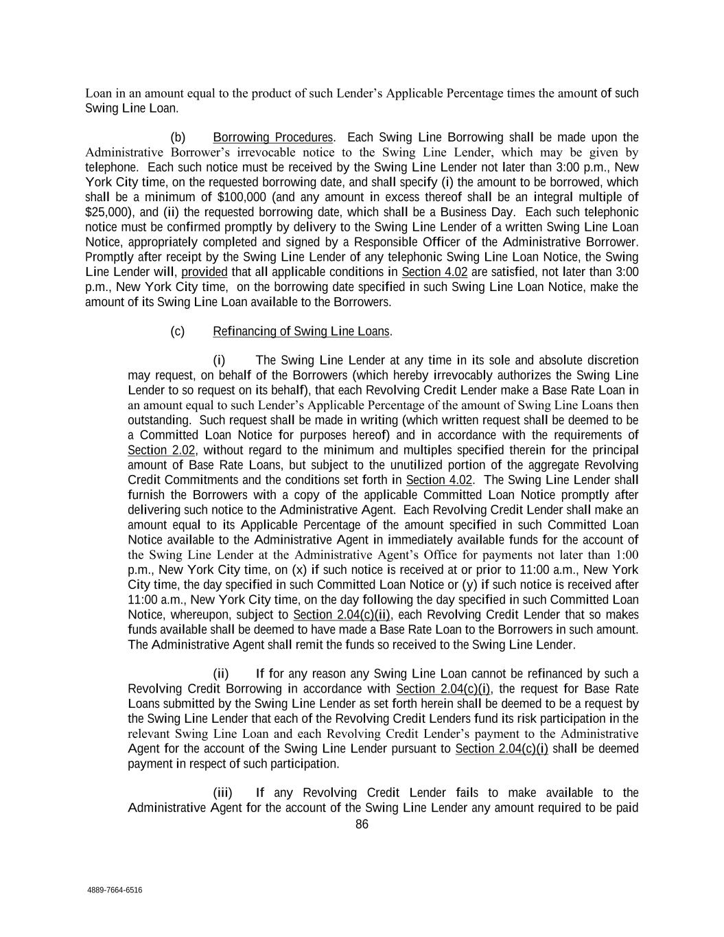 86 4889-7664-6516 Loan in an amount equal to the product of such Lender’s Applicable Percentage times the amount of such Swing Line Loan. (b) Borrowing Procedures. Each Swing Line Borrowing shall be made upon the Administrative Borrower’s irrevocable notice to the Swing Line Lender, which may be given by telephone. Each such notice must be received by the Swing Line Lender not later than 3:00 p.m., New York City time, on the requested borrowing date, and shall specify (i) the amount to be borrowed, which shall be a minimum of $100,000 (and any amount in excess thereof shall be an integral multiple of $25,000), and (ii) the requested borrowing date, which shall be a Business Day. Each such telephonic notice must be confirmed promptly by delivery to the Swing Line Lender of a written Swing Line Loan Notice, appropriately completed and signed by a Responsible Officer of the Administrative Borrower. Promptly after receipt by the Swing Line Lender of any telephonic Swing Line Loan Notice, the Swing Line Lender will, provided that all applicable conditions in Section 4.02 are satisfied, not later than 3:00 p.m., New York City time, on the borrowing date specified in such Swing Line Loan Notice, make the amount of its Swing Line Loan available to the Borrowers. (c) Refinancing of Swing Line Loans. (i) The Swing Line Lender at any time in its sole and absolute discretion may request, on behalf of the Borrowers (which hereby irrevocably authorizes the Swing Line Lender to so request on its behalf), that each Revolving Credit Lender make a Base Rate Loan in an amount equal to such Lender’s Applicable Percentage of the amount of Swing Line Loans then outstanding. Such request shall be made in writing (which written request shall be deemed to be a Committed Loan Notice for purposes hereof) and in accordance with the requirements of Section 2.02, without regard to the minimum and multiples specified therein for the principal amount of Base Rate Loans, but subject to the unutilized portion of the aggregate Revolving Credit Commitments and the conditions set forth in Section 4.02. The Swing Line Lender shall furnish the Borrowers with a copy of the applicable Committed Loan Notice promptly after delivering such notice to the Administrative Agent. Each Revolving Credit Lender shall make an amount equal to its Applicable Percentage of the amount specified in such Committed Loan Notice available to the Administrative Agent in immediately available funds for the account of the Swing Line Lender at the Administrative Agent’s Office for payments not later than 1:00 p.m., New York City time, on (x) if such notice is received at or prior to 11:00 a.m., New York City time, the day specified in such Committed Loan Notice or (y) if such notice is received after 11:00 a.m., New York City time, on the day following the day specified in such Committed Loan Notice, whereupon, subject to Section 2.04(c)(ii), each Revolving Credit Lender that so makes funds available shall be deemed to have made a Base Rate Loan to the Borrowers in such amount. The Administrative Agent shall remit the funds so received to the Swing Line Lender. (ii) If for any reason any Swing Line Loan cannot be refinanced by such a Revolving Credit Borrowing in accordance with Section 2.04(c)(i), the request for Base Rate Loans submitted by the Swing Line Lender as set forth herein shall be deemed to be a request by the Swing Line Lender that each of the Revolving Credit Lenders fund its risk participation in the relevant Swing Line Loan and each Revolving Credit Lender’s payment to the Administrative Agent for the account of the Swing Line Lender pursuant to Section 2.04(c)(i) shall be deemed payment in respect of such participation. (iii) If any Revolving Credit Lender fails to make available to the Administrative Agent for the account of the Swing Line Lender any amount required to be paid