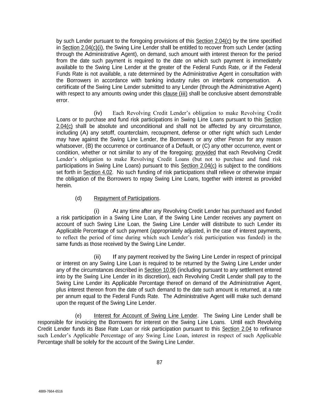 87 4889-7664-6516 by such Lender pursuant to the foregoing provisions of this Section 2.04(c) by the time specified in Section 2.04(c)(i), the Swing Line Lender shall be entitled to recover from such Lender (acting through the Administrative Agent), on demand, such amount with interest thereon for the period from the date such payment is required to the date on which such payment is immediately available to the Swing Line Lender at the greater of the Federal Funds Rate, or if the Federal Funds Rate is not available, a rate determined by the Administrative Agent in consultation with the Borrowers in accordance with banking industry rules on interbank compensation. A certificate of the Swing Line Lender submitted to any Lender (through the Administrative Agent) with respect to any amounts owing under this clause (iii) shall be conclusive absent demonstrable error. (iv) Each Revolving Credit Lender’s obligation to make Revolving Credit Loans or to purchase and fund risk participations in Swing Line Loans pursuant to this Section 2.04(c) shall be absolute and unconditional and shall not be affected by any circumstance, including (A) any setoff, counterclaim, recoupment, defense or other right which such Lender may have against the Swing Line Lender, the Borrowers or any other Person for any reason whatsoever, (B) the occurrence or continuance of a Default, or (C) any other occurrence, event or condition, whether or not similar to any of the foregoing; provided that each Revolving Credit Lender’s obligation to make Revolving Credit Loans (but not to purchase and fund risk participations in Swing Line Loans) pursuant to this Section 2.04(c) is subject to the conditions set forth in Section 4.02. No such funding of risk participations shall relieve or otherwise impair the obligation of the Borrowers to repay Swing Line Loans, together with interest as provided herein. (d) Repayment of Participations. (i) At any time after any Revolving Credit Lender has purchased and funded a risk participation in a Swing Line Loan, if the Swing Line Lender receives any payment on account of such Swing Line Loan, the Swing Line Lender will distribute to such Lender its Applicable Percentage of such payment (appropriately adjusted, in the case of interest payments, to reflect the period of time during which such Lender’s risk participation was funded) in the same funds as those received by the Swing Line Lender. (ii) If any payment received by the Swing Line Lender in respect of principal or interest on any Swing Line Loan is required to be returned by the Swing Line Lender under any of the circumstances described in Section 10.06 (including pursuant to any settlement entered into by the Swing Line Lender in its discretion), each Revolving Credit Lender shall pay to the Swing Line Lender its Applicable Percentage thereof on demand of the Administrative Agent, plus interest thereon from the date of such demand to the date such amount is returned, at a rate per annum equal to the Federal Funds Rate. The Administrative Agent will make such demand upon the request of the Swing Line Lender. (e) Interest for Account of Swing Line Lender. The Swing Line Lender shall be responsible for invoicing the Borrowers for interest on the Swing Line Loans. Until each Revolving Credit Lender funds its Base Rate Loan or risk participation pursuant to this Section 2.04 to refinance such Lender’s Applicable Percentage of any Swing Line Loan, interest in respect of such Applicable Percentage shall be solely for the account of the Swing Line Lender.
