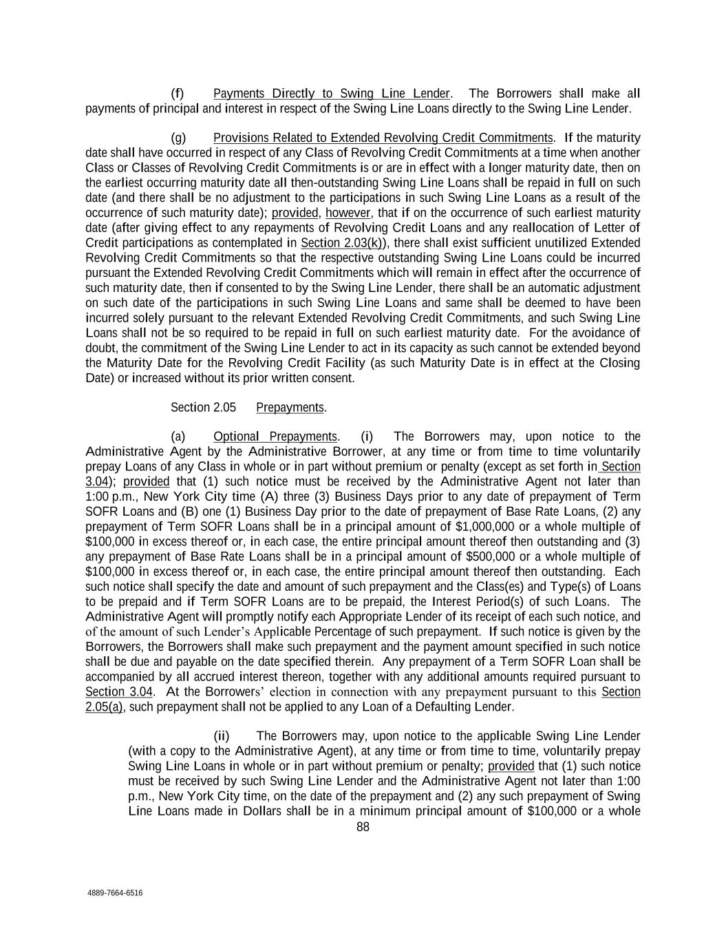 88 4889-7664-6516 (f) Payments Directly to Swing Line Lender. The Borrowers shall make all payments of principal and interest in respect of the Swing Line Loans directly to the Swing Line Lender. (g) Provisions Related to Extended Revolving Credit Commitments. If the maturity date shall have occurred in respect of any Class of Revolving Credit Commitments at a time when another Class or Classes of Revolving Credit Commitments is or are in effect with a longer maturity date, then on the earliest occurring maturity date all then-outstanding Swing Line Loans shall be repaid in full on such date (and there shall be no adjustment to the participations in such Swing Line Loans as a result of the occurrence of such maturity date); provided, however, that if on the occurrence of such earliest maturity date (after giving effect to any repayments of Revolving Credit Loans and any reallocation of Letter of Credit participations as contemplated in Section 2.03(k)), there shall exist sufficient unutilized Extended Revolving Credit Commitments so that the respective outstanding Swing Line Loans could be incurred pursuant the Extended Revolving Credit Commitments which will remain in effect after the occurrence of such maturity date, then if consented to by the Swing Line Lender, there shall be an automatic adjustment on such date of the participations in such Swing Line Loans and same shall be deemed to have been incurred solely pursuant to the relevant Extended Revolving Credit Commitments, and such Swing Line Loans shall not be so required to be repaid in full on such earliest maturity date. For the avoidance of doubt, the commitment of the Swing Line Lender to act in its capacity as such cannot be extended beyond the Maturity Date for the Revolving Credit Facility (as such Maturity Date is in effect at the Closing Date) or increased without its prior written consent. Section 2.05 Prepayments. (a) Optional Prepayments. (i) The Borrowers may, upon notice to the Administrative Agent by the Administrative Borrower, at any time or from time to time voluntarily prepay Loans of any Class in whole or in part without premium or penalty (except as set forth in Section 3.04); provided that (1) such notice must be received by the Administrative Agent not later than 1:00 p.m., New York City time (A) three (3) Business Days prior to any date of prepayment of Term SOFR Loans and (B) one (1) Business Day prior to the date of prepayment of Base Rate Loans, (2) any prepayment of Term SOFR Loans shall be in a principal amount of $1,000,000 or a whole multiple of $100,000 in excess thereof or, in each case, the entire principal amount thereof then outstanding and (3) any prepayment of Base Rate Loans shall be in a principal amount of $500,000 or a whole multiple of $100,000 in excess thereof or, in each case, the entire principal amount thereof then outstanding. Each such notice shall specify the date and amount of such prepayment and the Class(es) and Type(s) of Loans to be prepaid and if Term SOFR Loans are to be prepaid, the Interest Period(s) of such Loans. The Administrative Agent will promptly notify each Appropriate Lender of its receipt of each such notice, and of the amount of such Lender’s Applicable Percentage of such prepayment. If such notice is given by the Borrowers, the Borrowers shall make such prepayment and the payment amount specified in such notice shall be due and payable on the date specified therein. Any prepayment of a Term SOFR Loan shall be accompanied by all accrued interest thereon, together with any additional amounts required pursuant to Section 3.04. At the Borrowers’ election in connection with any prepayment pursuant to this Section 2.05(a), such prepayment shall not be applied to any Loan of a Defaulting Lender. (ii) The Borrowers may, upon notice to the applicable Swing Line Lender (with a copy to the Administrative Agent), at any time or from time to time, voluntarily prepay Swing Line Loans in whole or in part without premium or penalty; provided that (1) such notice must be received by such Swing Line Lender and the Administrative Agent not later than 1:00 p.m., New York City time, on the date of the prepayment and (2) any such prepayment of Swing Line Loans made in Dollars shall be in a minimum principal amount of $100,000 or a whole