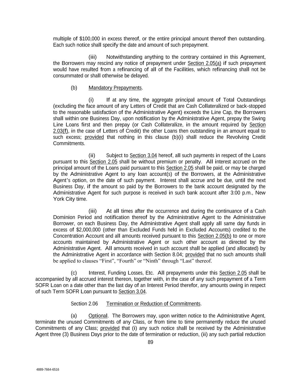 89 4889-7664-6516 multiple of $100,000 in excess thereof, or the entire principal amount thereof then outstanding. Each such notice shall specify the date and amount of such prepayment. (iii) Notwithstanding anything to the contrary contained in this Agreement, the Borrowers may rescind any notice of prepayment under Section 2.05(a) if such prepayment would have resulted from a refinancing of all of the Facilities, which refinancing shall not be consummated or shall otherwise be delayed. (b) Mandatory Prepayments. (i) If at any time, the aggregate principal amount of Total Outstandings (excluding the face amount of any Letters of Credit that are Cash Collateralized or back-stopped to the reasonable satisfaction of the Administrative Agent) exceeds the Line Cap, the Borrowers shall within one Business Day, upon notification by the Administrative Agent, prepay the Swing Line Loans first and then prepay (or Cash Collateralize, in the amount required by Section 2.03(f), in the case of Letters of Credit) the other Loans then outstanding in an amount equal to such excess; provided that nothing in this clause (b)(i) shall reduce the Revolving Credit Commitments. (ii) Subject to Section 3.04 hereof, all such payments in respect of the Loans pursuant to this Section 2.05 shall be without premium or penalty. All interest accrued on the principal amount of the Loans paid pursuant to this Section 2.05 shall be paid, or may be charged by the Administrative Agent to any loan account(s) of the Borrowers, at the Administrative Agent’s option, on the date of such payment. Interest shall accrue and be due, until the next Business Day, if the amount so paid by the Borrowers to the bank account designated by the Administrative Agent for such purpose is received in such bank account after 3:00 p.m., New York City time. (iii) At all times after the occurrence and during the continuance of a Cash Dominion Period and notification thereof by the Administrative Agent to the Administrative Borrower, on each Business Day, the Administrative Agent shall apply all same day funds in excess of $2,000,000 (other than Excluded Funds held in Excluded Accounts) credited to the Concentration Account and all amounts received pursuant to this Section 2.05(b) to one or more accounts maintained by Administrative Agent or such other account as directed by the Administrative Agent. All amounts received in such account shall be applied (and allocated) by the Administrative Agent in accordance with Section 8.04; provided that no such amounts shall be applied to clauses “First”, “Fourth” or “Ninth” through “Last” thereof. (c) Interest, Funding Losses, Etc. All prepayments under this Section 2.05 shall be accompanied by all accrued interest thereon, together with, in the case of any such prepayment of a Term SOFR Loan on a date other than the last day of an Interest Period therefor, any amounts owing in respect of such Term SOFR Loan pursuant to Section 3.04. Section 2.06 Termination or Reduction of Commitments. (a) Optional. The Borrowers may, upon written notice to the Administrative Agent, terminate the unused Commitments of any Class, or from time to time permanently reduce the unused Commitments of any Class; provided that (i) any such notice shall be received by the Administrative Agent three (3) Business Days prior to the date of termination or reduction, (ii) any such partial reduction