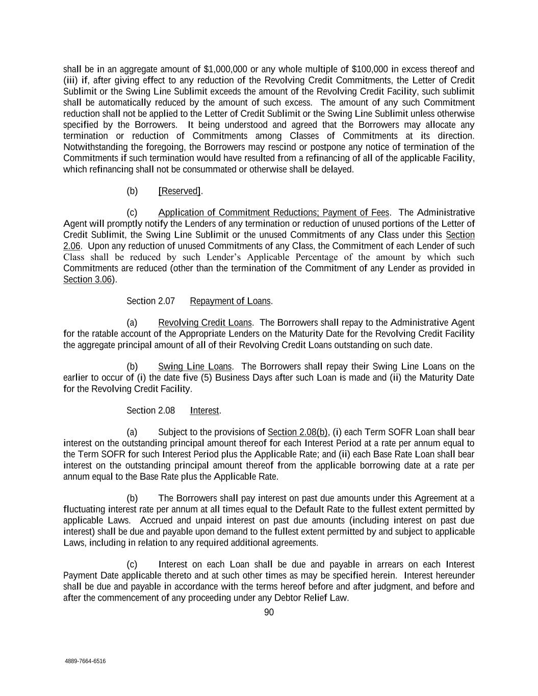 90 4889-7664-6516 shall be in an aggregate amount of $1,000,000 or any whole multiple of $100,000 in excess thereof and (iii) if, after giving effect to any reduction of the Revolving Credit Commitments, the Letter of Credit Sublimit or the Swing Line Sublimit exceeds the amount of the Revolving Credit Facility, such sublimit shall be automatically reduced by the amount of such excess. The amount of any such Commitment reduction shall not be applied to the Letter of Credit Sublimit or the Swing Line Sublimit unless otherwise specified by the Borrowers. It being understood and agreed that the Borrowers may allocate any termination or reduction of Commitments among Classes of Commitments at its direction. Notwithstanding the foregoing, the Borrowers may rescind or postpone any notice of termination of the Commitments if such termination would have resulted from a refinancing of all of the applicable Facility, which refinancing shall not be consummated or otherwise shall be delayed. (b) [Reserved]. (c) Application of Commitment Reductions; Payment of Fees. The Administrative Agent will promptly notify the Lenders of any termination or reduction of unused portions of the Letter of Credit Sublimit, the Swing Line Sublimit or the unused Commitments of any Class under this Section 2.06. Upon any reduction of unused Commitments of any Class, the Commitment of each Lender of such Class shall be reduced by such Lender’s Applicable Percentage of the amount by which such Commitments are reduced (other than the termination of the Commitment of any Lender as provided in Section 3.06). Section 2.07 Repayment of Loans. (a) Revolving Credit Loans. The Borrowers shall repay to the Administrative Agent for the ratable account of the Appropriate Lenders on the Maturity Date for the Revolving Credit Facility the aggregate principal amount of all of their Revolving Credit Loans outstanding on such date. (b) Swing Line Loans. The Borrowers shall repay their Swing Line Loans on the earlier to occur of (i) the date five (5) Business Days after such Loan is made and (ii) the Maturity Date for the Revolving Credit Facility. Section 2.08 Interest. (a) Subject to the provisions of Section 2.08(b), (i) each Term SOFR Loan shall bear interest on the outstanding principal amount thereof for each Interest Period at a rate per annum equal to the Term SOFR for such Interest Period plus the Applicable Rate; and (ii) each Base Rate Loan shall bear interest on the outstanding principal amount thereof from the applicable borrowing date at a rate per annum equal to the Base Rate plus the Applicable Rate. (b) The Borrowers shall pay interest on past due amounts under this Agreement at a fluctuating interest rate per annum at all times equal to the Default Rate to the fullest extent permitted by applicable Laws. Accrued and unpaid interest on past due amounts (including interest on past due interest) shall be due and payable upon demand to the fullest extent permitted by and subject to applicable Laws, including in relation to any required additional agreements. (c) Interest on each Loan shall be due and payable in arrears on each Interest Payment Date applicable thereto and at such other times as may be specified herein. Interest hereunder shall be due and payable in accordance with the terms hereof before and after judgment, and before and after the commencement of any proceeding under any Debtor Relief Law.