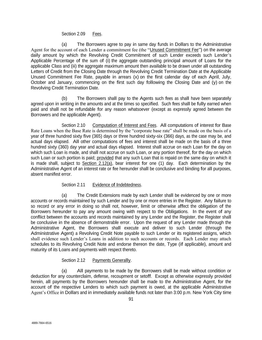 91 4889-7664-6516 Section 2.09 Fees. (a) The Borrowers agree to pay in same day funds in Dollars to the Administrative Agent for the account of each Lender a commitment fee (the “Unused Commitment Fee”) on the average daily amount by which the Revolving Credit Commitment of such Lender exceeds such Lender’s Applicable Percentage of the sum of (i) the aggregate outstanding principal amount of Loans for the applicable Class and (ii) the aggregate maximum amount then available to be drawn under all outstanding Letters of Credit from the Closing Date through the Revolving Credit Termination Date at the Applicable Unused Commitment Fee Rate, payable in arrears (x) on the first calendar day of each April, July, October and January, commencing on the first such day following the Closing Date and (y) on the Revolving Credit Termination Date. (b) The Borrowers shall pay to the Agents such fees as shall have been separately agreed upon in writing in the amounts and at the times so specified. Such fees shall be fully earned when paid and shall not be refundable for any reason whatsoever (except as expressly agreed between the Borrowers and the applicable Agent). Section 2.10 Computation of Interest and Fees. All computations of interest for Base Rate Loans when the Base Rate is determined by the “corporate base rate” shall be made on the basis of a year of three hundred sixty five (365) days or three hundred sixty-six (366) days, as the case may be, and actual days elapsed. All other computations of fees and interest shall be made on the basis of a three hundred sixty (360) day year and actual days elapsed. Interest shall accrue on each Loan for the day on which such Loan is made, and shall not accrue on such Loan, or any portion thereof, for the day on which such Loan or such portion is paid; provided that any such Loan that is repaid on the same day on which it is made shall, subject to Section 2.12(a), bear interest for one (1) day. Each determination by the Administrative Agent of an interest rate or fee hereunder shall be conclusive and binding for all purposes, absent manifest error. Section 2.11 Evidence of Indebtedness. (a) The Credit Extensions made by each Lender shall be evidenced by one or more accounts or records maintained by such Lender and by one or more entries in the Register. Any failure to so record or any error in doing so shall not, however, limit or otherwise affect the obligation of the Borrowers hereunder to pay any amount owing with respect to the Obligations. In the event of any conflict between the accounts and records maintained by any Lender and the Register, the Register shall be conclusive in the absence of demonstrable error. Upon the request of any Lender made through the Administrative Agent, the Borrowers shall execute and deliver to such Lender (through the Administrative Agent) a Revolving Credit Note payable to such Lender or its registered assigns, which shall evidence such Lender’s Loans in addition to such accounts or records. Each Lender may attach schedules to its Revolving Credit Note and endorse thereon the date, Type (if applicable), amount and maturity of its Loans and payments with respect thereto. Section 2.12 Payments Generally. (a) All payments to be made by the Borrowers shall be made without condition or deduction for any counterclaim, defense, recoupment or setoff. Except as otherwise expressly provided herein, all payments by the Borrowers hereunder shall be made to the Administrative Agent, for the account of the respective Lenders to which such payment is owed, at the applicable Administrative Agent’s Office in Dollars and in immediately available funds not later than 3:00 p.m. New York City time