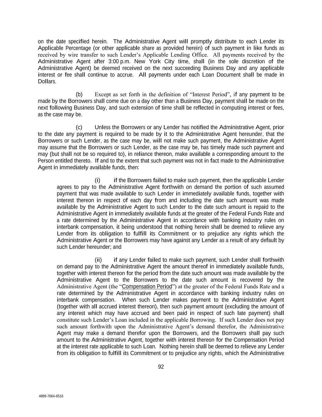 92 4889-7664-6516 on the date specified herein. The Administrative Agent will promptly distribute to each Lender its Applicable Percentage (or other applicable share as provided herein) of such payment in like funds as received by wire transfer to such Lender’s Applicable Lending Office. All payments received by the Administrative Agent after 3:00 p.m. New York City time, shall (in the sole discretion of the Administrative Agent) be deemed received on the next succeeding Business Day and any applicable interest or fee shall continue to accrue. All payments under each Loan Document shall be made in Dollars. (b) Except as set forth in the definition of “Interest Period”, if any payment to be made by the Borrowers shall come due on a day other than a Business Day, payment shall be made on the next following Business Day, and such extension of time shall be reflected in computing interest or fees, as the case may be. (c) Unless the Borrowers or any Lender has notified the Administrative Agent, prior to the date any payment is required to be made by it to the Administrative Agent hereunder, that the Borrowers or such Lender, as the case may be, will not make such payment, the Administrative Agent may assume that the Borrowers or such Lender, as the case may be, has timely made such payment and may (but shall not be so required to), in reliance thereon, make available a corresponding amount to the Person entitled thereto. If and to the extent that such payment was not in fact made to the Administrative Agent in immediately available funds, then: (i) if the Borrowers failed to make such payment, then the applicable Lender agrees to pay to the Administrative Agent forthwith on demand the portion of such assumed payment that was made available to such Lender in immediately available funds, together with interest thereon in respect of each day from and including the date such amount was made available by the Administrative Agent to such Lender to the date such amount is repaid to the Administrative Agent in immediately available funds at the greater of the Federal Funds Rate and a rate determined by the Administrative Agent in accordance with banking industry rules on interbank compensation, it being understood that nothing herein shall be deemed to relieve any Lender from its obligation to fulfill its Commitment or to prejudice any rights which the Administrative Agent or the Borrowers may have against any Lender as a result of any default by such Lender hereunder; and (ii) if any Lender failed to make such payment, such Lender shall forthwith on demand pay to the Administrative Agent the amount thereof in immediately available funds, together with interest thereon for the period from the date such amount was made available by the Administrative Agent to the Borrowers to the date such amount is recovered by the Administrative Agent (the “Compensation Period”) at the greater of the Federal Funds Rate and a rate determined by the Administrative Agent in accordance with banking industry rules on interbank compensation. When such Lender makes payment to the Administrative Agent (together with all accrued interest thereon), then such payment amount (excluding the amount of any interest which may have accrued and been paid in respect of such late payment) shall constitute such Lender’s Loan included in the applicable Borrowing. If such Lender does not pay such amount forthwith upon the Administrative Agent’s demand therefor, the Administrative Agent may make a demand therefor upon the Borrowers, and the Borrowers shall pay such amount to the Administrative Agent, together with interest thereon for the Compensation Period at the interest rate applicable to such Loan. Nothing herein shall be deemed to relieve any Lender from its obligation to fulfill its Commitment or to prejudice any rights, which the Administrative