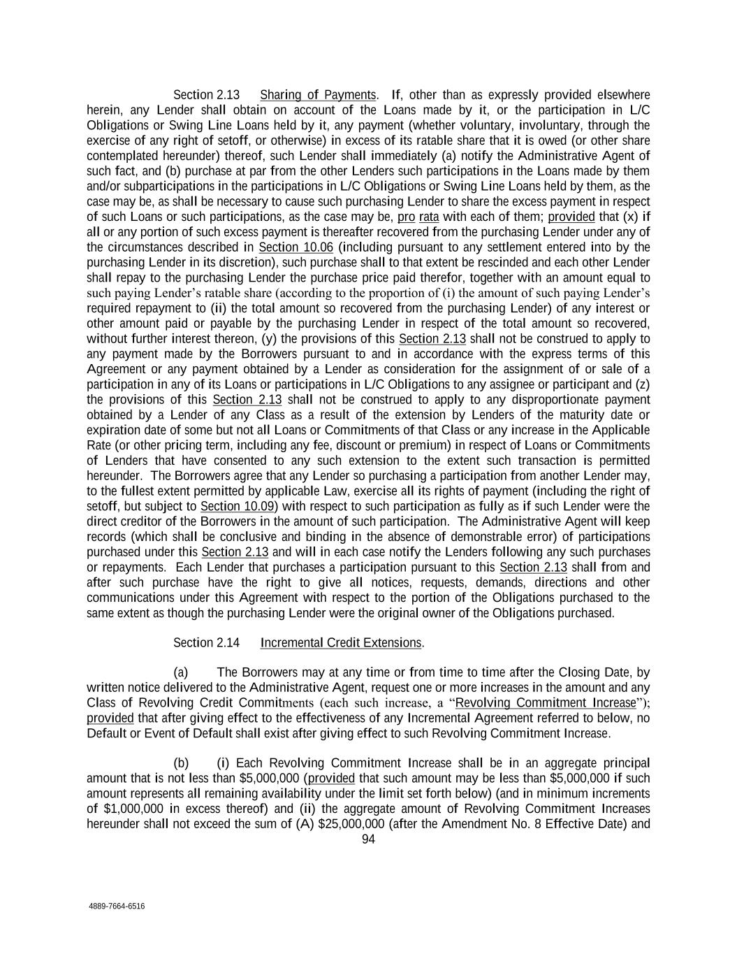 94 4889-7664-6516 Section 2.13 Sharing of Payments. If, other than as expressly provided elsewhere herein, any Lender shall obtain on account of the Loans made by it, or the participation in L/C Obligations or Swing Line Loans held by it, any payment (whether voluntary, involuntary, through the exercise of any right of setoff, or otherwise) in excess of its ratable share that it is owed (or other share contemplated hereunder) thereof, such Lender shall immediately (a) notify the Administrative Agent of such fact, and (b) purchase at par from the other Lenders such participations in the Loans made by them and/or subparticipations in the participations in L/C Obligations or Swing Line Loans held by them, as the case may be, as shall be necessary to cause such purchasing Lender to share the excess payment in respect of such Loans or such participations, as the case may be, pro rata with each of them; provided that (x) if all or any portion of such excess payment is thereafter recovered from the purchasing Lender under any of the circumstances described in Section 10.06 (including pursuant to any settlement entered into by the purchasing Lender in its discretion), such purchase shall to that extent be rescinded and each other Lender shall repay to the purchasing Lender the purchase price paid therefor, together with an amount equal to such paying Lender’s ratable share (according to the proportion of (i) the amount of such paying Lender’s required repayment to (ii) the total amount so recovered from the purchasing Lender) of any interest or other amount paid or payable by the purchasing Lender in respect of the total amount so recovered, without further interest thereon, (y) the provisions of this Section 2.13 shall not be construed to apply to any payment made by the Borrowers pursuant to and in accordance with the express terms of this Agreement or any payment obtained by a Lender as consideration for the assignment of or sale of a participation in any of its Loans or participations in L/C Obligations to any assignee or participant and (z) the provisions of this Section 2.13 shall not be construed to apply to any disproportionate payment obtained by a Lender of any Class as a result of the extension by Lenders of the maturity date or expiration date of some but not all Loans or Commitments of that Class or any increase in the Applicable Rate (or other pricing term, including any fee, discount or premium) in respect of Loans or Commitments of Lenders that have consented to any such extension to the extent such transaction is permitted hereunder. The Borrowers agree that any Lender so purchasing a participation from another Lender may, to the fullest extent permitted by applicable Law, exercise all its rights of payment (including the right of setoff, but subject to Section 10.09) with respect to such participation as fully as if such Lender were the direct creditor of the Borrowers in the amount of such participation. The Administrative Agent will keep records (which shall be conclusive and binding in the absence of demonstrable error) of participations purchased under this Section 2.13 and will in each case notify the Lenders following any such purchases or repayments. Each Lender that purchases a participation pursuant to this Section 2.13 shall from and after such purchase have the right to give all notices, requests, demands, directions and other communications under this Agreement with respect to the portion of the Obligations purchased to the same extent as though the purchasing Lender were the original owner of the Obligations purchased. Section 2.14 Incremental Credit Extensions. (a) The Borrowers may at any time or from time to time after the Closing Date, by written notice delivered to the Administrative Agent, request one or more increases in the amount and any Class of Revolving Credit Commitments (each such increase, a “Revolving Commitment Increase”); provided that after giving effect to the effectiveness of any Incremental Agreement referred to below, no Default or Event of Default shall exist after giving effect to such Revolving Commitment Increase. (b) (i) Each Revolving Commitment Increase shall be in an aggregate principal amount that is not less than $5,000,000 (provided that such amount may be less than $5,000,000 if such amount represents all remaining availability under the limit set forth below) (and in minimum increments of $1,000,000 in excess thereof) and (ii) the aggregate amount of Revolving Commitment Increases hereunder shall not exceed the sum of (A) $25,000,000 (after the Amendment No. 8 Effective Date) and
