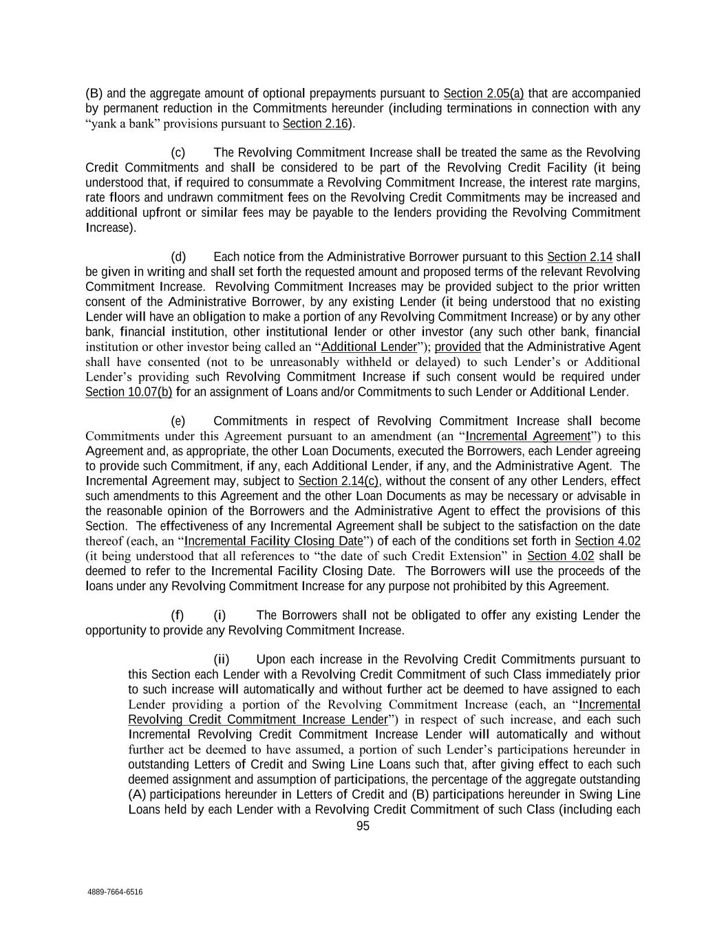 95 4889-7664-6516 (B) and the aggregate amount of optional prepayments pursuant to Section 2.05(a) that are accompanied by permanent reduction in the Commitments hereunder (including terminations in connection with any “yank a bank” provisions pursuant to Section 2.16). (c) The Revolving Commitment Increase shall be treated the same as the Revolving Credit Commitments and shall be considered to be part of the Revolving Credit Facility (it being understood that, if required to consummate a Revolving Commitment Increase, the interest rate margins, rate floors and undrawn commitment fees on the Revolving Credit Commitments may be increased and additional upfront or similar fees may be payable to the lenders providing the Revolving Commitment Increase). (d) Each notice from the Administrative Borrower pursuant to this Section 2.14 shall be given in writing and shall set forth the requested amount and proposed terms of the relevant Revolving Commitment Increase. Revolving Commitment Increases may be provided subject to the prior written consent of the Administrative Borrower, by any existing Lender (it being understood that no existing Lender will have an obligation to make a portion of any Revolving Commitment Increase) or by any other bank, financial institution, other institutional lender or other investor (any such other bank, financial institution or other investor being called an “Additional Lender”); provided that the Administrative Agent shall have consented (not to be unreasonably withheld or delayed) to such Lender’s or Additional Lender’s providing such Revolving Commitment Increase if such consent would be required under Section 10.07(b) for an assignment of Loans and/or Commitments to such Lender or Additional Lender. (e) Commitments in respect of Revolving Commitment Increase shall become Commitments under this Agreement pursuant to an amendment (an “Incremental Agreement”) to this Agreement and, as appropriate, the other Loan Documents, executed the Borrowers, each Lender agreeing to provide such Commitment, if any, each Additional Lender, if any, and the Administrative Agent. The Incremental Agreement may, subject to Section 2.14(c), without the consent of any other Lenders, effect such amendments to this Agreement and the other Loan Documents as may be necessary or advisable in the reasonable opinion of the Borrowers and the Administrative Agent to effect the provisions of this Section. The effectiveness of any Incremental Agreement shall be subject to the satisfaction on the date thereof (each, an “Incremental Facility Closing Date”) of each of the conditions set forth in Section 4.02 (it being understood that all references to “the date of such Credit Extension” in Section 4.02 shall be deemed to refer to the Incremental Facility Closing Date. The Borrowers will use the proceeds of the loans under any Revolving Commitment Increase for any purpose not prohibited by this Agreement. (f) (i) The Borrowers shall not be obligated to offer any existing Lender the opportunity to provide any Revolving Commitment Increase. (ii) Upon each increase in the Revolving Credit Commitments pursuant to this Section each Lender with a Revolving Credit Commitment of such Class immediately prior to such increase will automatically and without further act be deemed to have assigned to each Lender providing a portion of the Revolving Commitment Increase (each, an “Incremental Revolving Credit Commitment Increase Lender”) in respect of such increase, and each such Incremental Revolving Credit Commitment Increase Lender will automatically and without further act be deemed to have assumed, a portion of such Lender’s participations hereunder in outstanding Letters of Credit and Swing Line Loans such that, after giving effect to each such deemed assignment and assumption of participations, the percentage of the aggregate outstanding (A) participations hereunder in Letters of Credit and (B) participations hereunder in Swing Line Loans held by each Lender with a Revolving Credit Commitment of such Class (including each
