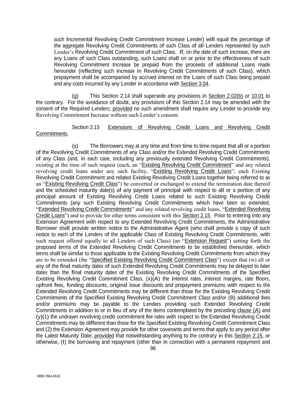 96 4889-7664-6516 such Incremental Revolving Credit Commitment Increase Lender) will equal the percentage of the aggregate Revolving Credit Commitments of such Class of all Lenders represented by such Lender’s Revolving Credit Commitment of such Class. If, on the date of such increase, there are any Loans of such Class outstanding, such Loans shall on or prior to the effectiveness of such Revolving Commitment Increase be prepaid from the proceeds of additional Loans made hereunder (reflecting such increase in Revolving Credit Commitments of such Class), which prepayment shall be accompanied by accrued interest on the Loans of such Class being prepaid and any costs incurred by any Lender in accordance with Section 3.04. (g) This Section 2.14 shall supersede any provisions in Section 2.02(b) or 10.01 to the contrary. For the avoidance of doubt, any provisions of this Section 2.14 may be amended with the consent of the Required Lenders; provided no such amendment shall require any Lender to provide any Revolving Commitment Increase without such Lender’s consent. Section 2.15 Extensions of Revolving Credit Loans and Revolving Credit Commitments. (a) The Borrowers may at any time and from time to time request that all or a portion of the Revolving Credit Commitments of any Class and/or the Extended Revolving Credit Commitments of any Class (and, in each case, including any previously extended Revolving Credit Commitments), existing at the time of such request (each, an “Existing Revolving Credit Commitment” and any related revolving credit loans under any such facility, “Existing Revolving Credit Loans”; each Existing Revolving Credit Commitment and related Existing Revolving Credit Loans together being referred to as an “Existing Revolving Credit Class”) be converted or exchanged to extend the termination date thereof and the scheduled maturity date(s) of any payment of principal with respect to all or a portion of any principal amount of Existing Revolving Credit Loans related to such Existing Revolving Credit Commitments (any such Existing Revolving Credit Commitments which have been so extended, “Extended Revolving Credit Commitments” and any related revolving credit loans, “Extended Revolving Credit Loans”) and to provide for other terms consistent with this Section 2.15. Prior to entering into any Extension Agreement with respect to any Extended Revolving Credit Commitments, the Administrative Borrower shall provide written notice to the Administrative Agent (who shall provide a copy of such notice to each of the Lenders of the applicable Class of Existing Revolving Credit Commitments, with such request offered equally to all Lenders of such Class) (an “Extension Request”) setting forth the proposed terms of the Extended Revolving Credit Commitments to be established thereunder, which terms shall be similar to those applicable to the Existing Revolving Credit Commitments from which they are to be extended (the “Specified Existing Revolving Credit Commitment Class”) except that (w) all or any of the final maturity dates of such Extended Revolving Credit Commitments may be delayed to later dates than the final maturity dates of the Existing Revolving Credit Commitments of the Specified Existing Revolving Credit Commitment Class, (x)(A) the interest rates, interest margins, rate floors, upfront fees, funding discounts, original issue discounts and prepayment premiums with respect to the Extended Revolving Credit Commitments may be different than those for the Existing Revolving Credit Commitments of the Specified Existing Revolving Credit Commitment Class and/or (B) additional fees and/or premiums may be payable to the Lenders providing such Extended Revolving Credit Commitments in addition to or in lieu of any of the items contemplated by the preceding clause (A) and (y)(1) the undrawn revolving credit commitment fee rates with respect to the Extended Revolving Credit Commitments may be different than those for the Specified Existing Revolving Credit Commitment Class and (2) the Extension Agreement may provide for other covenants and terms that apply to any period after the Latest Maturity Date; provided that notwithstanding anything to the contrary in this Section 2.15, or otherwise, (I) the borrowing and repayment (other than in connection with a permanent repayment and