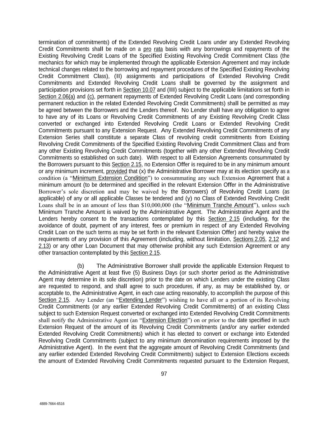 97 4889-7664-6516 termination of commitments) of the Extended Revolving Credit Loans under any Extended Revolving Credit Commitments shall be made on a pro rata basis with any borrowings and repayments of the Existing Revolving Credit Loans of the Specified Existing Revolving Credit Commitment Class (the mechanics for which may be implemented through the applicable Extension Agreement and may include technical changes related to the borrowing and repayment procedures of the Specified Existing Revolving Credit Commitment Class), (II) assignments and participations of Extended Revolving Credit Commitments and Extended Revolving Credit Loans shall be governed by the assignment and participation provisions set forth in Section 10.07 and (III) subject to the applicable limitations set forth in Section 2.06(a) and (c), permanent repayments of Extended Revolving Credit Loans (and corresponding permanent reduction in the related Extended Revolving Credit Commitments) shall be permitted as may be agreed between the Borrowers and the Lenders thereof. No Lender shall have any obligation to agree to have any of its Loans or Revolving Credit Commitments of any Existing Revolving Credit Class converted or exchanged into Extended Revolving Credit Loans or Extended Revolving Credit Commitments pursuant to any Extension Request. Any Extended Revolving Credit Commitments of any Extension Series shall constitute a separate Class of revolving credit commitments from Existing Revolving Credit Commitments of the Specified Existing Revolving Credit Commitment Class and from any other Existing Revolving Credit Commitments (together with any other Extended Revolving Credit Commitments so established on such date). With respect to all Extension Agreements consummated by the Borrowers pursuant to this Section 2.15, no Extension Offer is required to be in any minimum amount or any minimum increment, provided that (x) the Administrative Borrower may at its election specify as a condition (a “Minimum Extension Condition”) to consummating any such Extension Agreement that a minimum amount (to be determined and specified in the relevant Extension Offer in the Administrative Borrower’s sole discretion and may be waived by the Borrowers) of Revolving Credit Loans (as applicable) of any or all applicable Classes be tendered and (y) no Class of Extended Revolving Credit Loans shall be in an amount of less than $10,000,000 (the “Minimum Tranche Amount”), unless such Minimum Tranche Amount is waived by the Administrative Agent. The Administrative Agent and the Lenders hereby consent to the transactions contemplated by this Section 2.15 (including, for the avoidance of doubt, payment of any interest, fees or premium in respect of any Extended Revolving Credit Loan on the such terms as may be set forth in the relevant Extension Offer) and hereby waive the requirements of any provision of this Agreement (including, without limitation, Sections 2.05, 2.12 and 2.13) or any other Loan Document that may otherwise prohibit any such Extension Agreement or any other transaction contemplated by this Section 2.15. (b) The Administrative Borrower shall provide the applicable Extension Request to the Administrative Agent at least five (5) Business Days (or such shorter period as the Administrative Agent may determine in its sole discretion) prior to the date on which Lenders under the existing Class are requested to respond, and shall agree to such procedures, if any, as may be established by, or acceptable to, the Administrative Agent, in each case acting reasonably, to accomplish the purpose of this Section 2.15. Any Lender (an “Extending Lender”) wishing to have all or a portion of its Revolving Credit Commitments (or any earlier Extended Revolving Credit Commitments) of an existing Class subject to such Extension Request converted or exchanged into Extended Revolving Credit Commitments shall notify the Administrative Agent (an “Extension Election”) on or prior to the date specified in such Extension Request of the amount of its Revolving Credit Commitments (and/or any earlier extended Extended Revolving Credit Commitments) which it has elected to convert or exchange into Extended Revolving Credit Commitments (subject to any minimum denomination requirements imposed by the Administrative Agent). In the event that the aggregate amount of Revolving Credit Commitments (and any earlier extended Extended Revolving Credit Commitments) subject to Extension Elections exceeds the amount of Extended Revolving Credit Commitments requested pursuant to the Extension Request,