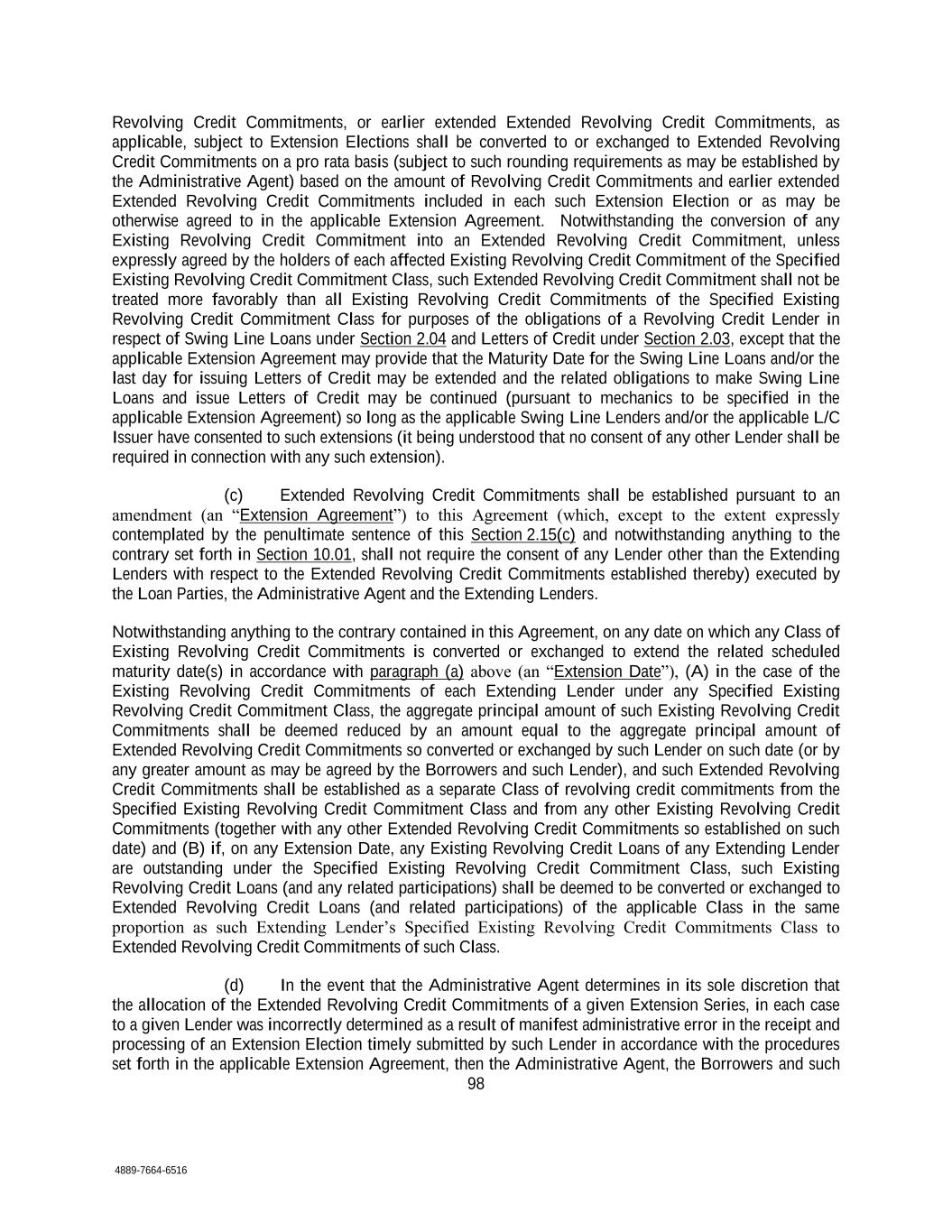 98 4889-7664-6516 Revolving Credit Commitments, or earlier extended Extended Revolving Credit Commitments, as applicable, subject to Extension Elections shall be converted to or exchanged to Extended Revolving Credit Commitments on a pro rata basis (subject to such rounding requirements as may be established by the Administrative Agent) based on the amount of Revolving Credit Commitments and earlier extended Extended Revolving Credit Commitments included in each such Extension Election or as may be otherwise agreed to in the applicable Extension Agreement. Notwithstanding the conversion of any Existing Revolving Credit Commitment into an Extended Revolving Credit Commitment, unless expressly agreed by the holders of each affected Existing Revolving Credit Commitment of the Specified Existing Revolving Credit Commitment Class, such Extended Revolving Credit Commitment shall not be treated more favorably than all Existing Revolving Credit Commitments of the Specified Existing Revolving Credit Commitment Class for purposes of the obligations of a Revolving Credit Lender in respect of Swing Line Loans under Section 2.04 and Letters of Credit under Section 2.03, except that the applicable Extension Agreement may provide that the Maturity Date for the Swing Line Loans and/or the last day for issuing Letters of Credit may be extended and the related obligations to make Swing Line Loans and issue Letters of Credit may be continued (pursuant to mechanics to be specified in the applicable Extension Agreement) so long as the applicable Swing Line Lenders and/or the applicable L/C Issuer have consented to such extensions (it being understood that no consent of any other Lender shall be required in connection with any such extension). (c) Extended Revolving Credit Commitments shall be established pursuant to an amendment (an “Extension Agreement”) to this Agreement (which, except to the extent expressly contemplated by the penultimate sentence of this Section 2.15(c) and notwithstanding anything to the contrary set forth in Section 10.01, shall not require the consent of any Lender other than the Extending Lenders with respect to the Extended Revolving Credit Commitments established thereby) executed by the Loan Parties, the Administrative Agent and the Extending Lenders. Notwithstanding anything to the contrary contained in this Agreement, on any date on which any Class of Existing Revolving Credit Commitments is converted or exchanged to extend the related scheduled maturity date(s) in accordance with paragraph (a) above (an “Extension Date”), (A) in the case of the Existing Revolving Credit Commitments of each Extending Lender under any Specified Existing Revolving Credit Commitment Class, the aggregate principal amount of such Existing Revolving Credit Commitments shall be deemed reduced by an amount equal to the aggregate principal amount of Extended Revolving Credit Commitments so converted or exchanged by such Lender on such date (or by any greater amount as may be agreed by the Borrowers and such Lender), and such Extended Revolving Credit Commitments shall be established as a separate Class of revolving credit commitments from the Specified Existing Revolving Credit Commitment Class and from any other Existing Revolving Credit Commitments (together with any other Extended Revolving Credit Commitments so established on such date) and (B) if, on any Extension Date, any Existing Revolving Credit Loans of any Extending Lender are outstanding under the Specified Existing Revolving Credit Commitment Class, such Existing Revolving Credit Loans (and any related participations) shall be deemed to be converted or exchanged to Extended Revolving Credit Loans (and related participations) of the applicable Class in the same proportion as such Extending Lender’s Specified Existing Revolving Credit Commitments Class to Extended Revolving Credit Commitments of such Class. (d) In the event that the Administrative Agent determines in its sole discretion that the allocation of the Extended Revolving Credit Commitments of a given Extension Series, in each case to a given Lender was incorrectly determined as a result of manifest administrative error in the receipt and processing of an Extension Election timely submitted by such Lender in accordance with the procedures set forth in the applicable Extension Agreement, then the Administrative Agent, the Borrowers and such
