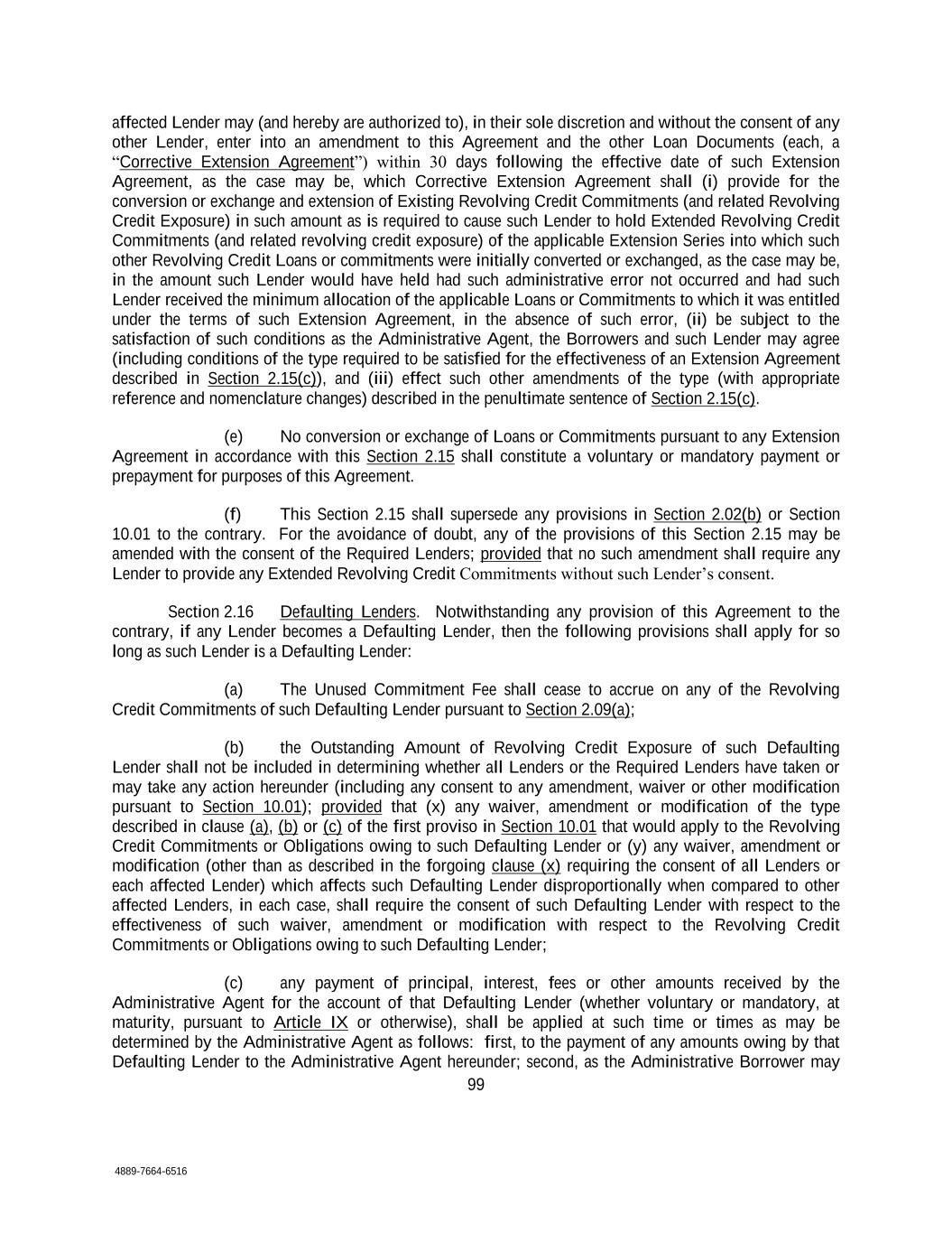 99 4889-7664-6516 affected Lender may (and hereby are authorized to), in their sole discretion and without the consent of any other Lender, enter into an amendment to this Agreement and the other Loan Documents (each, a “Corrective Extension Agreement”) within 30 days following the effective date of such Extension Agreement, as the case may be, which Corrective Extension Agreement shall (i) provide for the conversion or exchange and extension of Existing Revolving Credit Commitments (and related Revolving Credit Exposure) in such amount as is required to cause such Lender to hold Extended Revolving Credit Commitments (and related revolving credit exposure) of the applicable Extension Series into which such other Revolving Credit Loans or commitments were initially converted or exchanged, as the case may be, in the amount such Lender would have held had such administrative error not occurred and had such Lender received the minimum allocation of the applicable Loans or Commitments to which it was entitled under the terms of such Extension Agreement, in the absence of such error, (ii) be subject to the satisfaction of such conditions as the Administrative Agent, the Borrowers and such Lender may agree (including conditions of the type required to be satisfied for the effectiveness of an Extension Agreement described in Section 2.15(c)), and (iii) effect such other amendments of the type (with appropriate reference and nomenclature changes) described in the penultimate sentence of Section 2.15(c). (e) No conversion or exchange of Loans or Commitments pursuant to any Extension Agreement in accordance with this Section 2.15 shall constitute a voluntary or mandatory payment or prepayment for purposes of this Agreement. (f) This Section 2.15 shall supersede any provisions in Section 2.02(b) or Section 10.01 to the contrary. For the avoidance of doubt, any of the provisions of this Section 2.15 may be amended with the consent of the Required Lenders; provided that no such amendment shall require any Lender to provide any Extended Revolving Credit Commitments without such Lender’s consent. Section 2.16 Defaulting Lenders. Notwithstanding any provision of this Agreement to the contrary, if any Lender becomes a Defaulting Lender, then the following provisions shall apply for so long as such Lender is a Defaulting Lender: (a) The Unused Commitment Fee shall cease to accrue on any of the Revolving Credit Commitments of such Defaulting Lender pursuant to Section 2.09(a); (b) the Outstanding Amount of Revolving Credit Exposure of such Defaulting Lender shall not be included in determining whether all Lenders or the Required Lenders have taken or may take any action hereunder (including any consent to any amendment, waiver or other modification pursuant to Section 10.01); provided that (x) any waiver, amendment or modification of the type described in clause (a), (b) or (c) of the first proviso in Section 10.01 that would apply to the Revolving Credit Commitments or Obligations owing to such Defaulting Lender or (y) any waiver, amendment or modification (other than as described in the forgoing clause (x) requiring the consent of all Lenders or each affected Lender) which affects such Defaulting Lender disproportionally when compared to other affected Lenders, in each case, shall require the consent of such Defaulting Lender with respect to the effectiveness of such waiver, amendment or modification with respect to the Revolving Credit Commitments or Obligations owing to such Defaulting Lender; (c) any payment of principal, interest, fees or other amounts received by the Administrative Agent for the account of that Defaulting Lender (whether voluntary or mandatory, at maturity, pursuant to Article IX or otherwise), shall be applied at such time or times as may be determined by the Administrative Agent as follows: first, to the payment of any amounts owing by that Defaulting Lender to the Administrative Agent hereunder; second, as the Administrative Borrower may