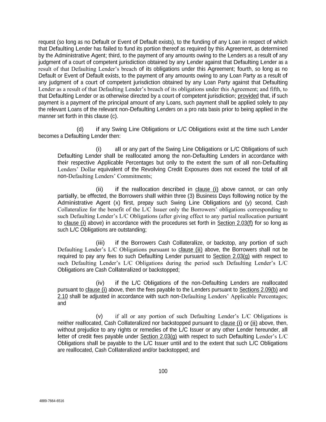100 4889-7664-6516 request (so long as no Default or Event of Default exists), to the funding of any Loan in respect of which that Defaulting Lender has failed to fund its portion thereof as required by this Agreement, as determined by the Administrative Agent; third, to the payment of any amounts owing to the Lenders as a result of any judgment of a court of competent jurisdiction obtained by any Lender against that Defaulting Lender as a result of that Defaulting Lender’s breach of its obligations under this Agreement; fourth, so long as no Default or Event of Default exists, to the payment of any amounts owing to any Loan Party as a result of any judgment of a court of competent jurisdiction obtained by any Loan Party against that Defaulting Lender as a result of that Defaulting Lender’s breach of its obligations under this Agreement; and fifth, to that Defaulting Lender or as otherwise directed by a court of competent jurisdiction; provided that, if such payment is a payment of the principal amount of any Loans, such payment shall be applied solely to pay the relevant Loans of the relevant non-Defaulting Lenders on a pro rata basis prior to being applied in the manner set forth in this clause (c). (d) if any Swing Line Obligations or L/C Obligations exist at the time such Lender becomes a Defaulting Lender then: (i) all or any part of the Swing Line Obligations or L/C Obligations of such Defaulting Lender shall be reallocated among the non-Defaulting Lenders in accordance with their respective Applicable Percentages but only to the extent the sum of all non-Defaulting Lenders’ Dollar equivalent of the Revolving Credit Exposures does not exceed the total of all non-Defaulting Lenders’ Commitments; (ii) if the reallocation described in clause (i) above cannot, or can only partially, be effected, the Borrowers shall within three (3) Business Days following notice by the Administrative Agent (x) first, prepay such Swing Line Obligations and (y) second, Cash Collateralize for the benefit of the L/C Issuer only the Borrowers’ obligations corresponding to such Defaulting Lender’s L/C Obligations (after giving effect to any partial reallocation pursuant to clause (i) above) in accordance with the procedures set forth in Section 2.03(f) for so long as such L/C Obligations are outstanding; (iii) if the Borrowers Cash Collateralize, or backstop, any portion of such Defaulting Lender’s L/C Obligations pursuant to clause (ii) above, the Borrowers shall not be required to pay any fees to such Defaulting Lender pursuant to Section 2.03(g) with respect to such Defaulting Lender’s L/C Obligations during the period such Defaulting Lender’s L/C Obligations are Cash Collateralized or backstopped; (iv) if the L/C Obligations of the non-Defaulting Lenders are reallocated pursuant to clause (i) above, then the fees payable to the Lenders pursuant to Sections 2.09(b) and 2.10 shall be adjusted in accordance with such non-Defaulting Lenders’ Applicable Percentages; and (v) if all or any portion of such Defaulting Lender’s L/C Obligations is neither reallocated, Cash Collateralized nor backstopped pursuant to clause (i) or (ii) above, then, without prejudice to any rights or remedies of the L/C Issuer or any other Lender hereunder, all letter of credit fees payable under Section 2.03(g) with respect to such Defaulting Lender’s L/C Obligations shall be payable to the L/C Issuer until and to the extent that such L/C Obligations are reallocated, Cash Collateralized and/or backstopped; and