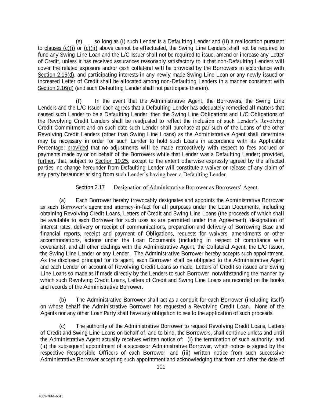 101 4889-7664-6516 (e) so long as (i) such Lender is a Defaulting Lender and (ii) a reallocation pursuant to clauses (c)(i) or (c)(ii) above cannot be effectuated, the Swing Line Lenders shall not be required to fund any Swing Line Loan and the L/C Issuer shall not be required to issue, amend or increase any Letter of Credit, unless it has received assurances reasonably satisfactory to it that non-Defaulting Lenders will cover the related exposure and/or cash collateral will be provided by the Borrowers in accordance with Section 2.16(d), and participating interests in any newly made Swing Line Loan or any newly issued or increased Letter of Credit shall be allocated among non-Defaulting Lenders in a manner consistent with Section 2.16(d) (and such Defaulting Lender shall not participate therein). (f) In the event that the Administrative Agent, the Borrowers, the Swing Line Lenders and the L/C Issuer each agrees that a Defaulting Lender has adequately remedied all matters that caused such Lender to be a Defaulting Lender, then the Swing Line Obligations and L/C Obligations of the Revolving Credit Lenders shall be readjusted to reflect the inclusion of such Lender’s Revolving Credit Commitment and on such date such Lender shall purchase at par such of the Loans of the other Revolving Credit Lenders (other than Swing Line Loans) as the Administrative Agent shall determine may be necessary in order for such Lender to hold such Loans in accordance with its Applicable Percentage; provided that no adjustments will be made retroactively with respect to fees accrued or payments made by or on behalf of the Borrowers while that Lender was a Defaulting Lender; provided, further, that, subject to Section 10.25, except to the extent otherwise expressly agreed by the affected parties, no change hereunder from Defaulting Lender will constitute a waiver or release of any claim of any party hereunder arising from such Lender’s having been a Defaulting Lender. Section 2.17 Designation of Administrative Borrower as Borrowers’ Agent. (a) Each Borrower hereby irrevocably designates and appoints the Administrative Borrower as such Borrower’s agent and attorney-in-fact for all purposes under the Loan Documents, including obtaining Revolving Credit Loans, Letters of Credit and Swing Line Loans (the proceeds of which shall be available to each Borrower for such uses as are permitted under this Agreement), designation of interest rates, delivery or receipt of communications, preparation and delivery of Borrowing Base and financial reports, receipt and payment of Obligations, requests for waivers, amendments or other accommodations, actions under the Loan Documents (including in respect of compliance with covenants), and all other dealings with the Administrative Agent, the Collateral Agent, the L/C Issuer, the Swing Line Lender or any Lender. The Administrative Borrower hereby accepts such appointment. As the disclosed principal for its agent, each Borrower shall be obligated to the Administrative Agent and each Lender on account of Revolving Credit Loans so made, Letters of Credit so issued and Swing Line Loans so made as if made directly by the Lenders to such Borrower, notwithstanding the manner by which such Revolving Credit Loans, Letters of Credit and Swing Line Loans are recorded on the books and records of the Administrative Borrower. (b) The Administrative Borrower shall act as a conduit for each Borrower (including itself) on whose behalf the Administrative Borrower has requested a Revolving Credit Loan. None of the Agents nor any other Loan Party shall have any obligation to see to the application of such proceeds. (c) The authority of the Administrative Borrower to request Revolving Credit Loans, Letters of Credit and Swing Line Loans on behalf of, and to bind, the Borrowers, shall continue unless and until the Administrative Agent actually receives written notice of: (i) the termination of such authority; and (ii) the subsequent appointment of a successor Administrative Borrower, which notice is signed by the respective Responsible Officers of each Borrower; and (iii) written notice from such successive Administrative Borrower accepting such appointment and acknowledging that from and after the date of