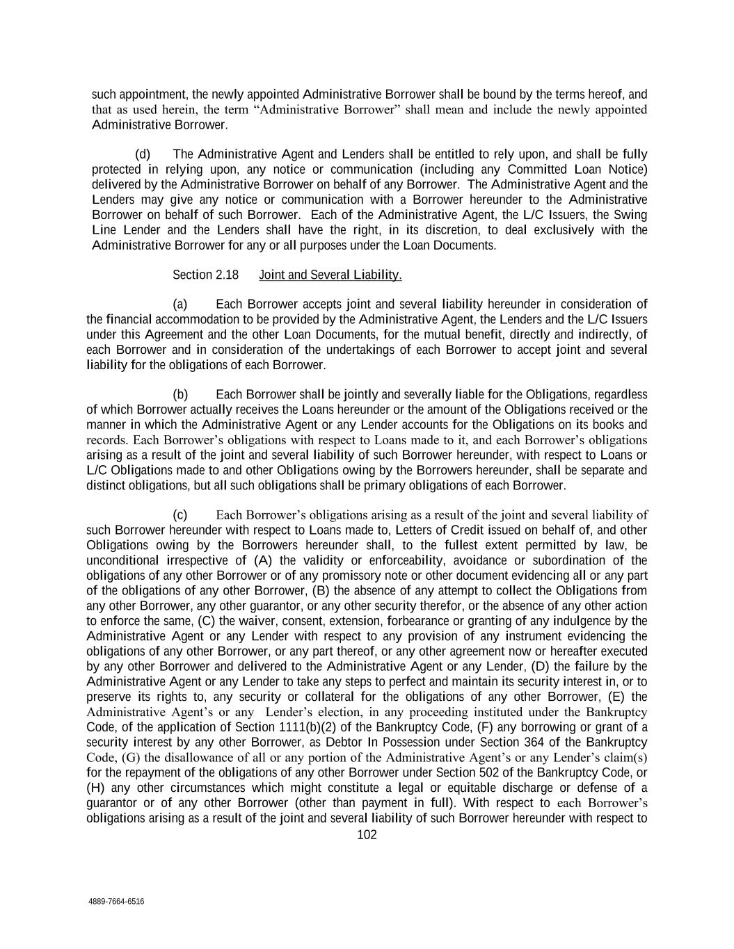102 4889-7664-6516 such appointment, the newly appointed Administrative Borrower shall be bound by the terms hereof, and that as used herein, the term “Administrative Borrower” shall mean and include the newly appointed Administrative Borrower. (d) The Administrative Agent and Lenders shall be entitled to rely upon, and shall be fully protected in relying upon, any notice or communication (including any Committed Loan Notice) delivered by the Administrative Borrower on behalf of any Borrower. The Administrative Agent and the Lenders may give any notice or communication with a Borrower hereunder to the Administrative Borrower on behalf of such Borrower. Each of the Administrative Agent, the L/C Issuers, the Swing Line Lender and the Lenders shall have the right, in its discretion, to deal exclusively with the Administrative Borrower for any or all purposes under the Loan Documents. Section 2.18 Joint and Several Liability. (a) Each Borrower accepts joint and several liability hereunder in consideration of the financial accommodation to be provided by the Administrative Agent, the Lenders and the L/C Issuers under this Agreement and the other Loan Documents, for the mutual benefit, directly and indirectly, of each Borrower and in consideration of the undertakings of each Borrower to accept joint and several liability for the obligations of each Borrower. (b) Each Borrower shall be jointly and severally liable for the Obligations, regardless of which Borrower actually receives the Loans hereunder or the amount of the Obligations received or the manner in which the Administrative Agent or any Lender accounts for the Obligations on its books and records. Each Borrower’s obligations with respect to Loans made to it, and each Borrower’s obligations arising as a result of the joint and several liability of such Borrower hereunder, with respect to Loans or L/C Obligations made to and other Obligations owing by the Borrowers hereunder, shall be separate and distinct obligations, but all such obligations shall be primary obligations of each Borrower. (c) Each Borrower’s obligations arising as a result of the joint and several liability of such Borrower hereunder with respect to Loans made to, Letters of Credit issued on behalf of, and other Obligations owing by the Borrowers hereunder shall, to the fullest extent permitted by law, be unconditional irrespective of (A) the validity or enforceability, avoidance or subordination of the obligations of any other Borrower or of any promissory note or other document evidencing all or any part of the obligations of any other Borrower, (B) the absence of any attempt to collect the Obligations from any other Borrower, any other guarantor, or any other security therefor, or the absence of any other action to enforce the same, (C) the waiver, consent, extension, forbearance or granting of any indulgence by the Administrative Agent or any Lender with respect to any provision of any instrument evidencing the obligations of any other Borrower, or any part thereof, or any other agreement now or hereafter executed by any other Borrower and delivered to the Administrative Agent or any Lender, (D) the failure by the Administrative Agent or any Lender to take any steps to perfect and maintain its security interest in, or to preserve its rights to, any security or collateral for the obligations of any other Borrower, (E) the Administrative Agent’s or any Lender’s election, in any proceeding instituted under the Bankruptcy Code, of the application of Section 1111(b)(2) of the Bankruptcy Code, (F) any borrowing or grant of a security interest by any other Borrower, as Debtor In Possession under Section 364 of the Bankruptcy Code, (G) the disallowance of all or any portion of the Administrative Agent’s or any Lender’s claim(s) for the repayment of the obligations of any other Borrower under Section 502 of the Bankruptcy Code, or (H) any other circumstances which might constitute a legal or equitable discharge or defense of a guarantor or of any other Borrower (other than payment in full). With respect to each Borrower’s obligations arising as a result of the joint and several liability of such Borrower hereunder with respect to