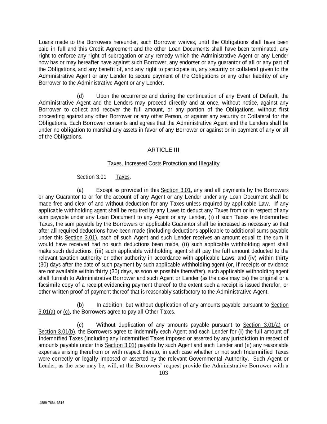 103 4889-7664-6516 Loans made to the Borrowers hereunder, such Borrower waives, until the Obligations shall have been paid in full and this Credit Agreement and the other Loan Documents shall have been terminated, any right to enforce any right of subrogation or any remedy which the Administrative Agent or any Lender now has or may hereafter have against such Borrower, any endorser or any guarantor of all or any part of the Obligations, and any benefit of, and any right to participate in, any security or collateral given to the Administrative Agent or any Lender to secure payment of the Obligations or any other liability of any Borrower to the Administrative Agent or any Lender. (d) Upon the occurrence and during the continuation of any Event of Default, the Administrative Agent and the Lenders may proceed directly and at once, without notice, against any Borrower to collect and recover the full amount, or any portion of the Obligations, without first proceeding against any other Borrower or any other Person, or against any security or Collateral for the Obligations. Each Borrower consents and agrees that the Administrative Agent and the Lenders shall be under no obligation to marshal any assets in favor of any Borrower or against or in payment of any or all of the Obligations. ARTICLE III Taxes, Increased Costs Protection and Illegality Section 3.01 Taxes. (a) Except as provided in this Section 3.01, any and all payments by the Borrowers or any Guarantor to or for the account of any Agent or any Lender under any Loan Document shall be made free and clear of and without deduction for any Taxes unless required by applicable Law. If any applicable withholding agent shall be required by any Laws to deduct any Taxes from or in respect of any sum payable under any Loan Document to any Agent or any Lender, (i) if such Taxes are Indemnified Taxes, the sum payable by the Borrowers or applicable Guarantor shall be increased as necessary so that after all required deductions have been made (including deductions applicable to additional sums payable under this Section 3.01), each of such Agent and such Lender receives an amount equal to the sum it would have received had no such deductions been made, (ii) such applicable withholding agent shall make such deductions, (iii) such applicable withholding agent shall pay the full amount deducted to the relevant taxation authority or other authority in accordance with applicable Laws, and (iv) within thirty (30) days after the date of such payment by such applicable withholding agent (or, if receipts or evidence are not available within thirty (30) days, as soon as possible thereafter), such applicable withholding agent shall furnish to Administrative Borrower and such Agent or Lender (as the case may be) the original or a facsimile copy of a receipt evidencing payment thereof to the extent such a receipt is issued therefor, or other written proof of payment thereof that is reasonably satisfactory to the Administrative Agent. (b) In addition, but without duplication of any amounts payable pursuant to Section 3.01(a) or (c), the Borrowers agree to pay all Other Taxes. (c) Without duplication of any amounts payable pursuant to Section 3.01(a) or Section 3.01(b), the Borrowers agree to indemnify each Agent and each Lender for (i) the full amount of Indemnified Taxes (including any Indemnified Taxes imposed or asserted by any jurisdiction in respect of amounts payable under this Section 3.01) payable by such Agent and such Lender and (ii) any reasonable expenses arising therefrom or with respect thereto, in each case whether or not such Indemnified Taxes were correctly or legally imposed or asserted by the relevant Governmental Authority. Such Agent or Lender, as the case may be, will, at the Borrowers’ request provide the Administrative Borrower with a