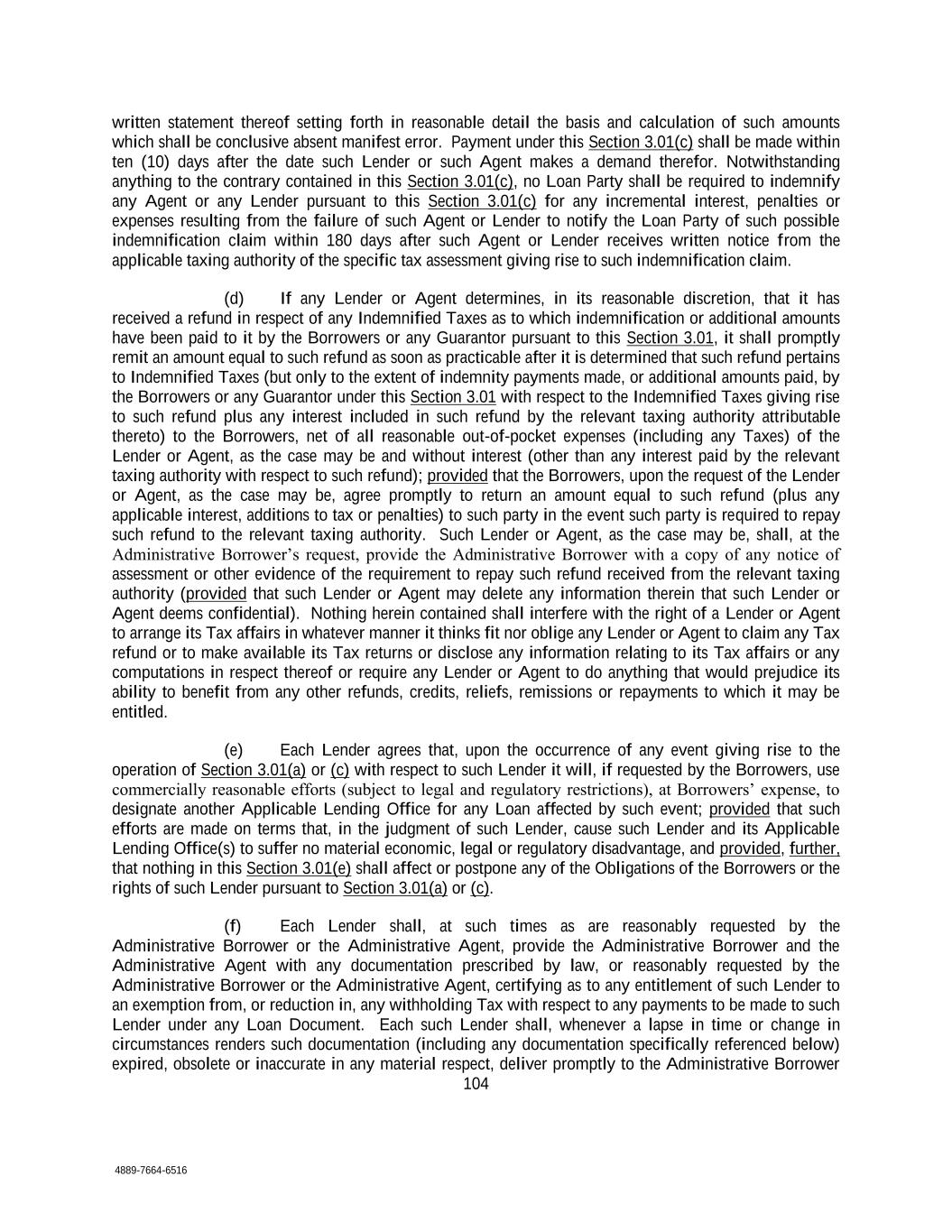 104 4889-7664-6516 written statement thereof setting forth in reasonable detail the basis and calculation of such amounts which shall be conclusive absent manifest error. Payment under this Section 3.01(c) shall be made within ten (10) days after the date such Lender or such Agent makes a demand therefor. Notwithstanding anything to the contrary contained in this Section 3.01(c), no Loan Party shall be required to indemnify any Agent or any Lender pursuant to this Section 3.01(c) for any incremental interest, penalties or expenses resulting from the failure of such Agent or Lender to notify the Loan Party of such possible indemnification claim within 180 days after such Agent or Lender receives written notice from the applicable taxing authority of the specific tax assessment giving rise to such indemnification claim. (d) If any Lender or Agent determines, in its reasonable discretion, that it has received a refund in respect of any Indemnified Taxes as to which indemnification or additional amounts have been paid to it by the Borrowers or any Guarantor pursuant to this Section 3.01, it shall promptly remit an amount equal to such refund as soon as practicable after it is determined that such refund pertains to Indemnified Taxes (but only to the extent of indemnity payments made, or additional amounts paid, by the Borrowers or any Guarantor under this Section 3.01 with respect to the Indemnified Taxes giving rise to such refund plus any interest included in such refund by the relevant taxing authority attributable thereto) to the Borrowers, net of all reasonable out-of-pocket expenses (including any Taxes) of the Lender or Agent, as the case may be and without interest (other than any interest paid by the relevant taxing authority with respect to such refund); provided that the Borrowers, upon the request of the Lender or Agent, as the case may be, agree promptly to return an amount equal to such refund (plus any applicable interest, additions to tax or penalties) to such party in the event such party is required to repay such refund to the relevant taxing authority. Such Lender or Agent, as the case may be, shall, at the Administrative Borrower’s request, provide the Administrative Borrower with a copy of any notice of assessment or other evidence of the requirement to repay such refund received from the relevant taxing authority (provided that such Lender or Agent may delete any information therein that such Lender or Agent deems confidential). Nothing herein contained shall interfere with the right of a Lender or Agent to arrange its Tax affairs in whatever manner it thinks fit nor oblige any Lender or Agent to claim any Tax refund or to make available its Tax returns or disclose any information relating to its Tax affairs or any computations in respect thereof or require any Lender or Agent to do anything that would prejudice its ability to benefit from any other refunds, credits, reliefs, remissions or repayments to which it may be entitled. (e) Each Lender agrees that, upon the occurrence of any event giving rise to the operation of Section 3.01(a) or (c) with respect to such Lender it will, if requested by the Borrowers, use commercially reasonable efforts (subject to legal and regulatory restrictions), at Borrowers’ expense, to designate another Applicable Lending Office for any Loan affected by such event; provided that such efforts are made on terms that, in the judgment of such Lender, cause such Lender and its Applicable Lending Office(s) to suffer no material economic, legal or regulatory disadvantage, and provided, further, that nothing in this Section 3.01(e) shall affect or postpone any of the Obligations of the Borrowers or the rights of such Lender pursuant to Section 3.01(a) or (c). (f) Each Lender shall, at such times as are reasonably requested by the Administrative Borrower or the Administrative Agent, provide the Administrative Borrower and the Administrative Agent with any documentation prescribed by law, or reasonably requested by the Administrative Borrower or the Administrative Agent, certifying as to any entitlement of such Lender to an exemption from, or reduction in, any withholding Tax with respect to any payments to be made to such Lender under any Loan Document. Each such Lender shall, whenever a lapse in time or change in circumstances renders such documentation (including any documentation specifically referenced below) expired, obsolete or inaccurate in any material respect, deliver promptly to the Administrative Borrower