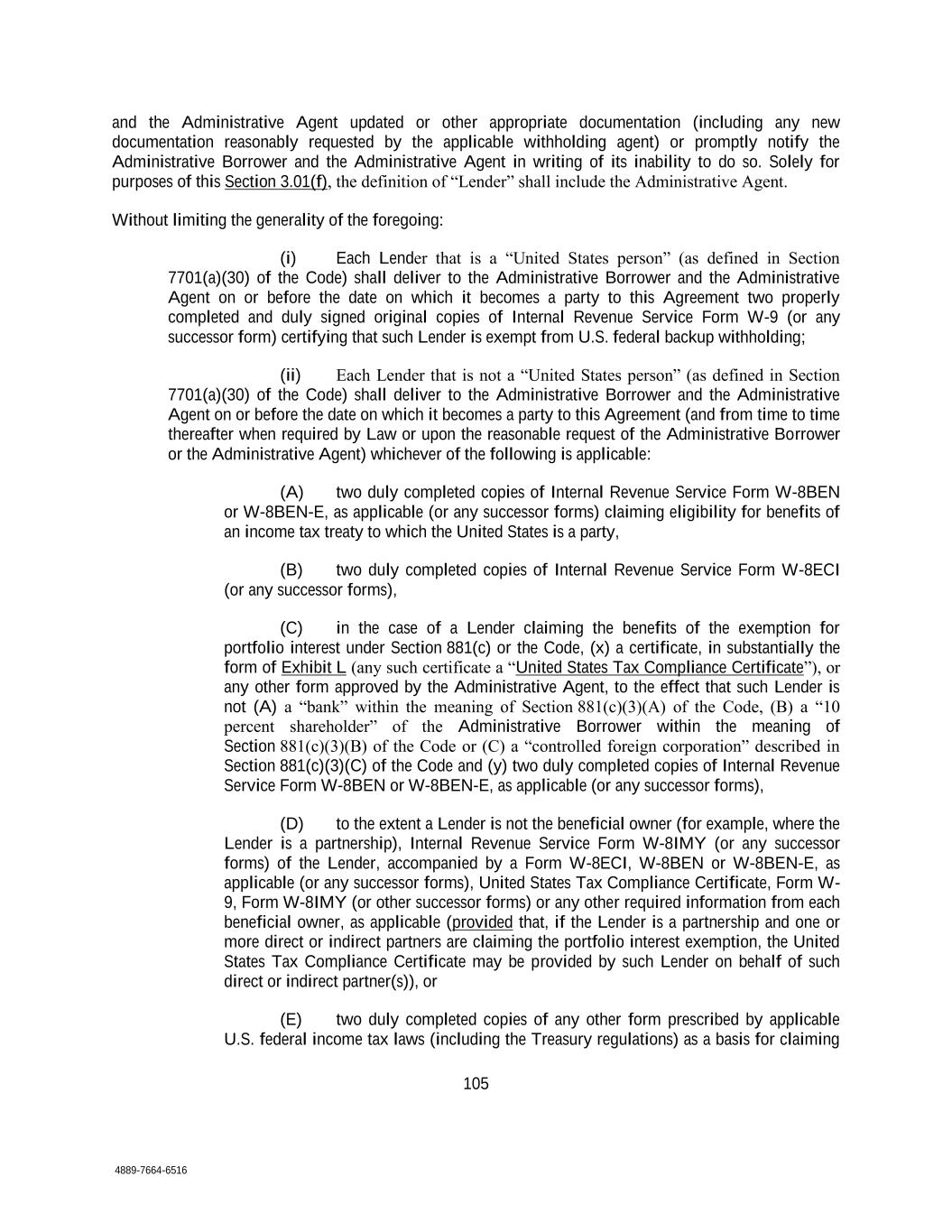 105 4889-7664-6516 and the Administrative Agent updated or other appropriate documentation (including any new documentation reasonably requested by the applicable withholding agent) or promptly notify the Administrative Borrower and the Administrative Agent in writing of its inability to do so. Solely for purposes of this Section 3.01(f), the definition of “Lender” shall include the Administrative Agent. Without limiting the generality of the foregoing: (i) Each Lender that is a “United States person” (as defined in Section 7701(a)(30) of the Code) shall deliver to the Administrative Borrower and the Administrative Agent on or before the date on which it becomes a party to this Agreement two properly completed and duly signed original copies of Internal Revenue Service Form W-9 (or any successor form) certifying that such Lender is exempt from U.S. federal backup withholding; (ii) Each Lender that is not a “United States person” (as defined in Section 7701(a)(30) of the Code) shall deliver to the Administrative Borrower and the Administrative Agent on or before the date on which it becomes a party to this Agreement (and from time to time thereafter when required by Law or upon the reasonable request of the Administrative Borrower or the Administrative Agent) whichever of the following is applicable: (A) two duly completed copies of Internal Revenue Service Form W-8BEN or W-8BEN-E, as applicable (or any successor forms) claiming eligibility for benefits of an income tax treaty to which the United States is a party, (B) two duly completed copies of Internal Revenue Service Form W-8ECI (or any successor forms), (C) in the case of a Lender claiming the benefits of the exemption for portfolio interest under Section 881(c) or the Code, (x) a certificate, in substantially the form of Exhibit L (any such certificate a “United States Tax Compliance Certificate”), or any other form approved by the Administrative Agent, to the effect that such Lender is not (A) a “bank” within the meaning of Section 881(c)(3)(A) of the Code, (B) a “10 percent shareholder” of the Administrative Borrower within the meaning of Section 881(c)(3)(B) of the Code or (C) a “controlled foreign corporation” described in Section 881(c)(3)(C) of the Code and (y) two duly completed copies of Internal Revenue Service Form W-8BEN or W-8BEN-E, as applicable (or any successor forms), (D) to the extent a Lender is not the beneficial owner (for example, where the Lender is a partnership), Internal Revenue Service Form W-8IMY (or any successor forms) of the Lender, accompanied by a Form W-8ECI, W-8BEN or W-8BEN-E, as applicable (or any successor forms), United States Tax Compliance Certificate, Form W- 9, Form W-8IMY (or other successor forms) or any other required information from each beneficial owner, as applicable (provided that, if the Lender is a partnership and one or more direct or indirect partners are claiming the portfolio interest exemption, the United States Tax Compliance Certificate may be provided by such Lender on behalf of such direct or indirect partner(s)), or (E) two duly completed copies of any other form prescribed by applicable U.S. federal income tax laws (including the Treasury regulations) as a basis for claiming