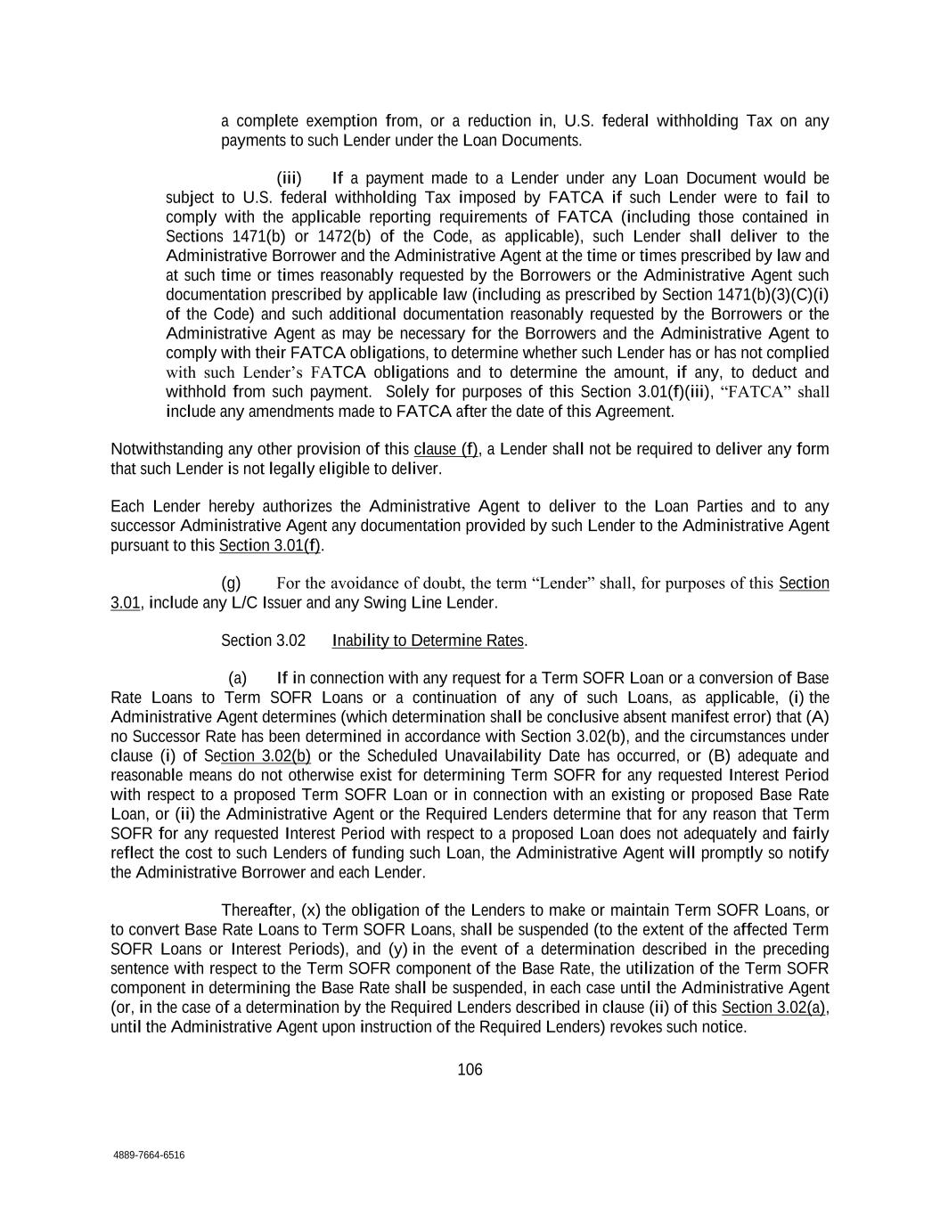106 4889-7664-6516 a complete exemption from, or a reduction in, U.S. federal withholding Tax on any payments to such Lender under the Loan Documents. (iii) If a payment made to a Lender under any Loan Document would be subject to U.S. federal withholding Tax imposed by FATCA if such Lender were to fail to comply with the applicable reporting requirements of FATCA (including those contained in Sections 1471(b) or 1472(b) of the Code, as applicable), such Lender shall deliver to the Administrative Borrower and the Administrative Agent at the time or times prescribed by law and at such time or times reasonably requested by the Borrowers or the Administrative Agent such documentation prescribed by applicable law (including as prescribed by Section 1471(b)(3)(C)(i) of the Code) and such additional documentation reasonably requested by the Borrowers or the Administrative Agent as may be necessary for the Borrowers and the Administrative Agent to comply with their FATCA obligations, to determine whether such Lender has or has not complied with such Lender’s FATCA obligations and to determine the amount, if any, to deduct and withhold from such payment. Solely for purposes of this Section 3.01(f)(iii), “FATCA” shall include any amendments made to FATCA after the date of this Agreement. Notwithstanding any other provision of this clause (f), a Lender shall not be required to deliver any form that such Lender is not legally eligible to deliver. Each Lender hereby authorizes the Administrative Agent to deliver to the Loan Parties and to any successor Administrative Agent any documentation provided by such Lender to the Administrative Agent pursuant to this Section 3.01(f). (g) For the avoidance of doubt, the term “Lender” shall, for purposes of this Section 3.01, include any L/C Issuer and any Swing Line Lender. Section 3.02 Inability to Determine Rates. (a) If in connection with any request for a Term SOFR Loan or a conversion of Base Rate Loans to Term SOFR Loans or a continuation of any of such Loans, as applicable, (i) the Administrative Agent determines (which determination shall be conclusive absent manifest error) that (A) no Successor Rate has been determined in accordance with Section 3.02(b), and the circumstances under clause (i) of Section 3.02(b) or the Scheduled Unavailability Date has occurred, or (B) adequate and reasonable means do not otherwise exist for determining Term SOFR for any requested Interest Period with respect to a proposed Term SOFR Loan or in connection with an existing or proposed Base Rate Loan, or (ii) the Administrative Agent or the Required Lenders determine that for any reason that Term SOFR for any requested Interest Period with respect to a proposed Loan does not adequately and fairly reflect the cost to such Lenders of funding such Loan, the Administrative Agent will promptly so notify the Administrative Borrower and each Lender. Thereafter, (x) the obligation of the Lenders to make or maintain Term SOFR Loans, or to convert Base Rate Loans to Term SOFR Loans, shall be suspended (to the extent of the affected Term SOFR Loans or Interest Periods), and (y) in the event of a determination described in the preceding sentence with respect to the Term SOFR component of the Base Rate, the utilization of the Term SOFR component in determining the Base Rate shall be suspended, in each case until the Administrative Agent (or, in the case of a determination by the Required Lenders described in clause (ii) of this Section 3.02(a), until the Administrative Agent upon instruction of the Required Lenders) revokes such notice.