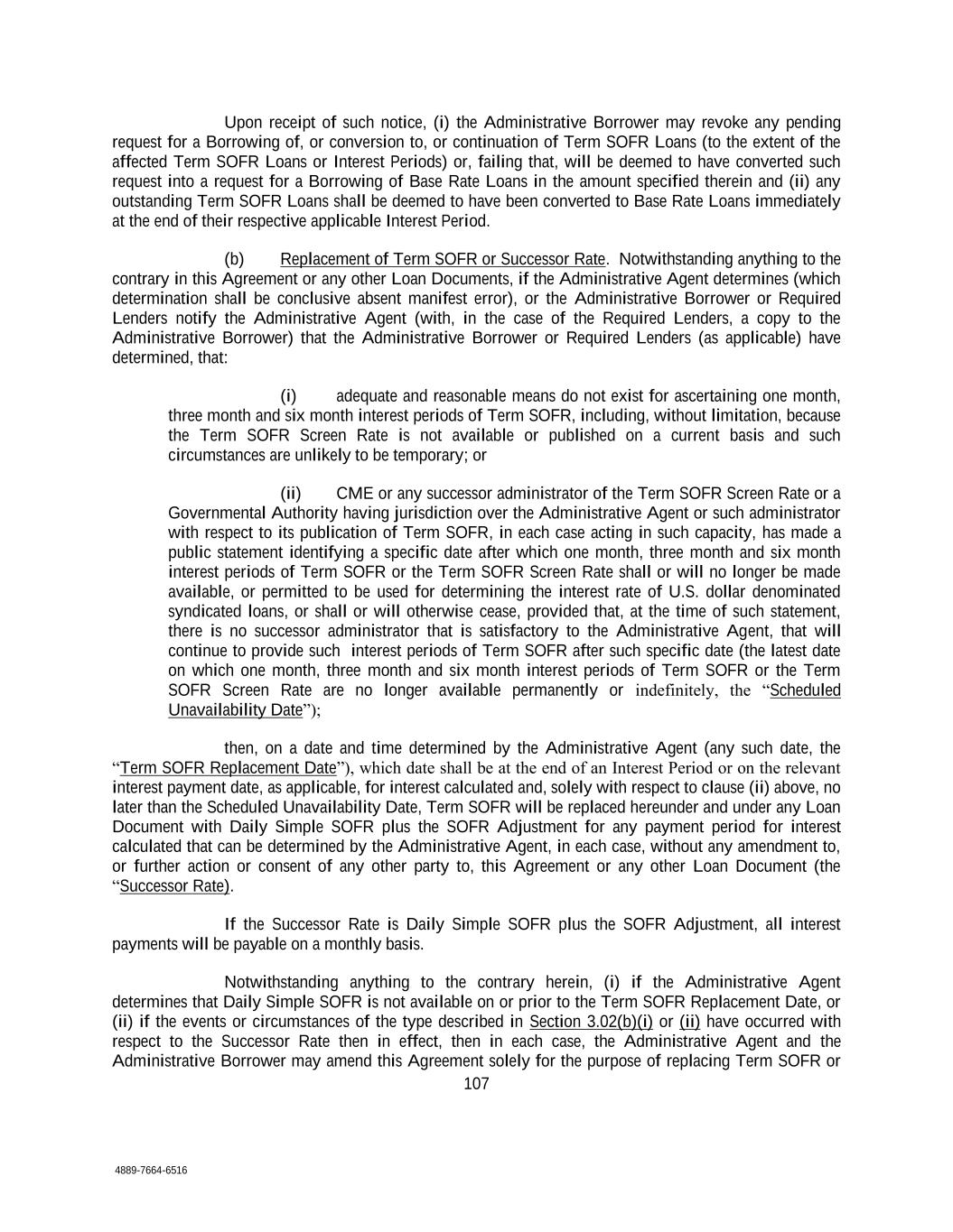 107 4889-7664-6516 Upon receipt of such notice, (i) the Administrative Borrower may revoke any pending request for a Borrowing of, or conversion to, or continuation of Term SOFR Loans (to the extent of the affected Term SOFR Loans or Interest Periods) or, failing that, will be deemed to have converted such request into a request for a Borrowing of Base Rate Loans in the amount specified therein and (ii) any outstanding Term SOFR Loans shall be deemed to have been converted to Base Rate Loans immediately at the end of their respective applicable Interest Period. (b) Replacement of Term SOFR or Successor Rate. Notwithstanding anything to the contrary in this Agreement or any other Loan Documents, if the Administrative Agent determines (which determination shall be conclusive absent manifest error), or the Administrative Borrower or Required Lenders notify the Administrative Agent (with, in the case of the Required Lenders, a copy to the Administrative Borrower) that the Administrative Borrower or Required Lenders (as applicable) have determined, that: (i) adequate and reasonable means do not exist for ascertaining one month, three month and six month interest periods of Term SOFR, including, without limitation, because the Term SOFR Screen Rate is not available or published on a current basis and such circumstances are unlikely to be temporary; or (ii) CME or any successor administrator of the Term SOFR Screen Rate or a Governmental Authority having jurisdiction over the Administrative Agent or such administrator with respect to its publication of Term SOFR, in each case acting in such capacity, has made a public statement identifying a specific date after which one month, three month and six month interest periods of Term SOFR or the Term SOFR Screen Rate shall or will no longer be made available, or permitted to be used for determining the interest rate of U.S. dollar denominated syndicated loans, or shall or will otherwise cease, provided that, at the time of such statement, there is no successor administrator that is satisfactory to the Administrative Agent, that will continue to provide such interest periods of Term SOFR after such specific date (the latest date on which one month, three month and six month interest periods of Term SOFR or the Term SOFR Screen Rate are no longer available permanently or indefinitely, the “Scheduled Unavailability Date”); then, on a date and time determined by the Administrative Agent (any such date, the “Term SOFR Replacement Date”), which date shall be at the end of an Interest Period or on the relevant interest payment date, as applicable, for interest calculated and, solely with respect to clause (ii) above, no later than the Scheduled Unavailability Date, Term SOFR will be replaced hereunder and under any Loan Document with Daily Simple SOFR plus the SOFR Adjustment for any payment period for interest calculated that can be determined by the Administrative Agent, in each case, without any amendment to, or further action or consent of any other party to, this Agreement or any other Loan Document (the “Successor Rate). If the Successor Rate is Daily Simple SOFR plus the SOFR Adjustment, all interest payments will be payable on a monthly basis. Notwithstanding anything to the contrary herein, (i) if the Administrative Agent determines that Daily Simple SOFR is not available on or prior to the Term SOFR Replacement Date, or (ii) if the events or circumstances of the type described in Section 3.02(b)(i) or (ii) have occurred with respect to the Successor Rate then in effect, then in each case, the Administrative Agent and the Administrative Borrower may amend this Agreement solely for the purpose of replacing Term SOFR or