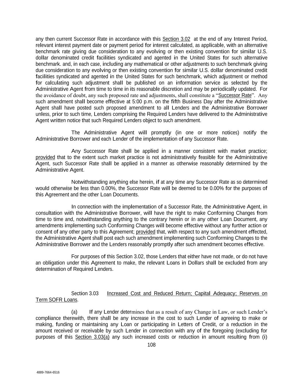 108 4889-7664-6516 any then current Successor Rate in accordance with this Section 3.02 at the end of any Interest Period, relevant interest payment date or payment period for interest calculated, as applicable, with an alternative benchmark rate giving due consideration to any evolving or then existing convention for similar U.S. dollar denominated credit facilities syndicated and agented in the United States for such alternative benchmark. and, in each case, including any mathematical or other adjustments to such benchmark giving due consideration to any evolving or then existing convention for similar U.S. dollar denominated credit facilities syndicated and agented in the United States for such benchmark, which adjustment or method for calculating such adjustment shall be published on an information service as selected by the Administrative Agent from time to time in its reasonable discretion and may be periodically updated. For the avoidance of doubt, any such proposed rate and adjustments, shall constitute a “Successor Rate”. Any such amendment shall become effective at 5:00 p.m. on the fifth Business Day after the Administrative Agent shall have posted such proposed amendment to all Lenders and the Administrative Borrower unless, prior to such time, Lenders comprising the Required Lenders have delivered to the Administrative Agent written notice that such Required Lenders object to such amendment. The Administrative Agent will promptly (in one or more notices) notify the Administrative Borrower and each Lender of the implementation of any Successor Rate. Any Successor Rate shall be applied in a manner consistent with market practice; provided that to the extent such market practice is not administratively feasible for the Administrative Agent, such Successor Rate shall be applied in a manner as otherwise reasonably determined by the Administrative Agent. Notwithstanding anything else herein, if at any time any Successor Rate as so determined would otherwise be less than 0.00%, the Successor Rate will be deemed to be 0.00% for the purposes of this Agreement and the other Loan Documents. In connection with the implementation of a Successor Rate, the Administrative Agent, in consultation with the Administrative Borrower, will have the right to make Conforming Changes from time to time and, notwithstanding anything to the contrary herein or in any other Loan Document, any amendments implementing such Conforming Changes will become effective without any further action or consent of any other party to this Agreement; provided that, with respect to any such amendment effected, the Administrative Agent shall post each such amendment implementing such Conforming Changes to the Administrative Borrower and the Lenders reasonably promptly after such amendment becomes effective. For purposes of this Section 3.02, those Lenders that either have not made, or do not have an obligation under this Agreement to make, the relevant Loans in Dollars shall be excluded from any determination of Required Lenders. Section 3.03 Increased Cost and Reduced Return; Capital Adequacy; Reserves on Term SOFR Loans. (a) If any Lender determines that as a result of any Change in Law, or such Lender’s compliance therewith, there shall be any increase in the cost to such Lender of agreeing to make or making, funding or maintaining any Loan or participating in Letters of Credit, or a reduction in the amount received or receivable by such Lender in connection with any of the foregoing (excluding for purposes of this Section 3.03(a) any such increased costs or reduction in amount resulting from (i)