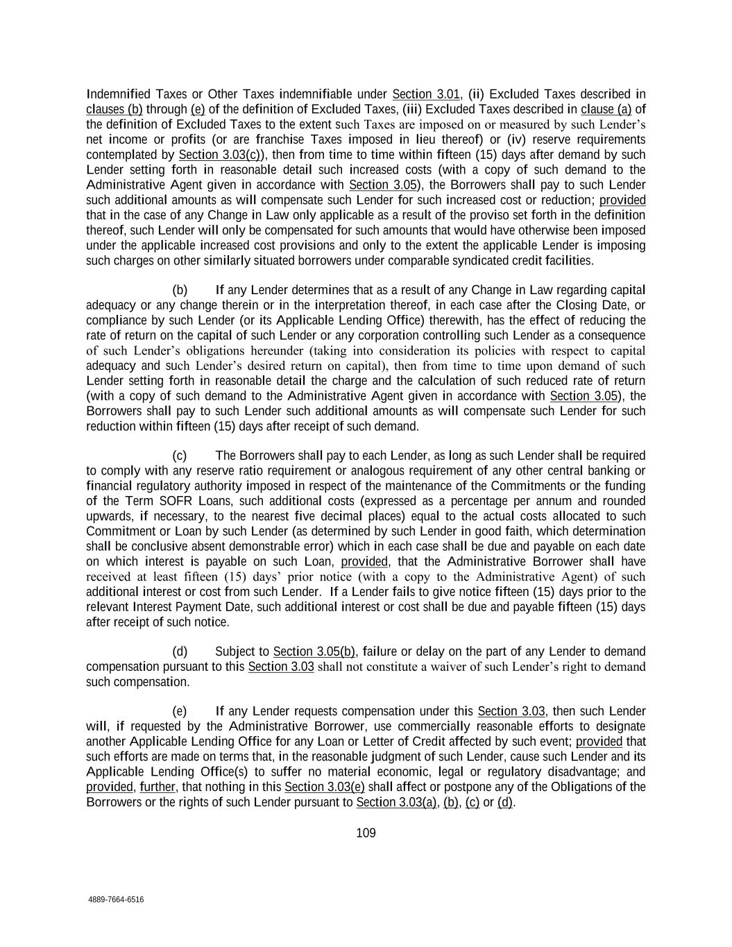 109 4889-7664-6516 Indemnified Taxes or Other Taxes indemnifiable under Section 3.01, (ii) Excluded Taxes described in clauses (b) through (e) of the definition of Excluded Taxes, (iii) Excluded Taxes described in clause (a) of the definition of Excluded Taxes to the extent such Taxes are imposed on or measured by such Lender’s net income or profits (or are franchise Taxes imposed in lieu thereof) or (iv) reserve requirements contemplated by Section 3.03(c)), then from time to time within fifteen (15) days after demand by such Lender setting forth in reasonable detail such increased costs (with a copy of such demand to the Administrative Agent given in accordance with Section 3.05), the Borrowers shall pay to such Lender such additional amounts as will compensate such Lender for such increased cost or reduction; provided that in the case of any Change in Law only applicable as a result of the proviso set forth in the definition thereof, such Lender will only be compensated for such amounts that would have otherwise been imposed under the applicable increased cost provisions and only to the extent the applicable Lender is imposing such charges on other similarly situated borrowers under comparable syndicated credit facilities. (b) If any Lender determines that as a result of any Change in Law regarding capital adequacy or any change therein or in the interpretation thereof, in each case after the Closing Date, or compliance by such Lender (or its Applicable Lending Office) therewith, has the effect of reducing the rate of return on the capital of such Lender or any corporation controlling such Lender as a consequence of such Lender’s obligations hereunder (taking into consideration its policies with respect to capital adequacy and such Lender’s desired return on capital), then from time to time upon demand of such Lender setting forth in reasonable detail the charge and the calculation of such reduced rate of return (with a copy of such demand to the Administrative Agent given in accordance with Section 3.05), the Borrowers shall pay to such Lender such additional amounts as will compensate such Lender for such reduction within fifteen (15) days after receipt of such demand. (c) The Borrowers shall pay to each Lender, as long as such Lender shall be required to comply with any reserve ratio requirement or analogous requirement of any other central banking or financial regulatory authority imposed in respect of the maintenance of the Commitments or the funding of the Term SOFR Loans, such additional costs (expressed as a percentage per annum and rounded upwards, if necessary, to the nearest five decimal places) equal to the actual costs allocated to such Commitment or Loan by such Lender (as determined by such Lender in good faith, which determination shall be conclusive absent demonstrable error) which in each case shall be due and payable on each date on which interest is payable on such Loan, provided, that the Administrative Borrower shall have received at least fifteen (15) days’ prior notice (with a copy to the Administrative Agent) of such additional interest or cost from such Lender. If a Lender fails to give notice fifteen (15) days prior to the relevant Interest Payment Date, such additional interest or cost shall be due and payable fifteen (15) days after receipt of such notice. (d) Subject to Section 3.05(b), failure or delay on the part of any Lender to demand compensation pursuant to this Section 3.03 shall not constitute a waiver of such Lender’s right to demand such compensation. (e) If any Lender requests compensation under this Section 3.03, then such Lender will, if requested by the Administrative Borrower, use commercially reasonable efforts to designate another Applicable Lending Office for any Loan or Letter of Credit affected by such event; provided that such efforts are made on terms that, in the reasonable judgment of such Lender, cause such Lender and its Applicable Lending Office(s) to suffer no material economic, legal or regulatory disadvantage; and provided, further, that nothing in this Section 3.03(e) shall affect or postpone any of the Obligations of the Borrowers or the rights of such Lender pursuant to Section 3.03(a), (b), (c) or (d).