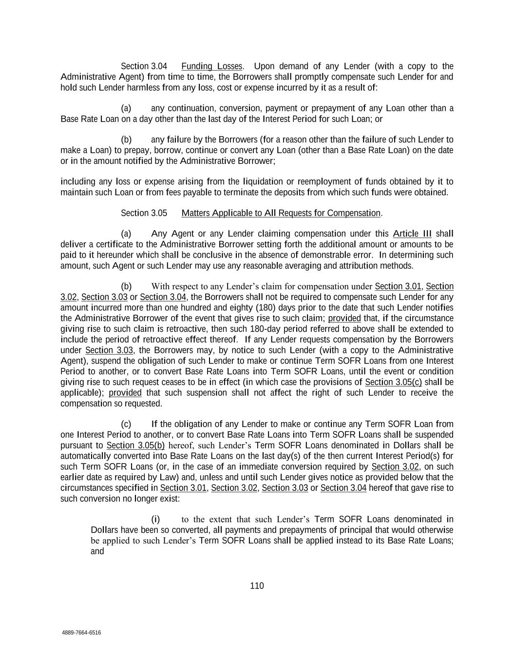 110 4889-7664-6516 Section 3.04 Funding Losses. Upon demand of any Lender (with a copy to the Administrative Agent) from time to time, the Borrowers shall promptly compensate such Lender for and hold such Lender harmless from any loss, cost or expense incurred by it as a result of: (a) any continuation, conversion, payment or prepayment of any Loan other than a Base Rate Loan on a day other than the last day of the Interest Period for such Loan; or (b) any failure by the Borrowers (for a reason other than the failure of such Lender to make a Loan) to prepay, borrow, continue or convert any Loan (other than a Base Rate Loan) on the date or in the amount notified by the Administrative Borrower; including any loss or expense arising from the liquidation or reemployment of funds obtained by it to maintain such Loan or from fees payable to terminate the deposits from which such funds were obtained. Section 3.05 Matters Applicable to All Requests for Compensation. (a) Any Agent or any Lender claiming compensation under this Article III shall deliver a certificate to the Administrative Borrower setting forth the additional amount or amounts to be paid to it hereunder which shall be conclusive in the absence of demonstrable error. In determining such amount, such Agent or such Lender may use any reasonable averaging and attribution methods. (b) With respect to any Lender’s claim for compensation under Section 3.01, Section 3.02, Section 3.03 or Section 3.04, the Borrowers shall not be required to compensate such Lender for any amount incurred more than one hundred and eighty (180) days prior to the date that such Lender notifies the Administrative Borrower of the event that gives rise to such claim; provided that, if the circumstance giving rise to such claim is retroactive, then such 180-day period referred to above shall be extended to include the period of retroactive effect thereof. If any Lender requests compensation by the Borrowers under Section 3.03, the Borrowers may, by notice to such Lender (with a copy to the Administrative Agent), suspend the obligation of such Lender to make or continue Term SOFR Loans from one Interest Period to another, or to convert Base Rate Loans into Term SOFR Loans, until the event or condition giving rise to such request ceases to be in effect (in which case the provisions of Section 3.05(c) shall be applicable); provided that such suspension shall not affect the right of such Lender to receive the compensation so requested. (c) If the obligation of any Lender to make or continue any Term SOFR Loan from one Interest Period to another, or to convert Base Rate Loans into Term SOFR Loans shall be suspended pursuant to Section 3.05(b) hereof, such Lender’s Term SOFR Loans denominated in Dollars shall be automatically converted into Base Rate Loans on the last day(s) of the then current Interest Period(s) for such Term SOFR Loans (or, in the case of an immediate conversion required by Section 3.02, on such earlier date as required by Law) and, unless and until such Lender gives notice as provided below that the circumstances specified in Section 3.01, Section 3.02, Section 3.03 or Section 3.04 hereof that gave rise to such conversion no longer exist: (i) to the extent that such Lender’s Term SOFR Loans denominated in Dollars have been so converted, all payments and prepayments of principal that would otherwise be applied to such Lender’s Term SOFR Loans shall be applied instead to its Base Rate Loans; and
