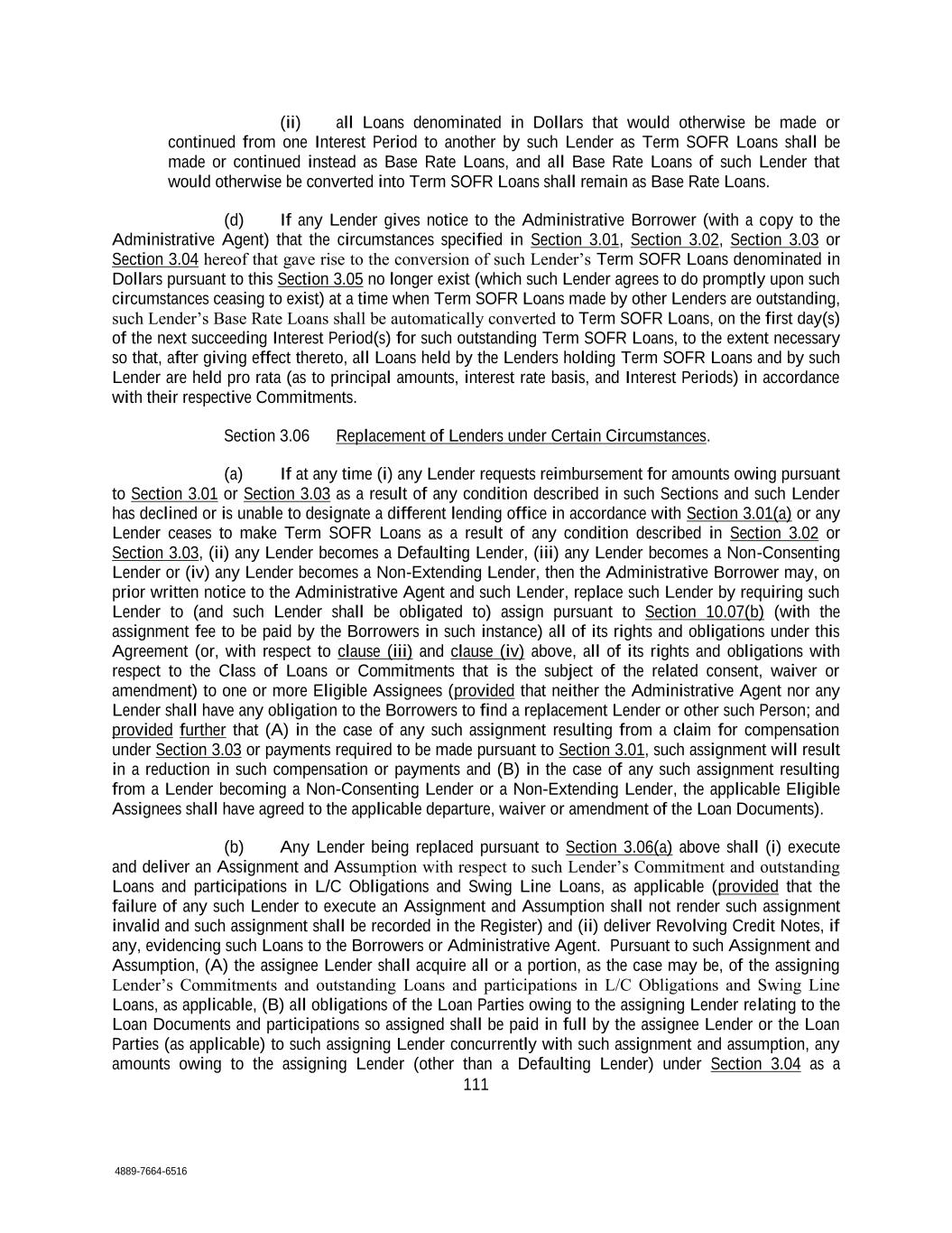111 4889-7664-6516 (ii) all Loans denominated in Dollars that would otherwise be made or continued from one Interest Period to another by such Lender as Term SOFR Loans shall be made or continued instead as Base Rate Loans, and all Base Rate Loans of such Lender that would otherwise be converted into Term SOFR Loans shall remain as Base Rate Loans. (d) If any Lender gives notice to the Administrative Borrower (with a copy to the Administrative Agent) that the circumstances specified in Section 3.01, Section 3.02, Section 3.03 or Section 3.04 hereof that gave rise to the conversion of such Lender’s Term SOFR Loans denominated in Dollars pursuant to this Section 3.05 no longer exist (which such Lender agrees to do promptly upon such circumstances ceasing to exist) at a time when Term SOFR Loans made by other Lenders are outstanding, such Lender’s Base Rate Loans shall be automatically converted to Term SOFR Loans, on the first day(s) of the next succeeding Interest Period(s) for such outstanding Term SOFR Loans, to the extent necessary so that, after giving effect thereto, all Loans held by the Lenders holding Term SOFR Loans and by such Lender are held pro rata (as to principal amounts, interest rate basis, and Interest Periods) in accordance with their respective Commitments. Section 3.06 Replacement of Lenders under Certain Circumstances. (a) If at any time (i) any Lender requests reimbursement for amounts owing pursuant to Section 3.01 or Section 3.03 as a result of any condition described in such Sections and such Lender has declined or is unable to designate a different lending office in accordance with Section 3.01(a) or any Lender ceases to make Term SOFR Loans as a result of any condition described in Section 3.02 or Section 3.03, (ii) any Lender becomes a Defaulting Lender, (iii) any Lender becomes a Non-Consenting Lender or (iv) any Lender becomes a Non-Extending Lender, then the Administrative Borrower may, on prior written notice to the Administrative Agent and such Lender, replace such Lender by requiring such Lender to (and such Lender shall be obligated to) assign pursuant to Section 10.07(b) (with the assignment fee to be paid by the Borrowers in such instance) all of its rights and obligations under this Agreement (or, with respect to clause (iii) and clause (iv) above, all of its rights and obligations with respect to the Class of Loans or Commitments that is the subject of the related consent, waiver or amendment) to one or more Eligible Assignees (provided that neither the Administrative Agent nor any Lender shall have any obligation to the Borrowers to find a replacement Lender or other such Person; and provided further that (A) in the case of any such assignment resulting from a claim for compensation under Section 3.03 or payments required to be made pursuant to Section 3.01, such assignment will result in a reduction in such compensation or payments and (B) in the case of any such assignment resulting from a Lender becoming a Non-Consenting Lender or a Non-Extending Lender, the applicable Eligible Assignees shall have agreed to the applicable departure, waiver or amendment of the Loan Documents). (b) Any Lender being replaced pursuant to Section 3.06(a) above shall (i) execute and deliver an Assignment and Assumption with respect to such Lender’s Commitment and outstanding Loans and participations in L/C Obligations and Swing Line Loans, as applicable (provided that the failure of any such Lender to execute an Assignment and Assumption shall not render such assignment invalid and such assignment shall be recorded in the Register) and (ii) deliver Revolving Credit Notes, if any, evidencing such Loans to the Borrowers or Administrative Agent. Pursuant to such Assignment and Assumption, (A) the assignee Lender shall acquire all or a portion, as the case may be, of the assigning Lender’s Commitments and outstanding Loans and participations in L/C Obligations and Swing Line Loans, as applicable, (B) all obligations of the Loan Parties owing to the assigning Lender relating to the Loan Documents and participations so assigned shall be paid in full by the assignee Lender or the Loan Parties (as applicable) to such assigning Lender concurrently with such assignment and assumption, any amounts owing to the assigning Lender (other than a Defaulting Lender) under Section 3.04 as a