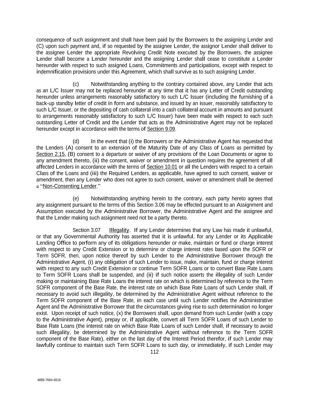 112 4889-7664-6516 consequence of such assignment and shall have been paid by the Borrowers to the assigning Lender and (C) upon such payment and, if so requested by the assignee Lender, the assignor Lender shall deliver to the assignee Lender the appropriate Revolving Credit Note executed by the Borrowers, the assignee Lender shall become a Lender hereunder and the assigning Lender shall cease to constitute a Lender hereunder with respect to such assigned Loans, Commitments and participations, except with respect to indemnification provisions under this Agreement, which shall survive as to such assigning Lender. (c) Notwithstanding anything to the contrary contained above, any Lender that acts as an L/C Issuer may not be replaced hereunder at any time that it has any Letter of Credit outstanding hereunder unless arrangements reasonably satisfactory to such L/C Issuer (including the furnishing of a back-up standby letter of credit in form and substance, and issued by an issuer, reasonably satisfactory to such L/C Issuer, or the depositing of cash collateral into a cash collateral account in amounts and pursuant to arrangements reasonably satisfactory to such L/C Issuer) have been made with respect to each such outstanding Letter of Credit and the Lender that acts as the Administrative Agent may not be replaced hereunder except in accordance with the terms of Section 9.09. (d) In the event that (i) the Borrowers or the Administrative Agent has requested that the Lenders (A) consent to an extension of the Maturity Date of any Class of Loans as permitted by Section 2.15, (B) consent to a departure or waiver of any provisions of the Loan Documents or agree to any amendment thereto, (ii) the consent, waiver or amendment in question requires the agreement of all affected Lenders in accordance with the terms of Section 10.01 or all the Lenders with respect to a certain Class of the Loans and (iii) the Required Lenders, as applicable, have agreed to such consent, waiver or amendment, then any Lender who does not agree to such consent, waiver or amendment shall be deemed a “Non-Consenting Lender.” (e) Notwithstanding anything herein to the contrary, each party hereto agrees that any assignment pursuant to the terms of this Section 3.06 may be effected pursuant to an Assignment and Assumption executed by the Administrative Borrower, the Administrative Agent and the assignee and that the Lender making such assignment need not be a party thereto. Section 3.07 Illegality. If any Lender determines that any Law has made it unlawful, or that any Governmental Authority has asserted that it is unlawful, for any Lender or its Applicable Lending Office to perform any of its obligations hereunder or make, maintain or fund or charge interest with respect to any Credit Extension or to determine or charge interest rates based upon the SOFR or Term SOFR, then, upon notice thereof by such Lender to the Administrative Borrower through the Administrative Agent, (i) any obligation of such Lender to issue, make, maintain, fund or charge interest with respect to any such Credit Extension or continue Term SOFR Loans or to convert Base Rate Loans to Term SOFR Loans shall be suspended, and (ii) if such notice asserts the illegality of such Lender making or maintaining Base Rate Loans the interest rate on which is determined by reference to the Term SOFR component of the Base Rate, the interest rate on which Base Rate Loans of such Lender shall, if necessary to avoid such illegality, be determined by the Administrative Agent without reference to the Term SOFR component of the Base Rate, in each case until such Lender notifies the Administrative Agent and the Administrative Borrower that the circumstances giving rise to such determination no longer exist. Upon receipt of such notice, (x) the Borrowers shall, upon demand from such Lender (with a copy to the Administrative Agent), prepay or, if applicable, convert all Term SOFR Loans of such Lender to Base Rate Loans (the interest rate on which Base Rate Loans of such Lender shall, if necessary to avoid such illegality, be determined by the Administrative Agent without reference to the Term SOFR component of the Base Rate), either on the last day of the Interest Period therefor, if such Lender may lawfully continue to maintain such Term SOFR Loans to such day, or immediately, if such Lender may
