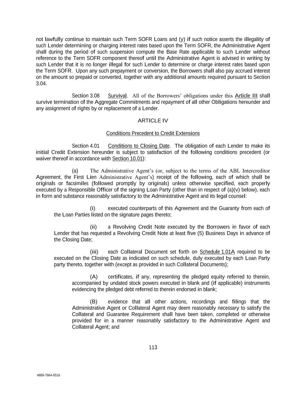 113 4889-7664-6516 not lawfully continue to maintain such Term SOFR Loans and (y) if such notice asserts the illegality of such Lender determining or charging interest rates based upon the Term SOFR, the Administrative Agent shall during the period of such suspension compute the Base Rate applicable to such Lender without reference to the Term SOFR component thereof until the Administrative Agent is advised in writing by such Lender that it is no longer illegal for such Lender to determine or charge interest rates based upon the Term SOFR. Upon any such prepayment or conversion, the Borrowers shall also pay accrued interest on the amount so prepaid or converted, together with any additional amounts required pursuant to Section 3.04. Section 3.08 Survival. All of the Borrowers’ obligations under this Article III shall survive termination of the Aggregate Commitments and repayment of all other Obligations hereunder and any assignment of rights by or replacement of a Lender. ARTICLE IV Conditions Precedent to Credit Extensions Section 4.01 Conditions to Closing Date. The obligation of each Lender to make its initial Credit Extension hereunder is subject to satisfaction of the following conditions precedent (or waiver thereof in accordance with Section 10.01): (a) The Administrative Agent’s (or, subject to the terms of the ABL Intercreditor Agreement, the First Lien Administrative Agent’s) receipt of the following, each of which shall be originals or facsimiles (followed promptly by originals) unless otherwise specified, each properly executed by a Responsible Officer of the signing Loan Party (other than in respect of (a)(v) below), each in form and substance reasonably satisfactory to the Administrative Agent and its legal counsel: (i) executed counterparts of this Agreement and the Guaranty from each of the Loan Parties listed on the signature pages thereto; (ii) a Revolving Credit Note executed by the Borrowers in favor of each Lender that has requested a Revolving Credit Note at least five (5) Business Days in advance of the Closing Date; (iii) each Collateral Document set forth on Schedule 1.01A required to be executed on the Closing Date as indicated on such schedule, duly executed by each Loan Party party thereto, together with (except as provided in such Collateral Documents); (A) certificates, if any, representing the pledged equity referred to therein, accompanied by undated stock powers executed in blank and (if applicable) instruments evidencing the pledged debt referred to therein endorsed in blank; (B) evidence that all other actions, recordings and filings that the Administrative Agent or Collateral Agent may deem reasonably necessary to satisfy the Collateral and Guarantee Requirement shall have been taken, completed or otherwise provided for in a manner reasonably satisfactory to the Administrative Agent and Collateral Agent; and