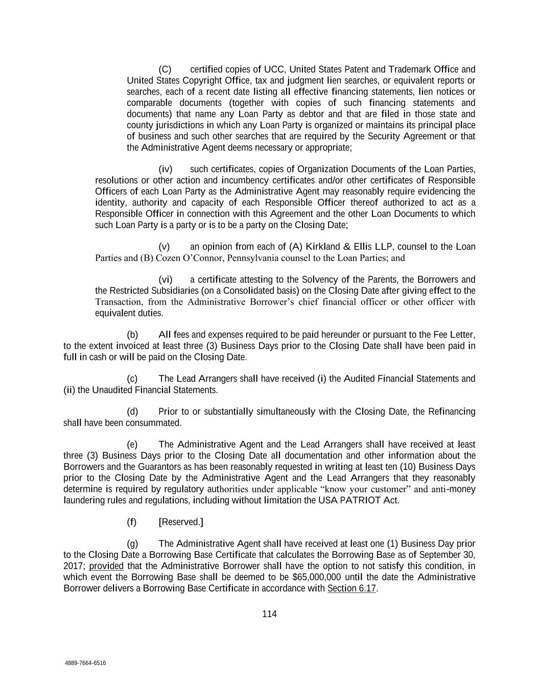 114 4889-7664-6516 (C) certified copies of UCC, United States Patent and Trademark Office and United States Copyright Office, tax and judgment lien searches, or equivalent reports or searches, each of a recent date listing all effective financing statements, lien notices or comparable documents (together with copies of such financing statements and documents) that name any Loan Party as debtor and that are filed in those state and county jurisdictions in which any Loan Party is organized or maintains its principal place of business and such other searches that are required by the Security Agreement or that the Administrative Agent deems necessary or appropriate; (iv) such certificates, copies of Organization Documents of the Loan Parties, resolutions or other action and incumbency certificates and/or other certificates of Responsible Officers of each Loan Party as the Administrative Agent may reasonably require evidencing the identity, authority and capacity of each Responsible Officer thereof authorized to act as a Responsible Officer in connection with this Agreement and the other Loan Documents to which such Loan Party is a party or is to be a party on the Closing Date; (v) an opinion from each of (A) Kirkland & Ellis LLP, counsel to the Loan Parties and (B) Cozen O’Connor, Pennsylvania counsel to the Loan Parties; and (vi) a certificate attesting to the Solvency of the Parents, the Borrowers and the Restricted Subsidiaries (on a Consolidated basis) on the Closing Date after giving effect to the Transaction, from the Administrative Borrower’s chief financial officer or other officer with equivalent duties. (b) All fees and expenses required to be paid hereunder or pursuant to the Fee Letter, to the extent invoiced at least three (3) Business Days prior to the Closing Date shall have been paid in full in cash or will be paid on the Closing Date. (c) The Lead Arrangers shall have received (i) the Audited Financial Statements and (ii) the Unaudited Financial Statements. (d) Prior to or substantially simultaneously with the Closing Date, the Refinancing shall have been consummated. (e) The Administrative Agent and the Lead Arrangers shall have received at least three (3) Business Days prior to the Closing Date all documentation and other information about the Borrowers and the Guarantors as has been reasonably requested in writing at least ten (10) Business Days prior to the Closing Date by the Administrative Agent and the Lead Arrangers that they reasonably determine is required by regulatory authorities under applicable “know your customer” and anti-money laundering rules and regulations, including without limitation the USA PATRIOT Act. (f) [Reserved.] (g) The Administrative Agent shall have received at least one (1) Business Day prior to the Closing Date a Borrowing Base Certificate that calculates the Borrowing Base as of September 30, 2017; provided that the Administrative Borrower shall have the option to not satisfy this condition, in which event the Borrowing Base shall be deemed to be $65,000,000 until the date the Administrative Borrower delivers a Borrowing Base Certificate in accordance with Section 6.17.