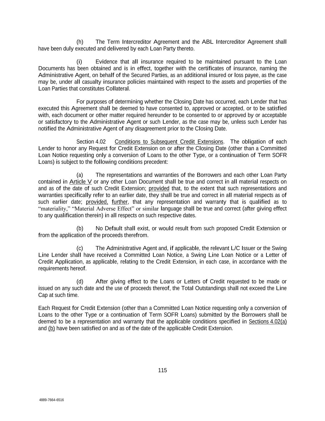 115 4889-7664-6516 (h) The Term Intercreditor Agreement and the ABL Intercreditor Agreement shall have been duly executed and delivered by each Loan Party thereto. (i) Evidence that all insurance required to be maintained pursuant to the Loan Documents has been obtained and is in effect, together with the certificates of insurance, naming the Administrative Agent, on behalf of the Secured Parties, as an additional insured or loss payee, as the case may be, under all casualty insurance policies maintained with respect to the assets and properties of the Loan Parties that constitutes Collateral. For purposes of determining whether the Closing Date has occurred, each Lender that has executed this Agreement shall be deemed to have consented to, approved or accepted, or to be satisfied with, each document or other matter required hereunder to be consented to or approved by or acceptable or satisfactory to the Administrative Agent or such Lender, as the case may be, unless such Lender has notified the Administrative Agent of any disagreement prior to the Closing Date. Section 4.02 Conditions to Subsequent Credit Extensions. The obligation of each Lender to honor any Request for Credit Extension on or after the Closing Date (other than a Committed Loan Notice requesting only a conversion of Loans to the other Type, or a continuation of Term SOFR Loans) is subject to the following conditions precedent: (a) The representations and warranties of the Borrowers and each other Loan Party contained in Article V or any other Loan Document shall be true and correct in all material respects on and as of the date of such Credit Extension; provided that, to the extent that such representations and warranties specifically refer to an earlier date, they shall be true and correct in all material respects as of such earlier date; provided, further, that any representation and warranty that is qualified as to “materiality,” “Material Adverse Effect” or similar language shall be true and correct (after giving effect to any qualification therein) in all respects on such respective dates. (b) No Default shall exist, or would result from such proposed Credit Extension or from the application of the proceeds therefrom. (c) The Administrative Agent and, if applicable, the relevant L/C Issuer or the Swing Line Lender shall have received a Committed Loan Notice, a Swing Line Loan Notice or a Letter of Credit Application, as applicable, relating to the Credit Extension, in each case, in accordance with the requirements hereof. (d) After giving effect to the Loans or Letters of Credit requested to be made or issued on any such date and the use of proceeds thereof, the Total Outstandings shall not exceed the Line Cap at such time. Each Request for Credit Extension (other than a Committed Loan Notice requesting only a conversion of Loans to the other Type or a continuation of Term SOFR Loans) submitted by the Borrowers shall be deemed to be a representation and warranty that the applicable conditions specified in Sections 4.02(a) and (b) have been satisfied on and as of the date of the applicable Credit Extension.