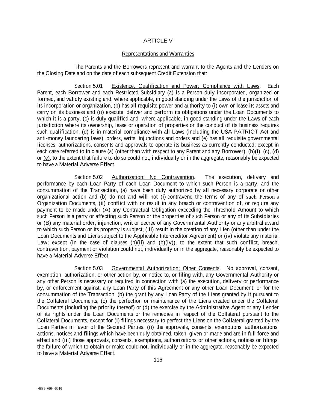 116 4889-7664-6516 ARTICLE V Representations and Warranties The Parents and the Borrowers represent and warrant to the Agents and the Lenders on the Closing Date and on the date of each subsequent Credit Extension that: Section 5.01 Existence, Qualification and Power; Compliance with Laws. Each Parent, each Borrower and each Restricted Subsidiary (a) is a Person duly incorporated, organized or formed, and validly existing and, where applicable, in good standing under the Laws of the jurisdiction of its incorporation or organization, (b) has all requisite power and authority to (i) own or lease its assets and carry on its business and (ii) execute, deliver and perform its obligations under the Loan Documents to which it is a party, (c) is duly qualified and, where applicable, in good standing under the Laws of each jurisdiction where its ownership, lease or operation of properties or the conduct of its business requires such qualification, (d) is in material compliance with all Laws (including the USA PATRIOT Act and anti-money laundering laws), orders, writs, injunctions and orders and (e) has all requisite governmental licenses, authorizations, consents and approvals to operate its business as currently conducted; except in each case referred to in clause (a) (other than with respect to any Parent and any Borrower), (b)(i), (c), (d) or (e), to the extent that failure to do so could not, individually or in the aggregate, reasonably be expected to have a Material Adverse Effect. Section 5.02 Authorization; No Contravention. The execution, delivery and performance by each Loan Party of each Loan Document to which such Person is a party, and the consummation of the Transaction, (a) have been duly authorized by all necessary corporate or other organizational action and (b) do not and will not (i) contravene the terms of any of such Person’s Organization Documents, (ii) conflict with or result in any breach or contravention of, or require any payment to be made under (A) any Contractual Obligation exceeding the Threshold Amount to which such Person is a party or affecting such Person or the properties of such Person or any of its Subsidiaries or (B) any material order, injunction, writ or decree of any Governmental Authority or any arbitral award to which such Person or its property is subject, (iii) result in the creation of any Lien (other than under the Loan Documents and Liens subject to the Applicable Intercreditor Agreement) or (iv) violate any material Law; except (in the case of clauses (b)(ii) and (b)(iv)), to the extent that such conflict, breach, contravention, payment or violation could not, individually or in the aggregate, reasonably be expected to have a Material Adverse Effect. Section 5.03 Governmental Authorization; Other Consents. No approval, consent, exemption, authorization, or other action by, or notice to, or filing with, any Governmental Authority or any other Person is necessary or required in connection with (a) the execution, delivery or performance by, or enforcement against, any Loan Party of this Agreement or any other Loan Document, or for the consummation of the Transaction, (b) the grant by any Loan Party of the Liens granted by it pursuant to the Collateral Documents, (c) the perfection or maintenance of the Liens created under the Collateral Documents (including the priority thereof) or (d) the exercise by the Administrative Agent or any Lender of its rights under the Loan Documents or the remedies in respect of the Collateral pursuant to the Collateral Documents, except for (i) filings necessary to perfect the Liens on the Collateral granted by the Loan Parties in favor of the Secured Parties, (ii) the approvals, consents, exemptions, authorizations, actions, notices and filings which have been duly obtained, taken, given or made and are in full force and effect and (iii) those approvals, consents, exemptions, authorizations or other actions, notices or filings, the failure of which to obtain or make could not, individually or in the aggregate, reasonably be expected to have a Material Adverse Effect.